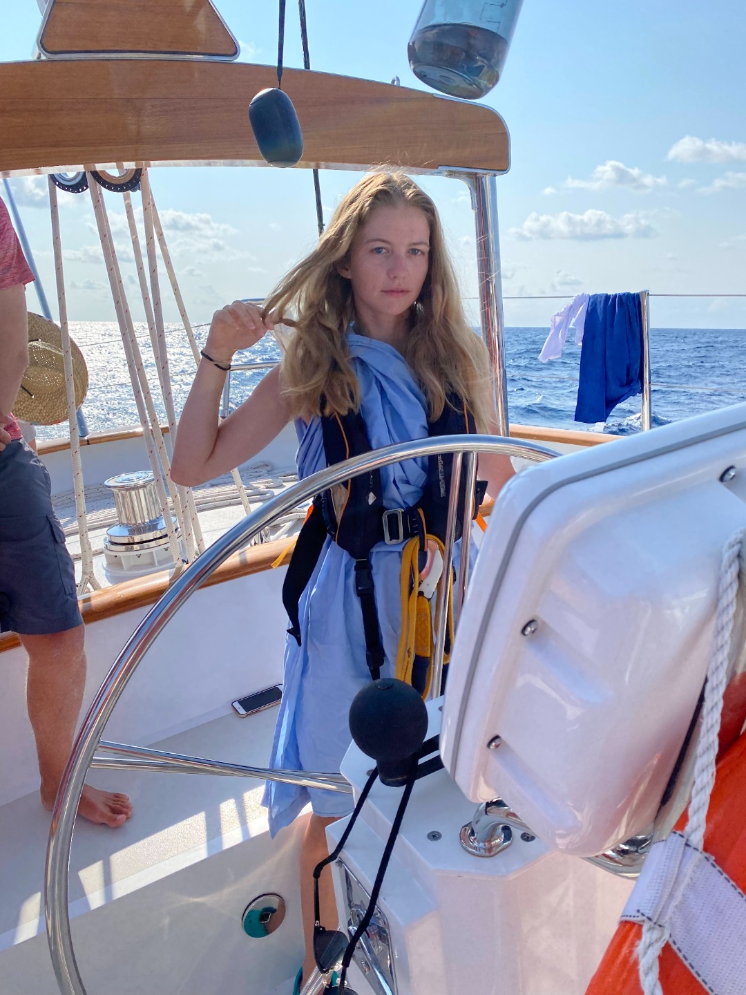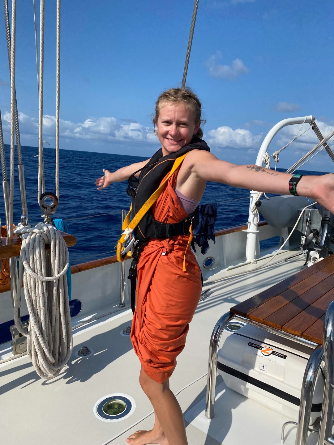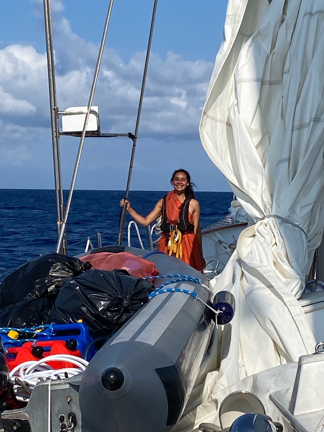 Photo 2: Toga adorned Ins aboard her elegant vessel (ignore the garbage bags in the dingy)