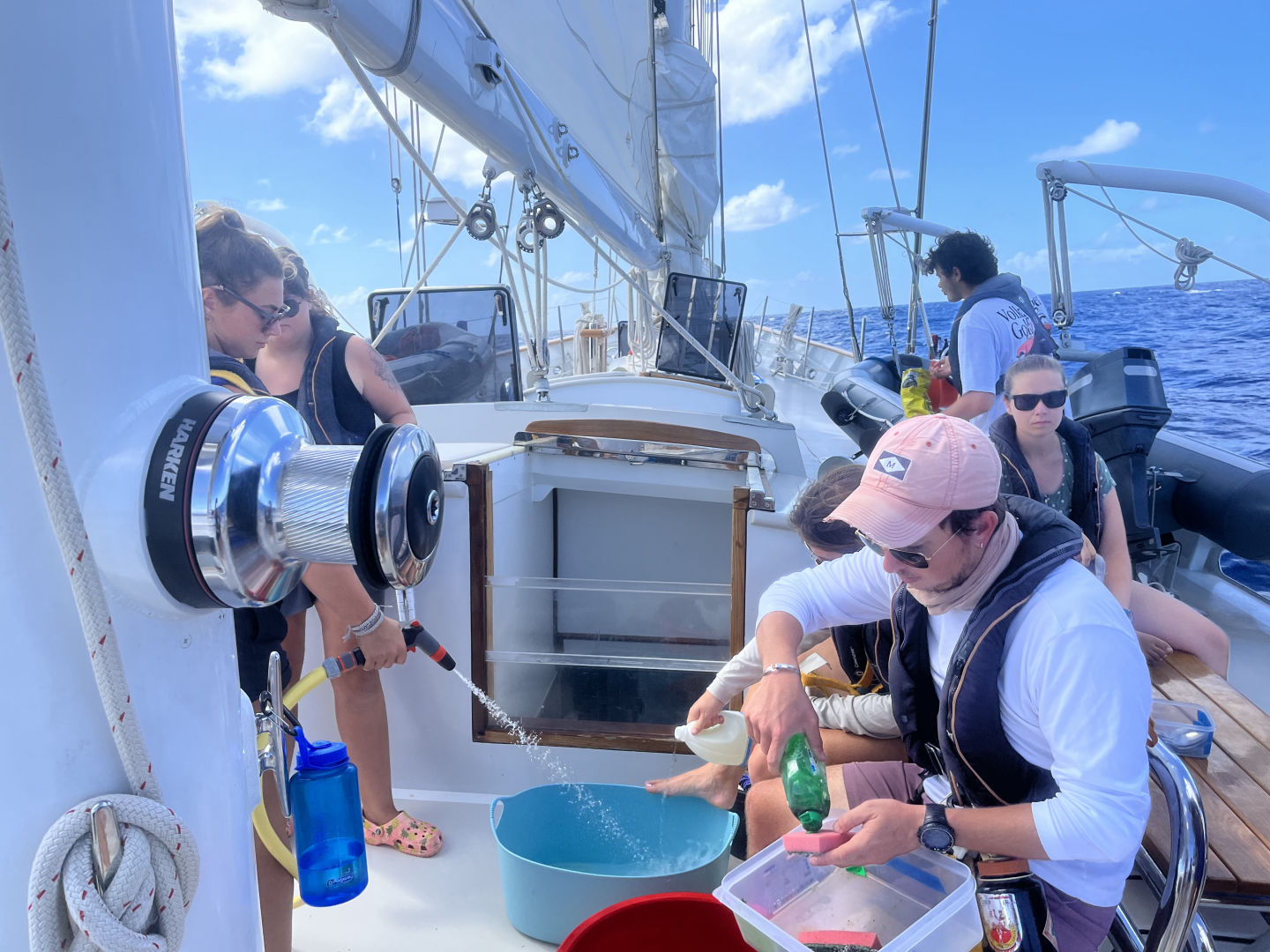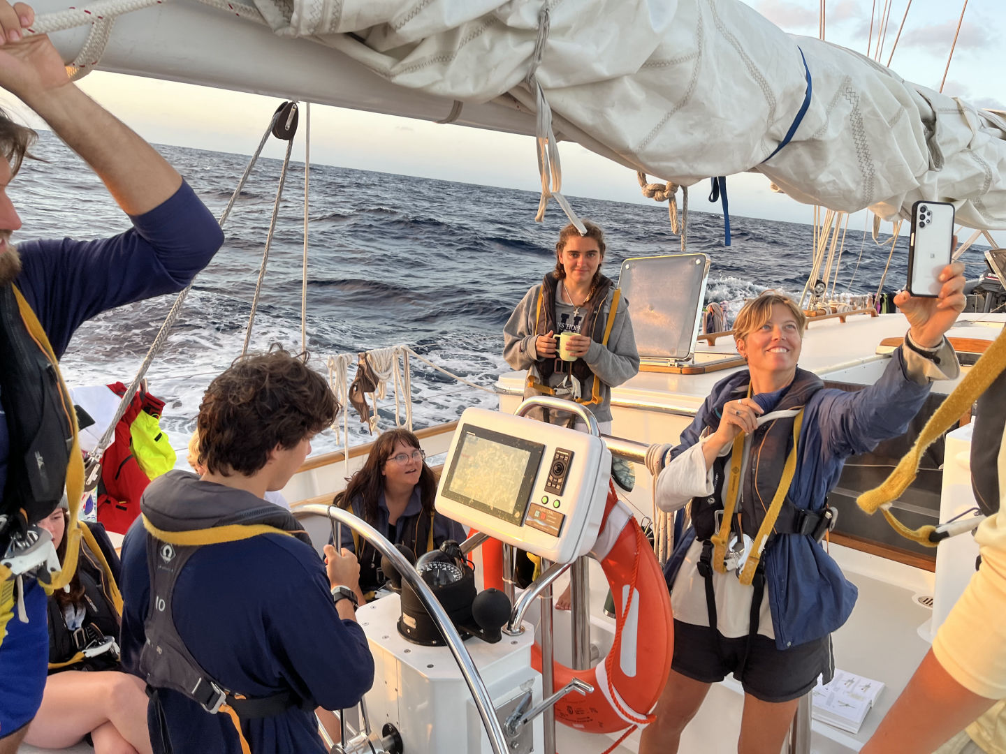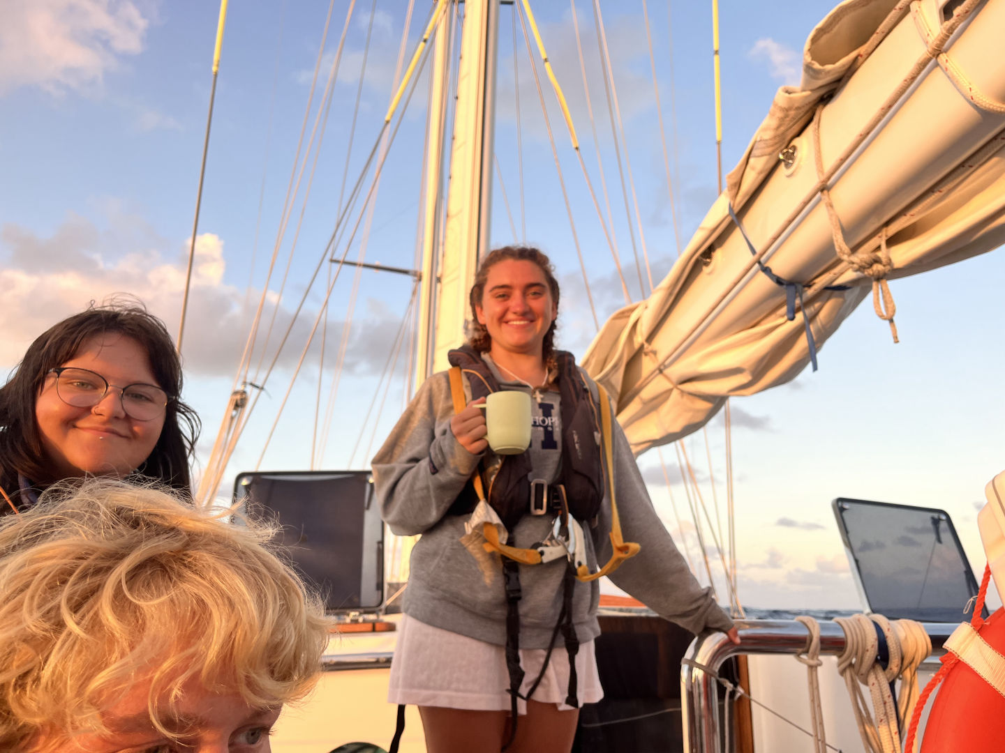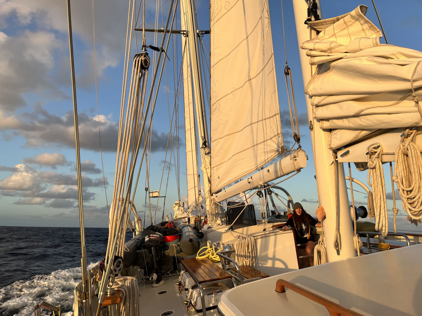 Just like every day throughout passage, the day started with watch. Today, my watch team was on the 4 to 8 watch. All three rotations have their highlights, but the 4 to 8 has to be my favorite. Having the 4 to 8 means starting the morning in the dark of night and ending with the full orb of the sun (or Forb, as Carolyn calls it). Every 4 to 8, each member of watch team 1 tries to guess the exact time that we will be able to see Forb. Sometimes, we never see the full sun because the sky is too cloudy (Izzy won that day). As the clouds covering the ocean are undescribably magnificent, this is not a bad thing in the slightest. As skipper, my task of the day was to take photos of the day. Just like my last skipper day, this quickly turned into a photo session of the watch team. We got some pretty iconic ones.