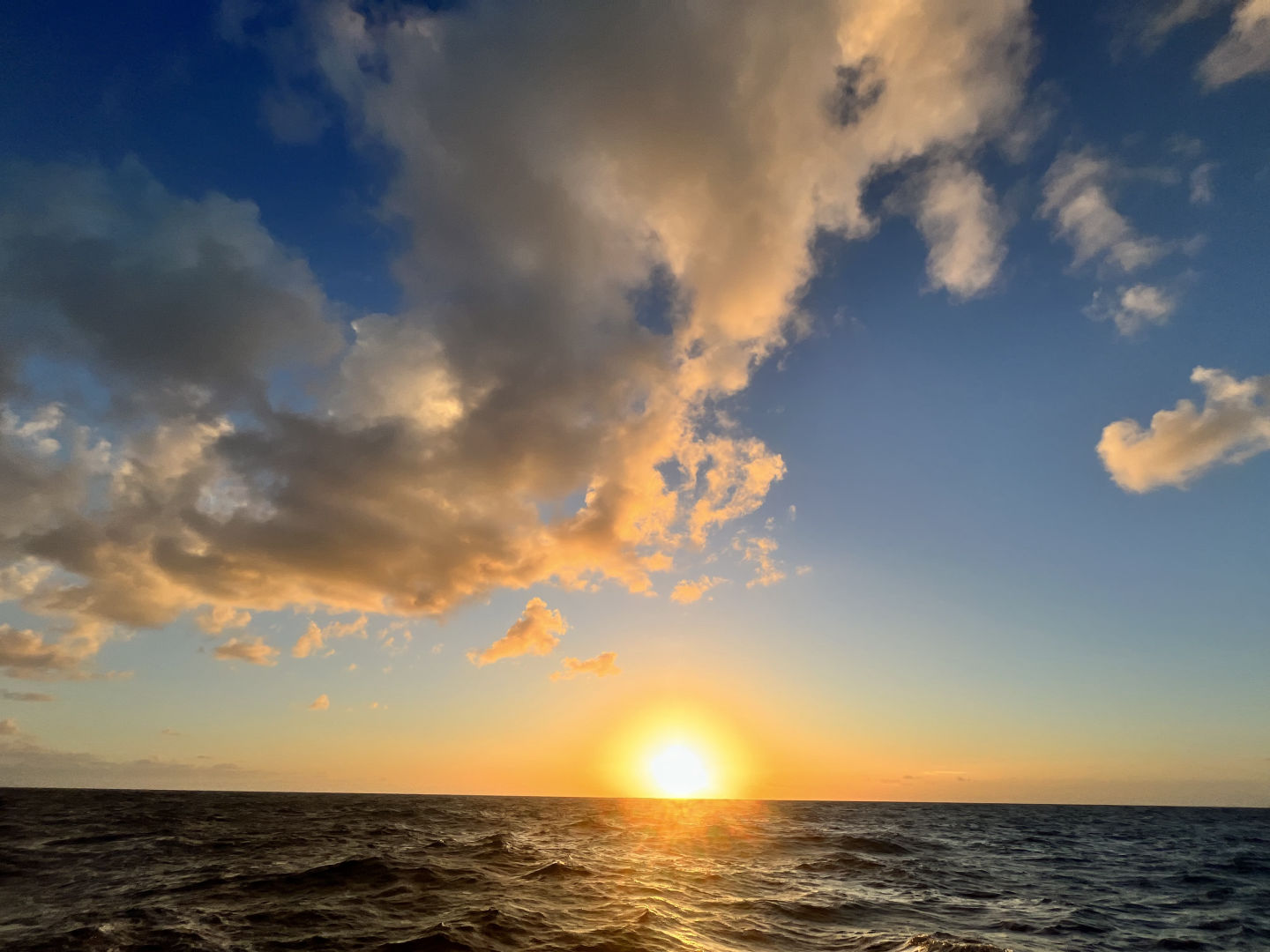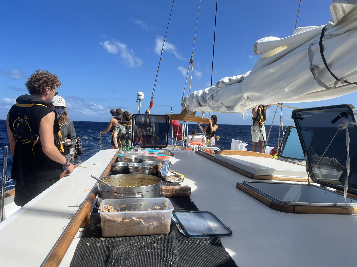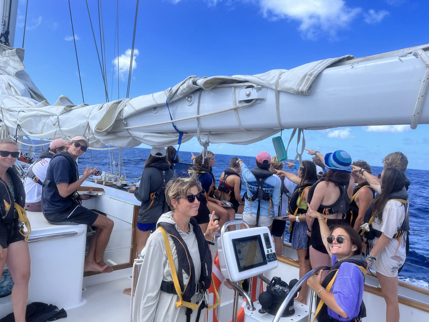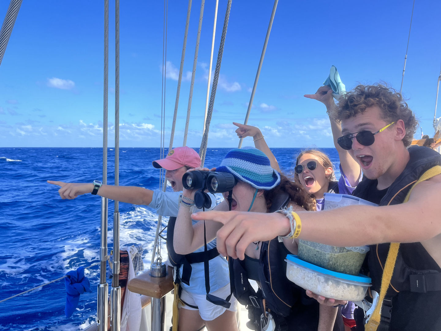 Just like every day throughout passage, the day started with watch. Today, my watch team was on the 4 to 8 watch. All three rotations have their highlights, but the 4 to 8 has to be my favorite. Having the 4 to 8 means starting the morning in the dark of night and ending with the full orb of the sun (or Forb, as Carolyn calls it). Every 4 to 8, each member of watch team 1 tries to guess the exact time that we will be able to see Forb. Sometimes, we never see the full sun because the sky is too cloudy (Izzy won that day). As the clouds covering the ocean are undescribably magnificent, this is not a bad thing in the slightest. As skipper, my task of the day was to take photos of the day. Just like my last skipper day, this quickly turned into a photo session of the watch team. We got some pretty iconic ones.