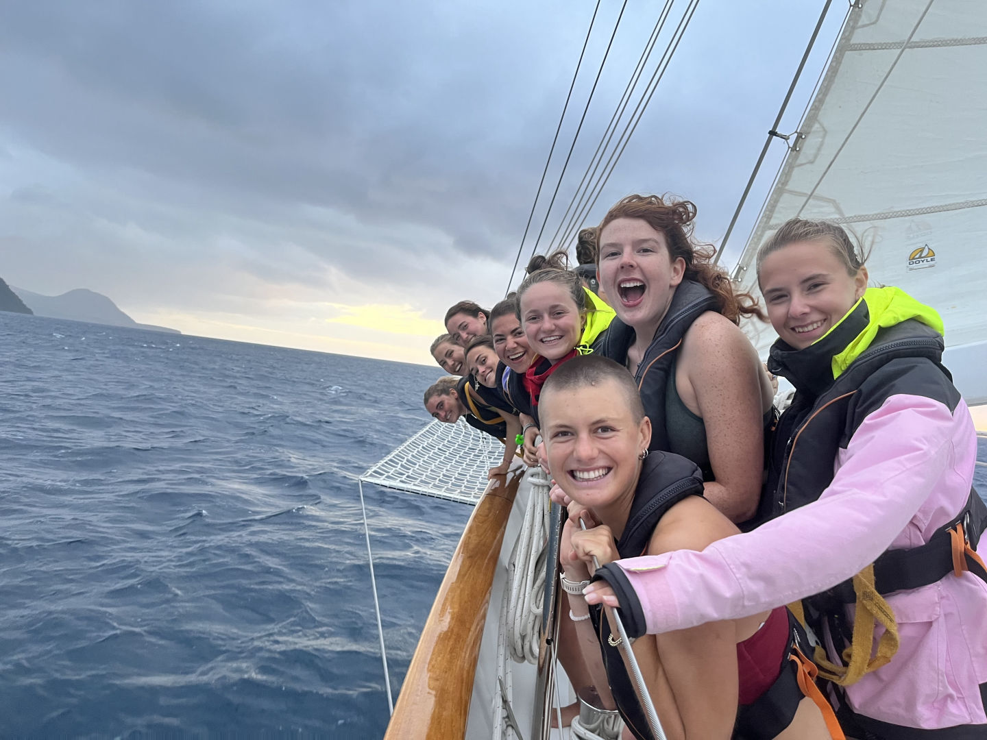 Today, Izzy was head chef!!! Along with her sous chefs, Emy and Anna, she prepared a delicious tuna salad. The thought of canned tuna was met with much skepticism, but everyone loved it in the end. Halfway into lunch (at 11:42), there were shouts of “land!” It was true!!! On the horizon, you could just barely see the peaks and divets of land. It was amazing!!!! It took some time to make it out as it was so faint, but once you did, it was such a wonderful feeling! For the last 18 days, all we could make out was the ocean, sky, and clouds. Seeing anything besides that was remarkable. With the watch cycle and everything, you very quickly get used to passage. Seeing land for the first time was like being reminded that land existed. Regardless, it was an amazing moment for everyone.