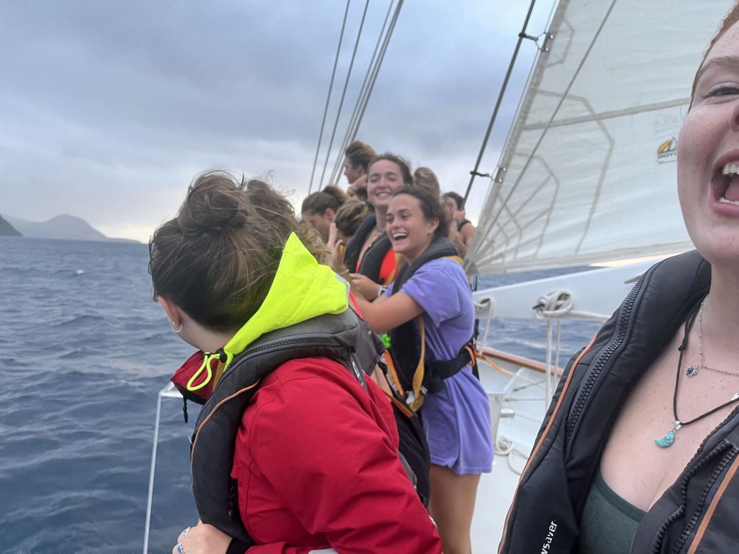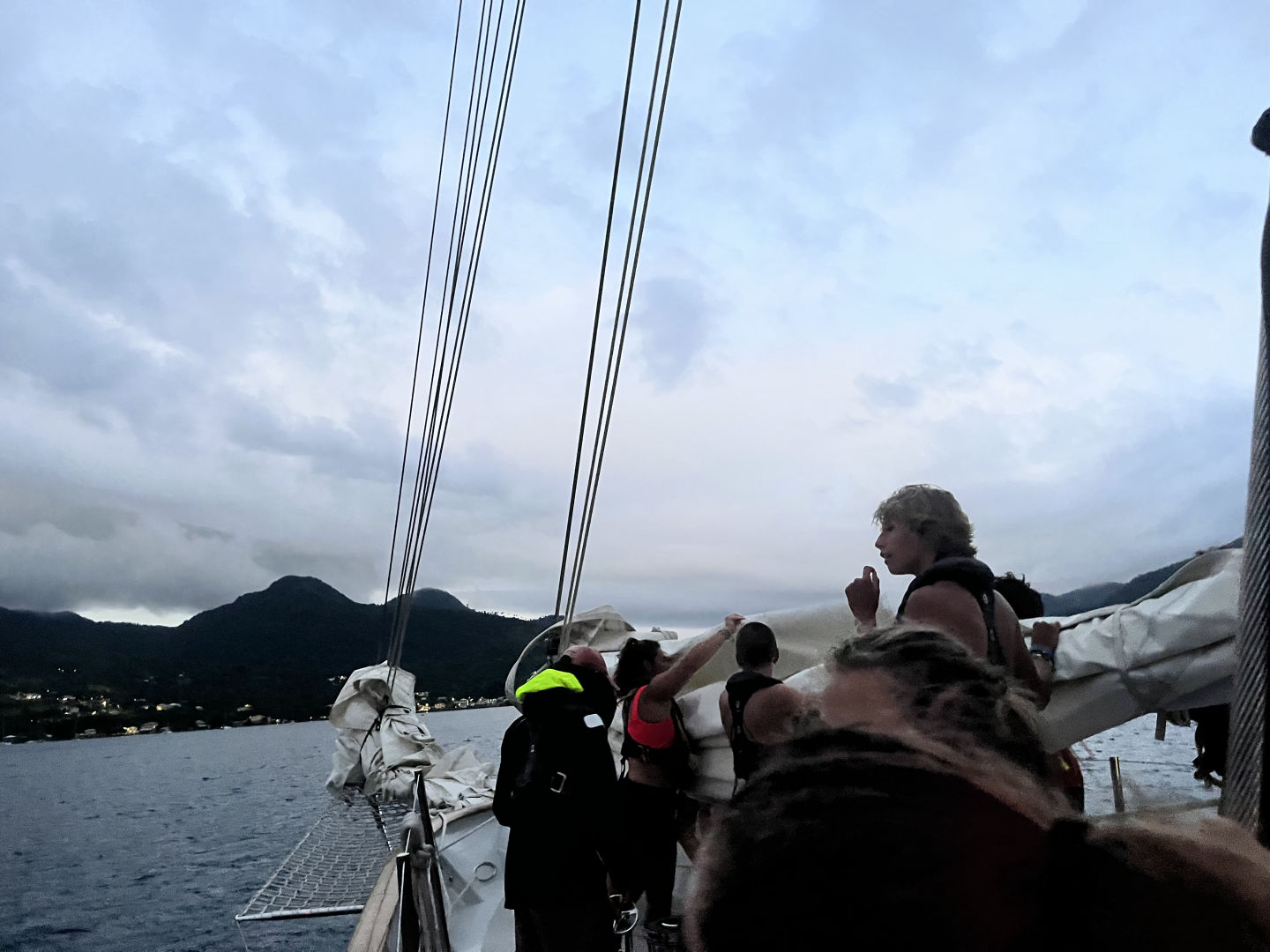 As we got closer to land, we began taking down sails and preparing to anchor as well as preparing to put the boat to bed. It was at this point that everyone came up on deck. Land got closer and closer and closer. It was raining as we pulled in, and there were a lot of perpetual clouds rimming the mountains, which added to the mystery and excitement of the new place. People were singing. People were laughing, and everyone was happy! Throughout the crossing, the staff had been promising a distinct smell of land; we didn’t believe them until today. It smelled like fire, dirt, moss, and something deeper. Anyways, it was definitely noticeable, and I regret the skeptics.