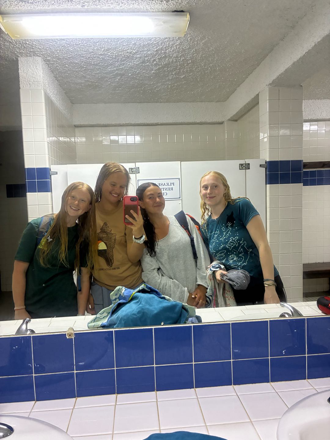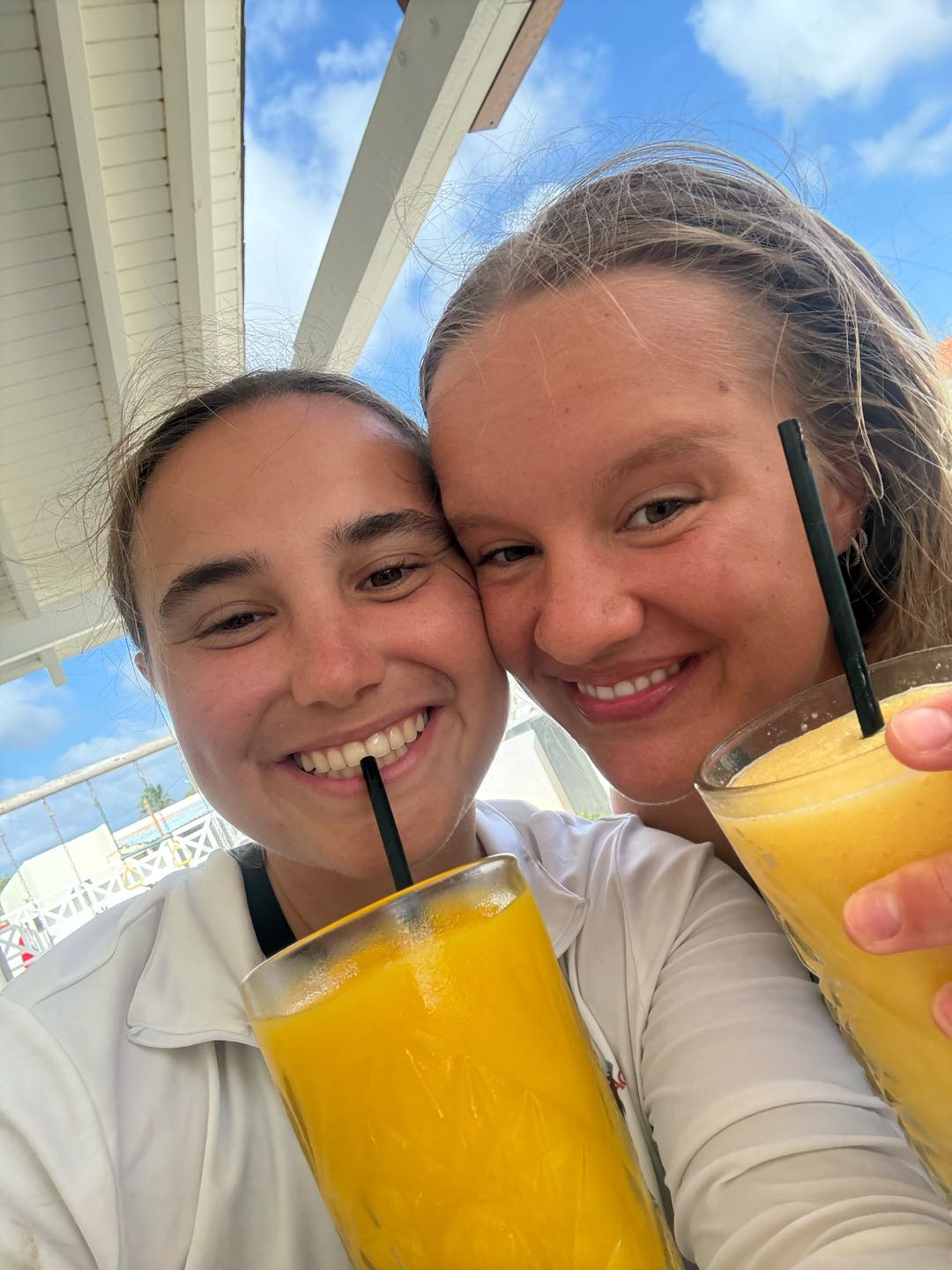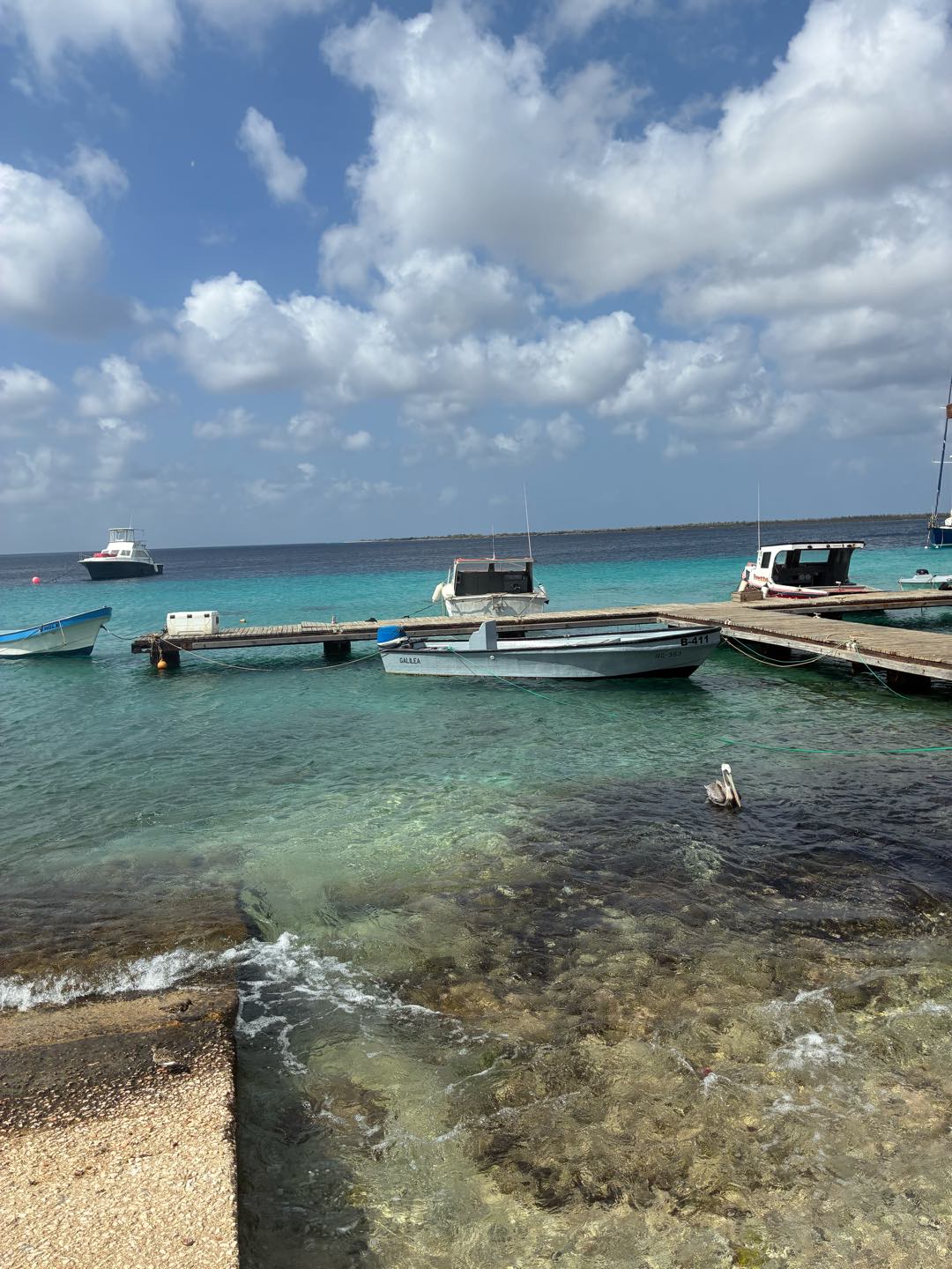 Hi Blog. My day today started at 8 pm yesterday. Watch team 2 was in charge of taking in the sails, and Gavi and I got to sit on the bowsprit to flake the jib. It was gusting about 25 knots, and we were going so fast, it was amazing. While we were out on the bowsprit, we looked below us and saw bioluminescence sparkling under the bow, and it was so magical. After the excitement of putting away the sails, we sat with anticipation, looking at the lights of Bonaire. When I woke up again in the morning, we prepared the deck lines for our wonderful dock spot. We have showers, a private beach, and a patio. After getting tied up, we stretched our legs on the trek to the customs office to get checked in. Then, after catching up with our friends and family after a week, we headed over to the dive shop to get buoyancy checks to be able to dive here. On our way back, the day got reeeeeaaaaallllyyyy exciting I found new watch straps!!!!!!!!!! You may remember in an earlier blog when Rachel rescued my watch from the bottom of the ocean, and now, with a new strap, that is the last time my watch ends up at the bottom of the ocean. After that, we headed over to Within 2 Buns, where Charles and Martin almost got us kicked out for jumping the fence when, in fact, Martin had just passed his shoes over the fence to Charles, who had previously been walking around shoeless. The Bun place ended up being delicious. Sydney and I both got amazing smoothies and a chicken sandwich. After some fire food, Sydney, Katie, Helena, and I went snorkeling and saw some crazy stuff. We saw a peacock flounder, giant parrotfish, a spotted moray eel, and lots of other cool stuff near our boat.