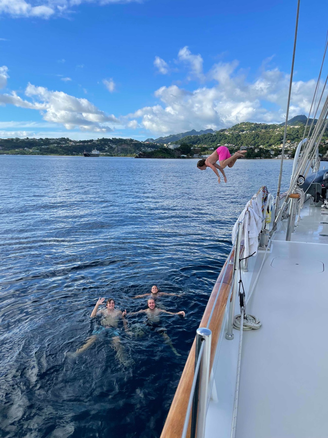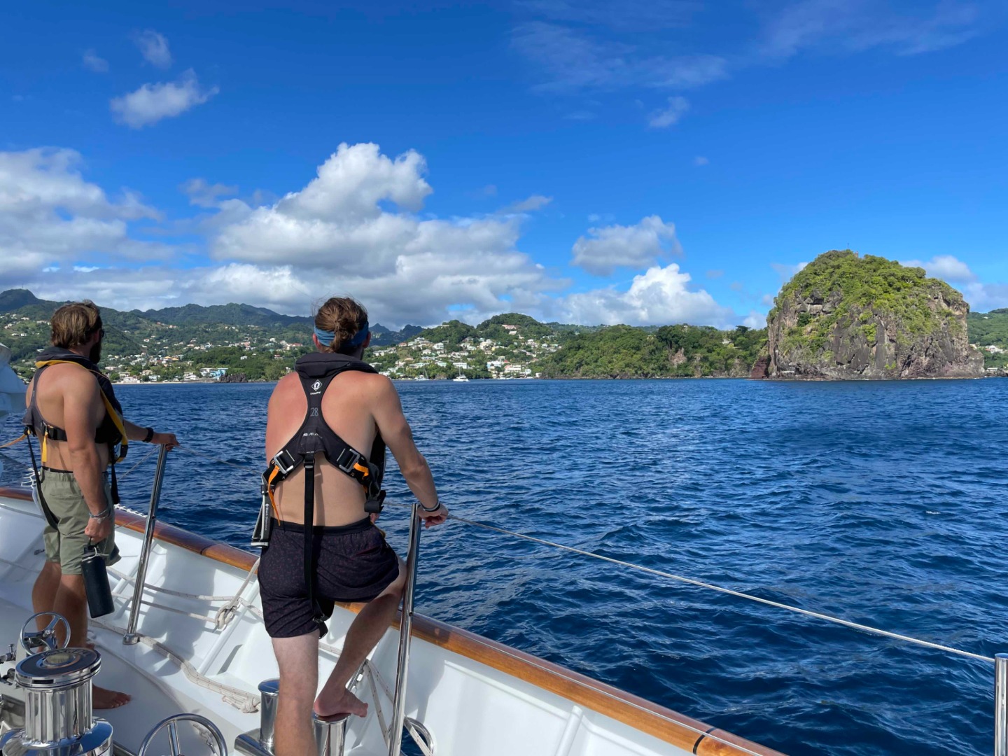 The day started out eventful as watch team three spotted St. Lucia off the port bow in the early morning hours despite hazy visibility due to light showers. Shortly thereafter, they roused the rest of the boat with shouts of “Land Ho!” and In his jubilation, Garrett Lee Jr.–newly clean-shaven and at the time acting as the helmsman–spun the boat a full 360 degrees before resuming course towards St. Vincent. The weather quickly cleared up, and we were greeted by a troupe of diving sea birds as we came in. After a bountiful thanksgiving lunch, the boat played charades (from which watch team two emerged victoriously) in celebration of the holiday, which marked our first break from classes in eighteen days. As St. Vincent’s emerald green coastline came more clearly into focus and the novelty of seeing land wore off, we anchored shortly after finishing up our games. It was at this point that most of the boat regained cell service and was able to connect with family and friends after the arduous journey we had just completed. The smell of vegetation had never felt so good.