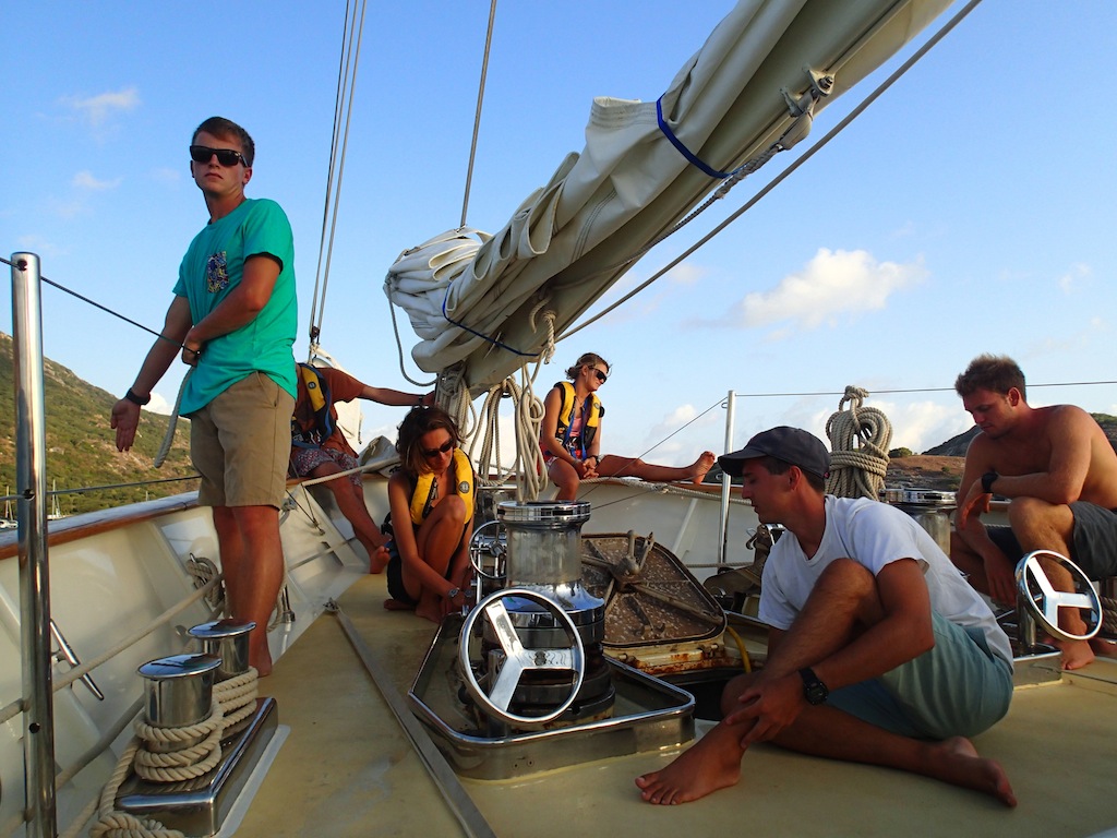 We are currently underway to Thursday Island and have just completed our first day of almost constant sailing. Our shipmates have been divided into three watch teams, taking four-hour shifts to watch the ship while underway. Many of us got opportunities to take responsibility for plotting our current position on our navigational charts, checking the engine room, watching the bow, and taking the helm (steering the vessel). These duties continued all night, so shipmates with the late shifts got an opportunity to sleep in. After lunch, we had Oceanography and a special course on how to write a proper scientific paper. The rest of the afternoon was spent studying, being on watch, and sailing. At Argo’s quick pace, we would have arrived at Thursday Island before the sun rose, so to avoid taking the sails down and lowering the anchor at night, we stopped for a few hours during the afternoon. After our nightly squeeze, where we shared our favorite quotes with one another, we all ate and set sail once again. We finished the night with our Student Leadership course and got ready for another night of sailing. Alt vel. Vi ses til Jul!