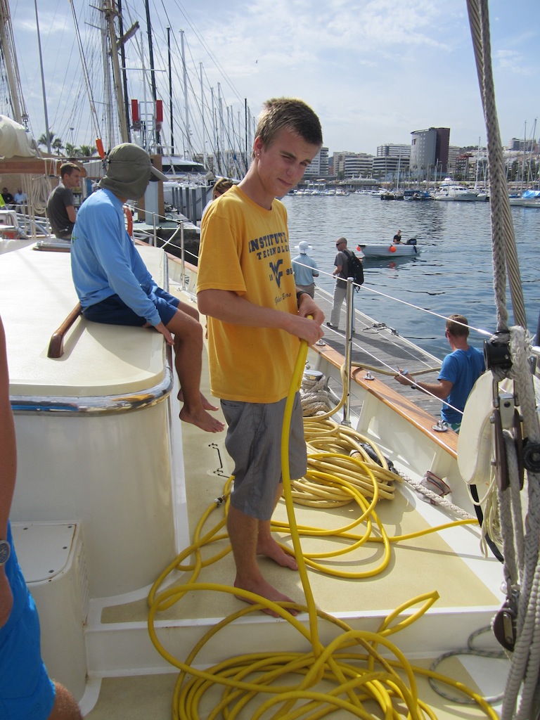 As watch team two was awoken at 8 am to take overwatch from team one, we didn’t expect that we would single-handedly be taking Argo into the marina in Las Palmas. But somehow, the eight students on watch team two, with some help from staff and two or three other students who couldn’t sleep, brought Argo onto the dock; the first time a watch had done this by themselves on this trip. Before we could actually get in, though, we had to wait for a boat to vacate the spot we were scheduled to have; surprisingly, we had seen the boat before in St. Tropez! However, after they left, we could move into the dock. It was an exciting moment when we realized that we were done docking with only a third of the manpower it normally takes to dock. After mustering the whole crew in the cockpit, we began the BA. The staff made a list of things that needed to get done before we started the crossing, and we have barely made a dent in it. We also celebrated Nicole’s birthday! She got specially made French toast, and the chefs, Biz, Kelly, and Aliki, prepared a fruit crumble with custard for everyone else. Then we ended the day with two classes: OCE, where we began geographical reviews, and MTE, where we did more chart work. Everyone is looking forward to election results tomorrow and doing our first group dives with everyone certified! Till the next 30 days, Alex