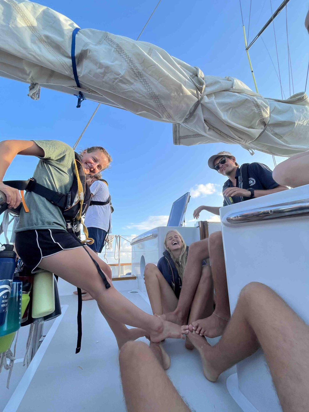 Having classes in a rocking boat also seems to make sense for us as we are learning about pollution and conservation in our last marine bio class, as well as what I think to be the coolest leadership class we ever had. Was I the one giving it? Hum… maybe 😉 We finish all of this with our traditional squeeze, which is always my favorite part of the day. Even more, this one since Matt was having the hiccups all along! For the record, he sounded like a cute puppy who try to bark for the first time. Everybody was laughing, and it was, as always, an enjoyable moment. Now, as I am writing all of this in the chart house, I am hearing everybody enjoying their end of passage by singing while doing the cleanup.