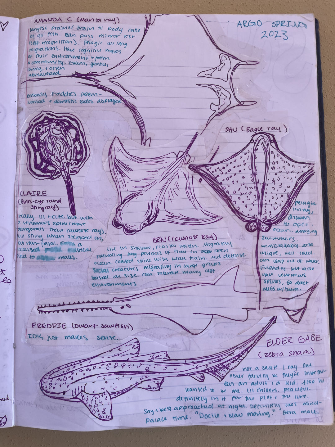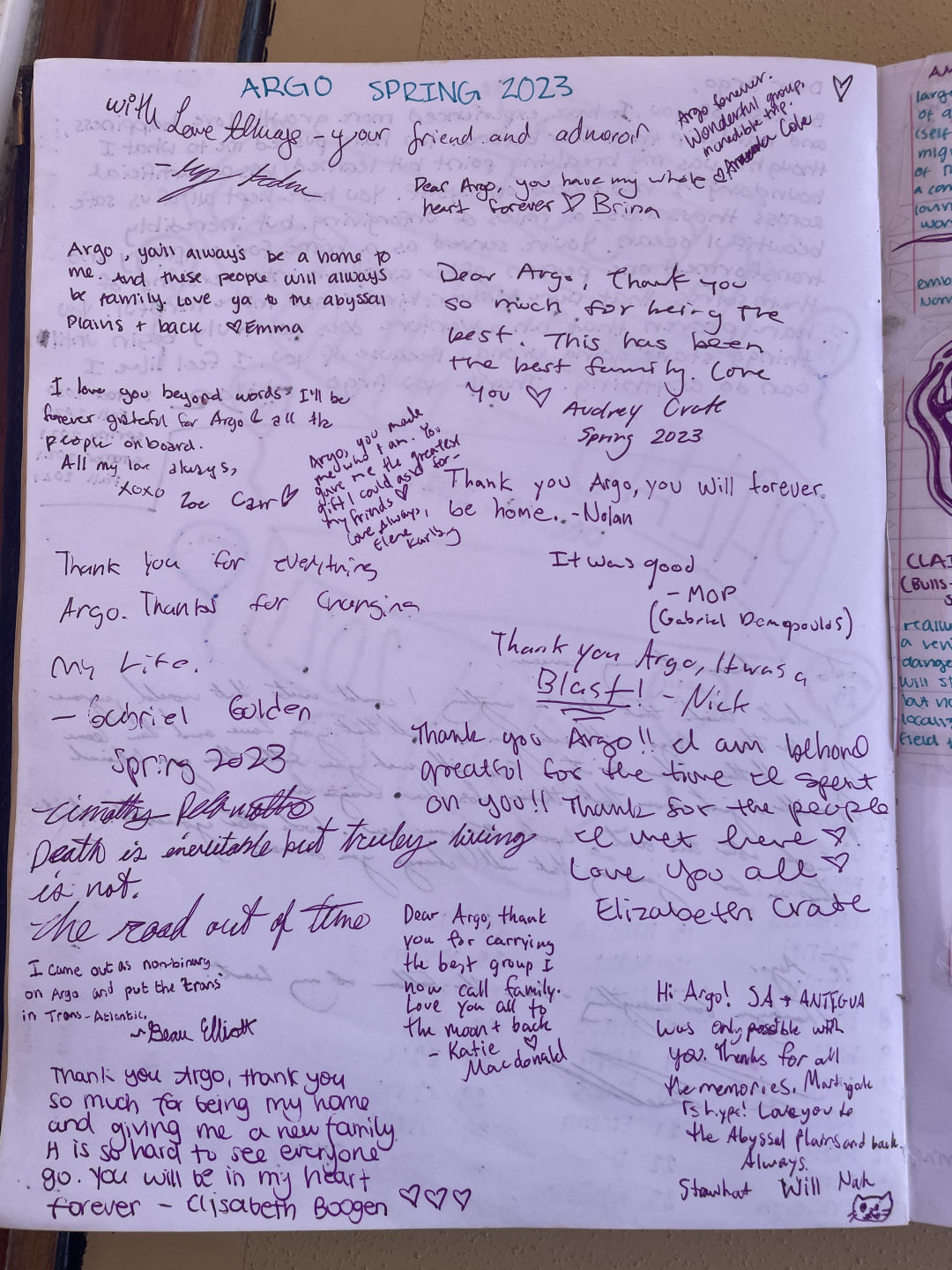 Pictured: Emma created a beautiful memory in the Argo guest book to represent our trip; Staff on Argo Spring 2023; the crew of Argo dressed up and ready for final dinner.