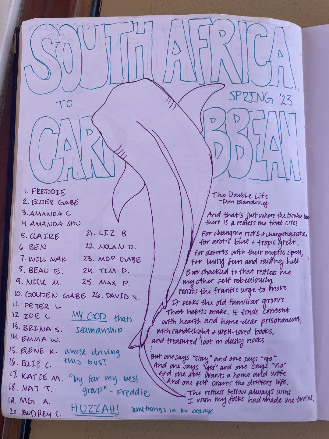 Once everyone was cleaned up and dressed in some of the nicest clothes we had seen so far, we all sat in the cockpit for our final squeeze. This one was a particularly bittersweet one for me as well because, after five years with Seamester, this is my final trip. Everyone held hands, and our question was, “What is a lesson you have learned that you want to take with you when you depart Argo?” There were so many good words of wisdom shared and a few tears shed in memory of our amazing semester together. Once we were finished, we hopped in the dinghy and went to Trappas for our final dinner. We were all seated at a huge table (Thanks Calum for watching Argo so that Freddie could join us for dinner!), and we ate and drank and had so much fun together. Many people are feeling sad that this experience is coming to a close, but we can also be happy to know that many of us will certainly see each other again. We will carry our memories with us always, and the friendships and bonds we have formed will be there no matter how far apart we are in the future. I want to personally thank every staff and student for making this trip incredible and unforgettable. From Table Mountain to Napoleon’s grave to the challenge course on Devil’s Island to the beaches of Fernando de Noronha to many fun and beautiful dives in the Caribbean to starry skies underway and (something in the) orange sunsets and everywhere in between, this trip was an absolute pleasure and an adventure like no other. And Argo, thank you for carrying us safely the whole way and protecting us, and bringing us together. You are so much more than just a boat. You are a home.