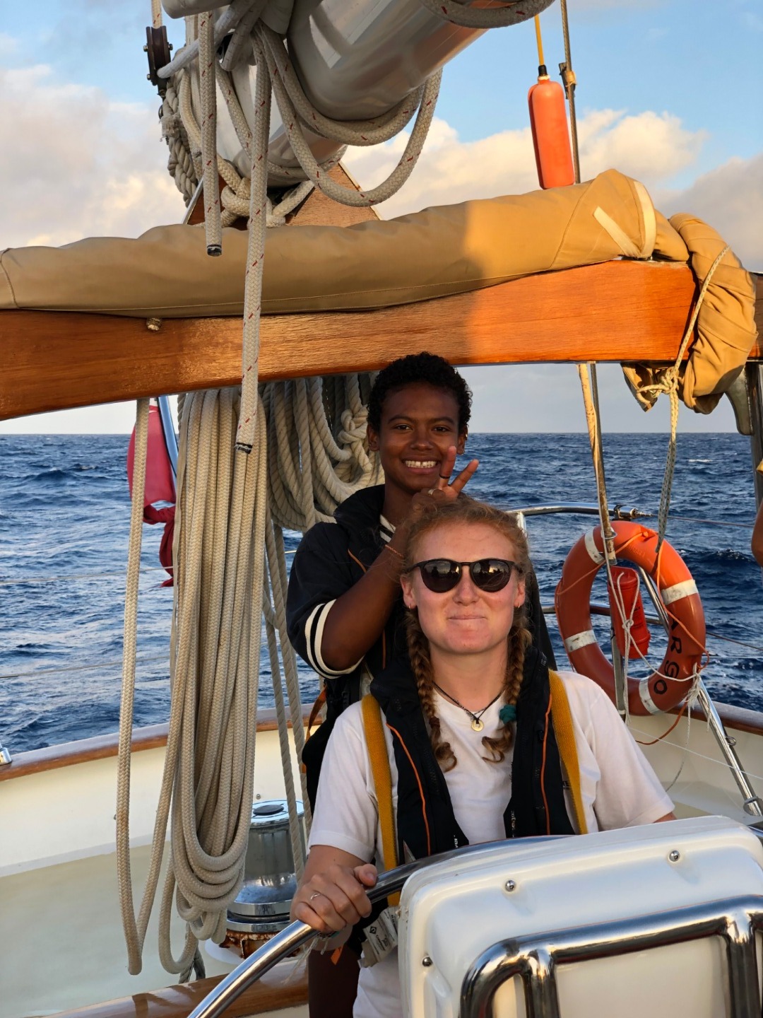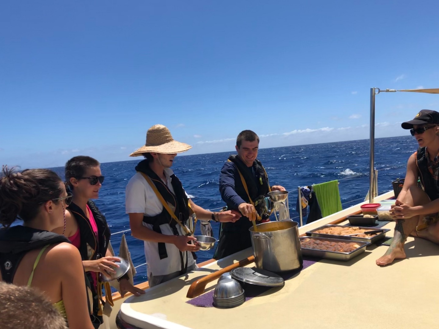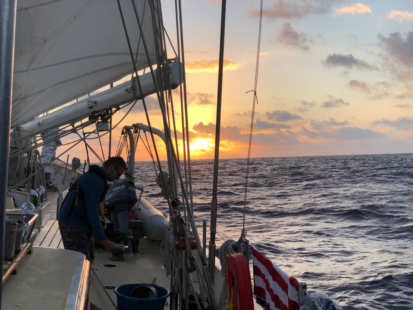 Today is the 18th day of passage. With our current estimation, we will be arriving at the Marquesas islands tomorrow afternoon. This is exciting news for the entire crew as we are all very looking forward to land. Because we are motor sailing right now and we do not have the mainsail raised, we can use the affectionately named “mini tarp” over the cockpit during the day. It provides us with a welcome sliver of shade out here in the great wide expanse of ocean and sunshine. Though we love the rays, the deck gets blistering hot in the afternoons, and we all huddle together in the blissfully cool shade.