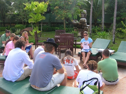 Today was the last full day in Cambodia, and we started it off with a basic seamanship class by the pool. After breakfast, we met Sophat, our guide, who showed us the floating village on Tonle Sap Lake. We then returned to Siem Reap and took a tour of an artisan school where young people from rural villages learn traditional Cambodian crafts. The gift shop had some pretty great things! After lunch, our last stop of the day was the Cambodian Land Mine Museum. It was founded by a man named Aki Ra, who was a child soldier in the Khmer Rouge regime and was then kidnapped by the Vietnamese army before he joined a UN force de-mining his country. The donations he receives from his museum go towards maintaining a landmine-clearing crew. Afterward, we made it back to the hotel for a marine biology class and got ready to go out to dinner. We went to a place that offered traditional Cambodian dancing. It was incredibly beautiful to watch. Since it was our last night, we all went out for a night of dancing. We met up with Peter’s tuk-tuk driving friend Borei and took over the dance floor at a funky little bar in Siem Reap. It was a great way to end a fantastic trip.