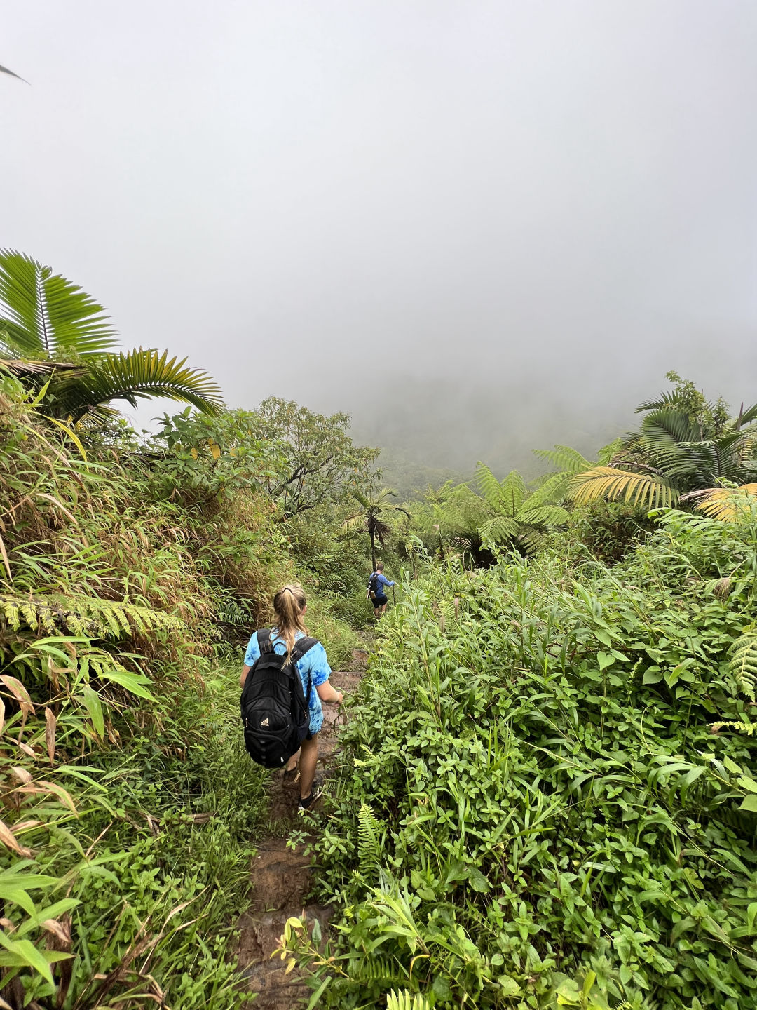 Our crew had already split into many groups, where everyone walked at their own desired pace. We had our first resting spot around 45 minutes into the hike, and very well-deserved as we were climbing the trail faster than expected. The resting area was at the top of a hill and hosted great views. We were in awe, seeing the clouds nearby dance and create vortexes while we soaked in the condensation. After rehydrating, we continued on.