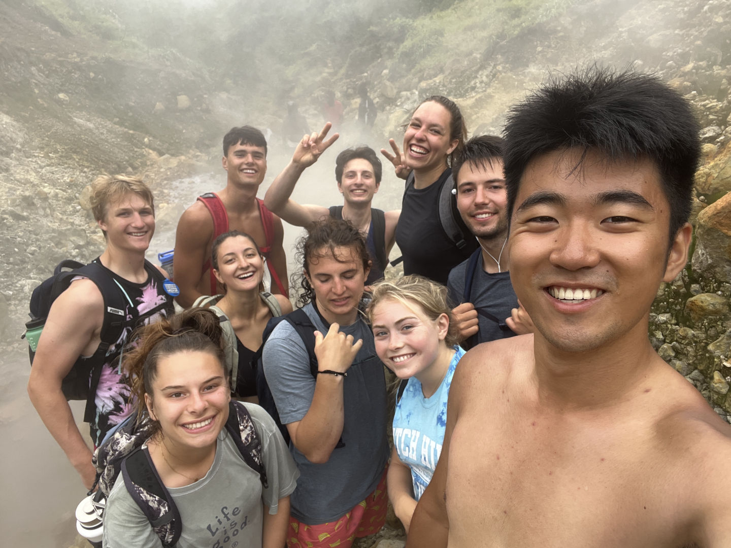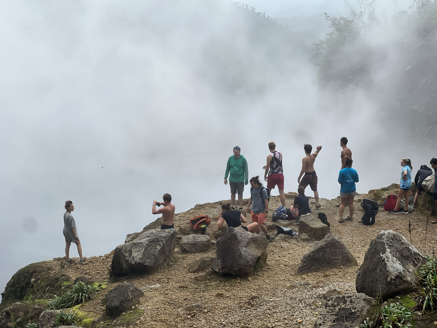 The remaining part of the hike was very rocky and resulted in us having to be much more careful with our steps. There were times when we had to repel down a tiny cliff to continue and others when we were hugging the side of the mountain not to fall down the tall ridge beside us. As we neared the Boiling Lake, we could begin to smell the rotten-egg odor of sulfur in the water. We had a lot of fun boiling eggs in the sulphuric water and then eating them afterward. At last, we finally made it to the Boiling Lake. In celebration, we had a feast and ate our packed lunches, which included rice, mango salsa, beans, and plantains. The tour guides also brought up fish sandwiches for us to share. The crew took many pictures, and some of us threw rocks toward the lake to see who could make the farthest splash.