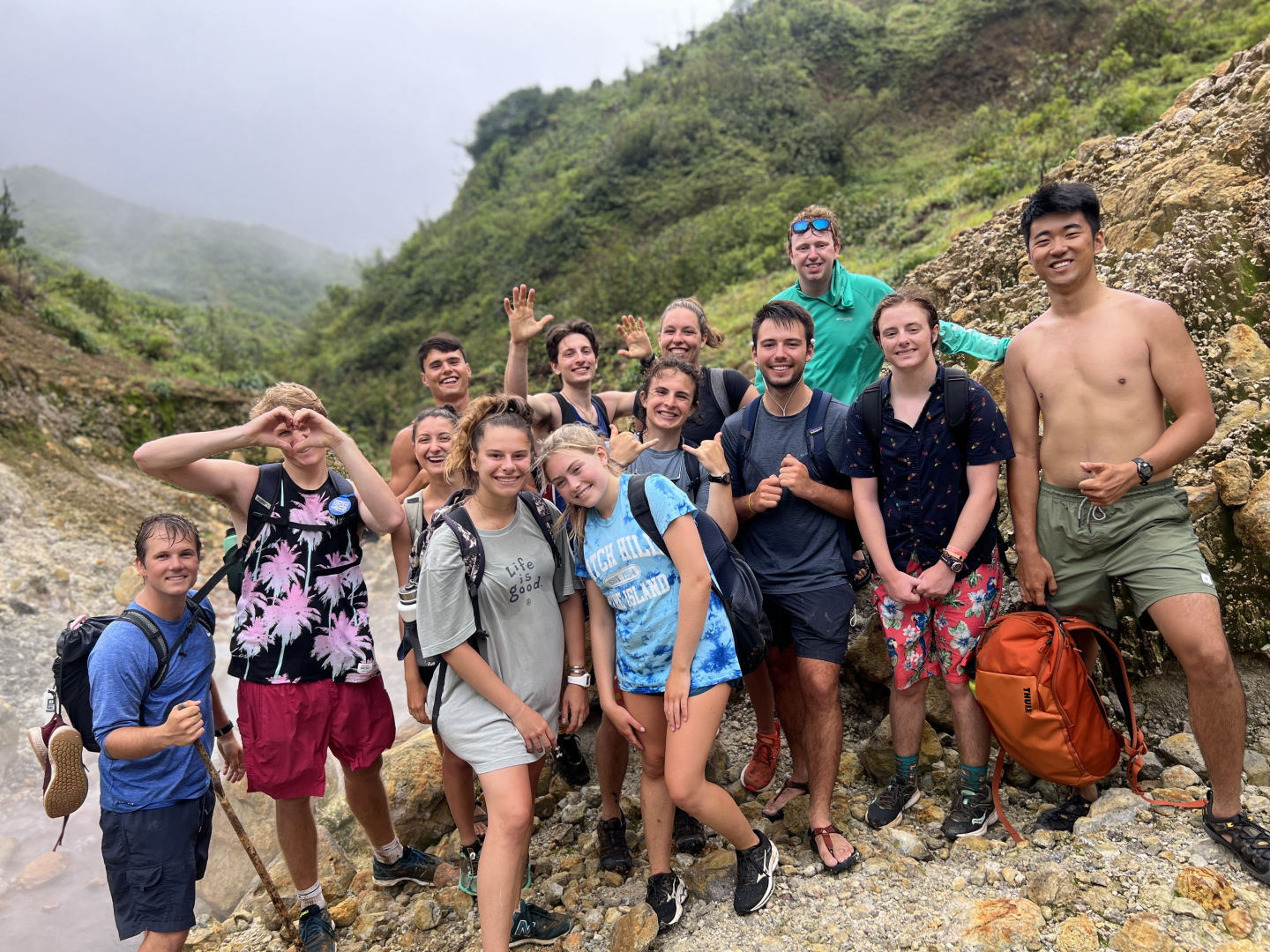 We made it to the Boiling Lake trail and were surprised by a sign that stated the trail was closed; after asking the tour guide, who responded with the trail was indeed open and the sign was accidentally left on. In relief, we began our hike to the world’s largest boiling lake, unaware of what the rest of the day had prepared for us. The hike began with plenty of mud, and a few of us attempted to dodge it. However, all eventually gave in to having muddy shoes and feet. This trail was no walk in the park; we endured many high elevation gains and crossed streams and rivers, which was refreshing and would clean off our dirty shoes.