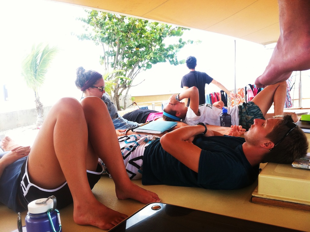 Today started off early for some of the Argo crew, whether it was doing laundry or going out with the dinghies to do some water samples of the marina and the surrounding area. In the morning, after breakfast, we had an OCB class where we played Jeopardy, followed by an MTE class on anchors and docking, and finished with an OCE class on physical oceanography. After lunch, everyone had free time for the day to get out and explore the island, rent bikes, walk around town, windsurf, or relax on the boat. A group, which I was a part of, went back to Jibe City and did some more windsurfing. Windsurfing, once you get the hang of it, is a blast, with the only aggravation being the 10-year-old kids and the 80-year-old seniors flying by you after a tumble into the water. At 7 pm tonight, everyone will be back on Argo for the squeeze question of the day, which will be, “If you were to start your own business or non-profit/foundation that you would spend your career managing, what would it be and why?” After supper, we have a night out where we get to enjoy the sights and sounds of the last day of Carnival here in Bonaire. So far, the day has been great, with the upcoming night to be even better.