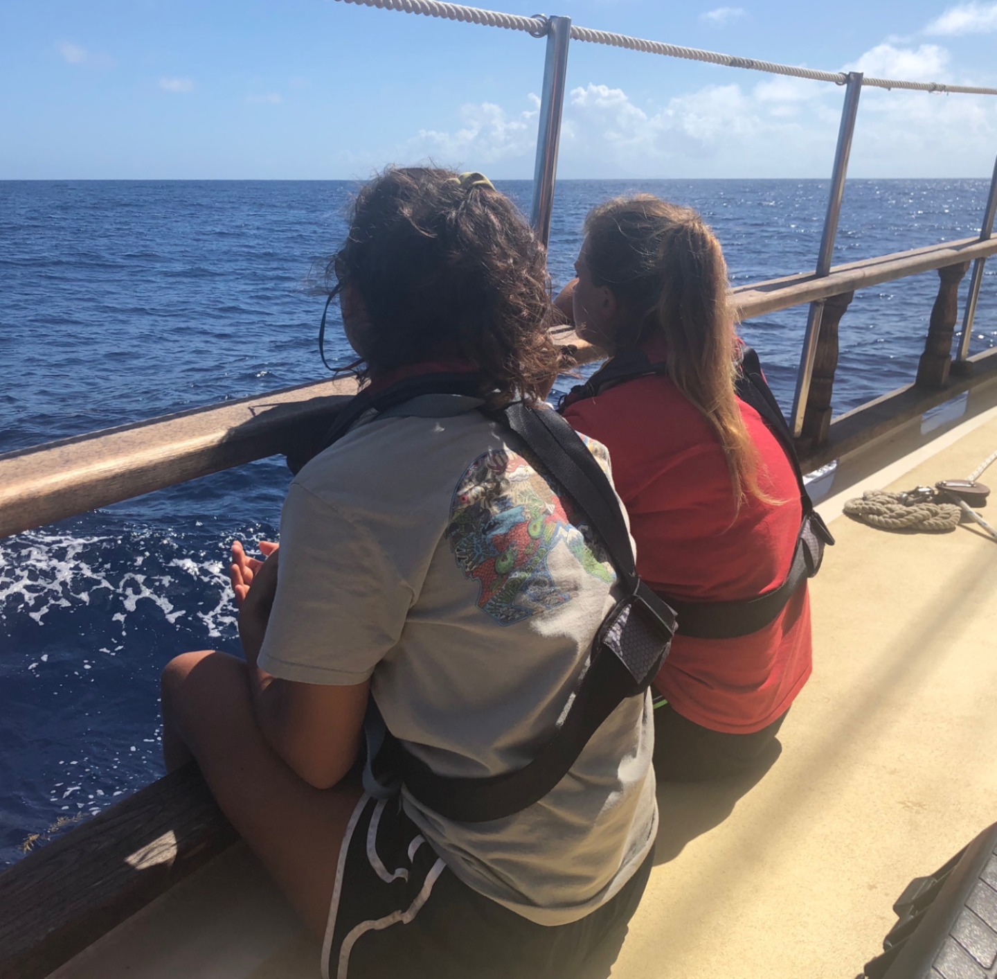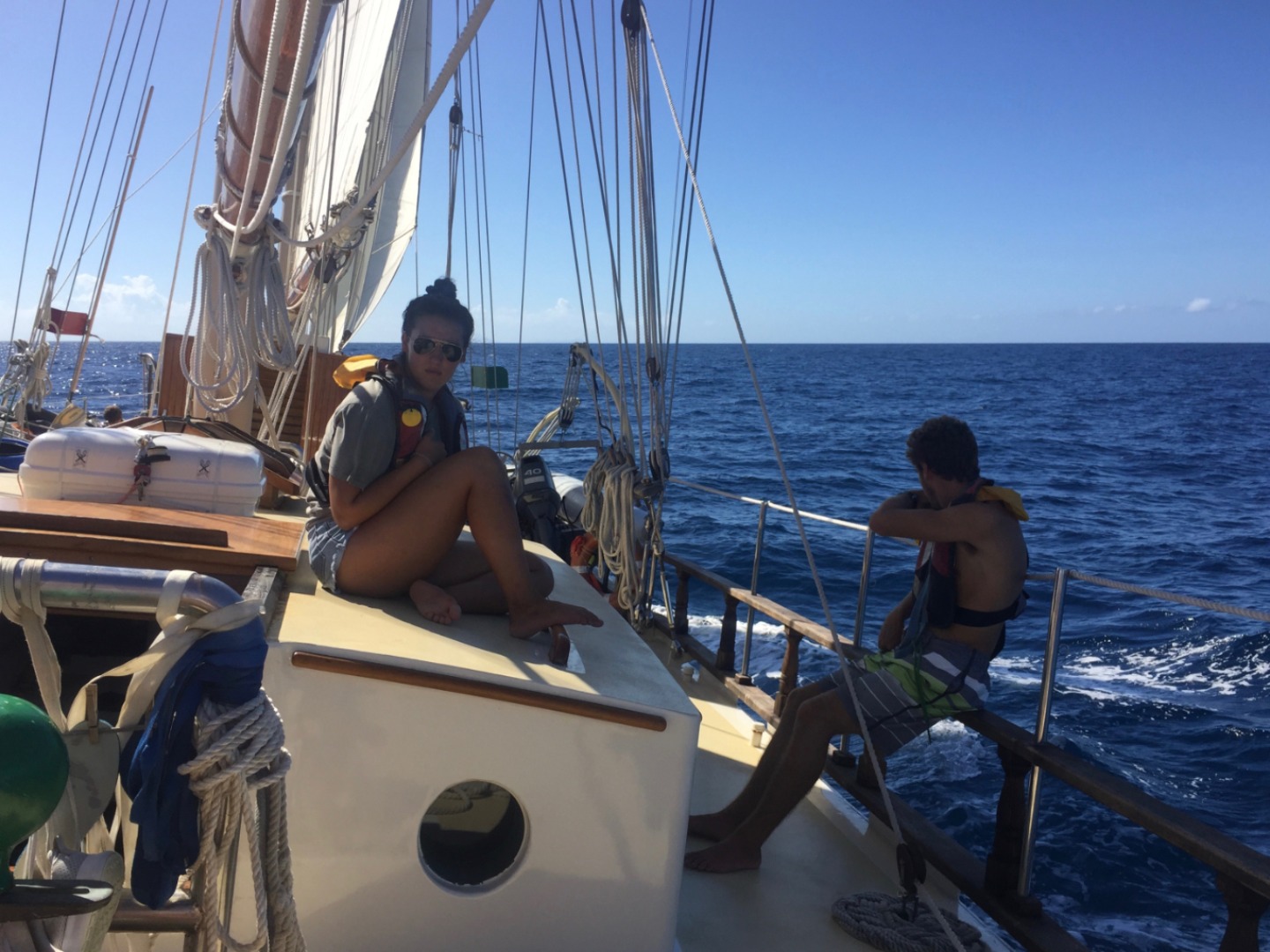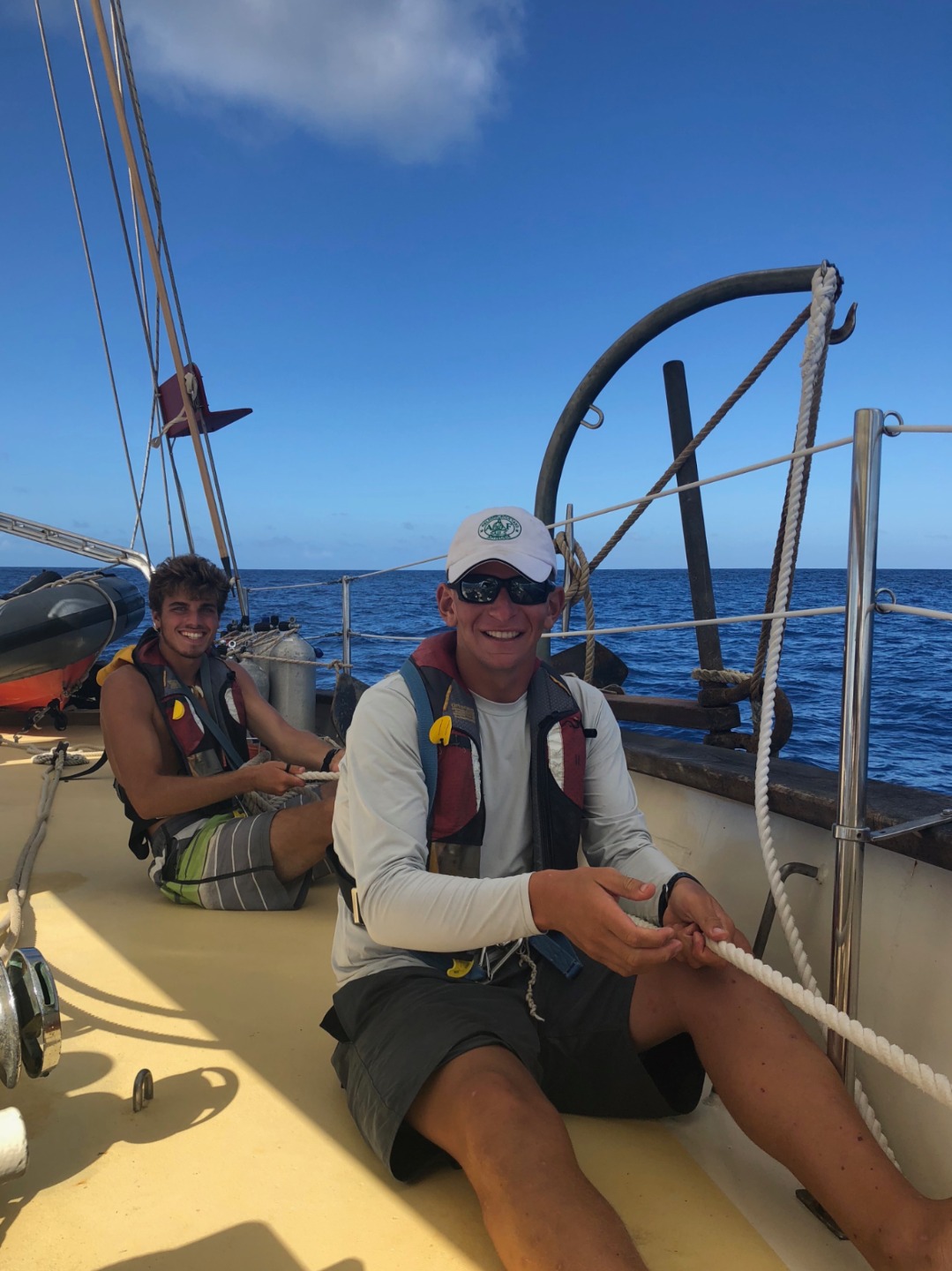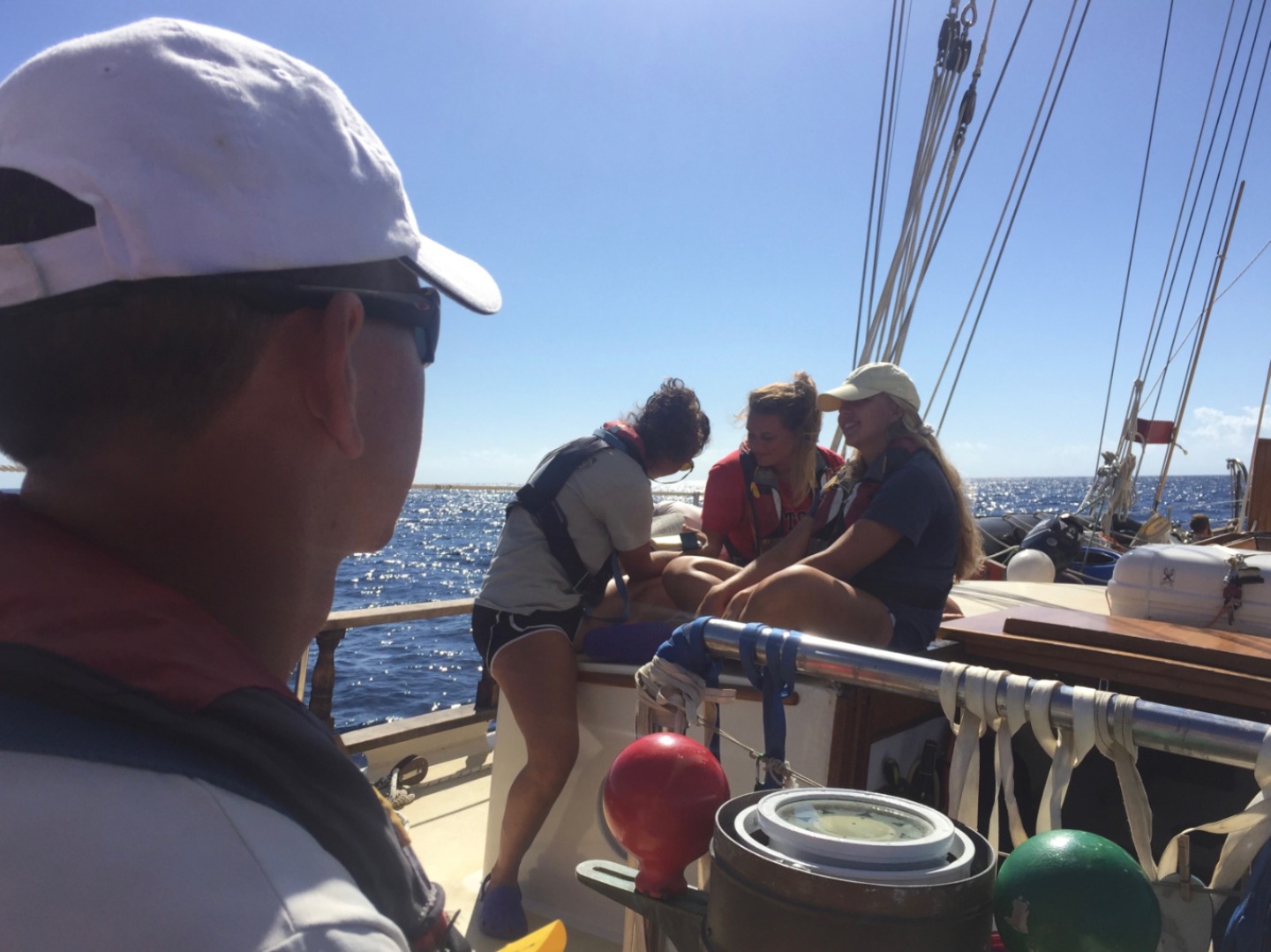 We awoke this morning in the quiet, protected bay of Ile Fourche, a lovely uninhabited island at the western end of St. Barths. After a quick breakfast, we raised sails and hauled anchor simultaneously, then made our way out to open waters. It was a very light day today in the Caribbean Sea, and the wind came from a very odd direction. It was blowing 7-10kts out of the south and made the beginning of the voyage an upwind venture. Typically, this sail is a pleasant beam reach with winds out of the east, allowing Ocean Star to cruise along at 7-9kts. Today we slugged along at 3-4 knots with all our sails presented to the wind. The students did a great job at throwing up the full mainsail, full foresail, and staysail quickly. It took a bit longer to run out the flying jib and jib, but it didn’t make much difference in speed. St. Barths just wanted us to stay another day. As the morning turned to afternoon, the breeze shifted further east and picked up slightly, giving us a gentle push and lifting our boat speed to 6-7 knots. By the time we were within a stone’s throw of Statia, we were making close to 9 knots as we cruised through the massive ships anchored in her lee. There is a large fuel depot in Statia where ships will come to buy and sell fuel in high quantities, which makes the waters surrounding the island very busy with commercial ship traffic. We made it into the anchorage and dropped sail at roughly 3 pm, and went for a swim to cool down. When the wind is calm in the Caribbean, you remember how hot it is. Statia is a very calm and pleasant island full of history and great diving. I am sure you will hear more about our exciting adventures tomorrow.