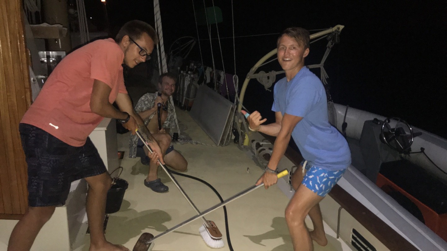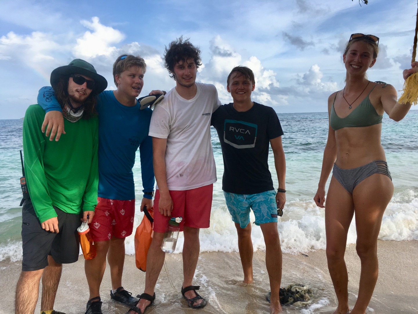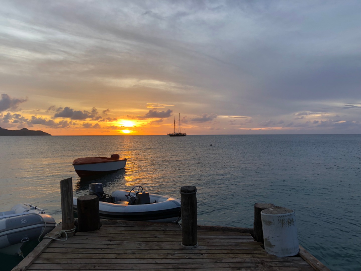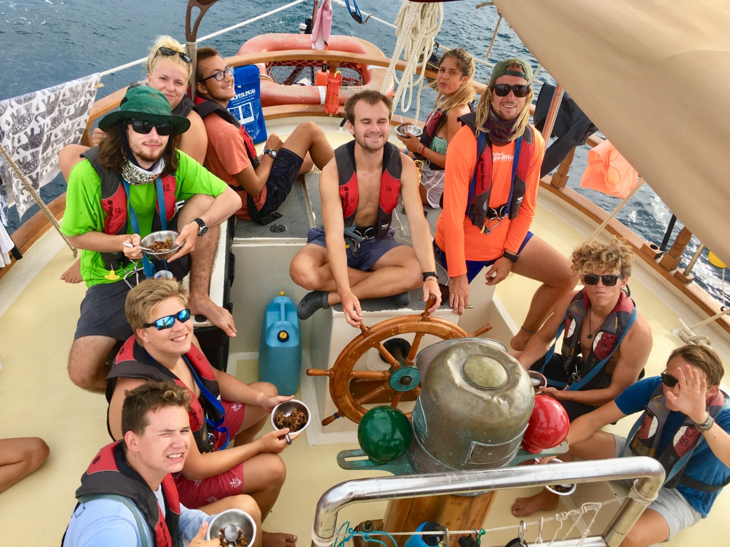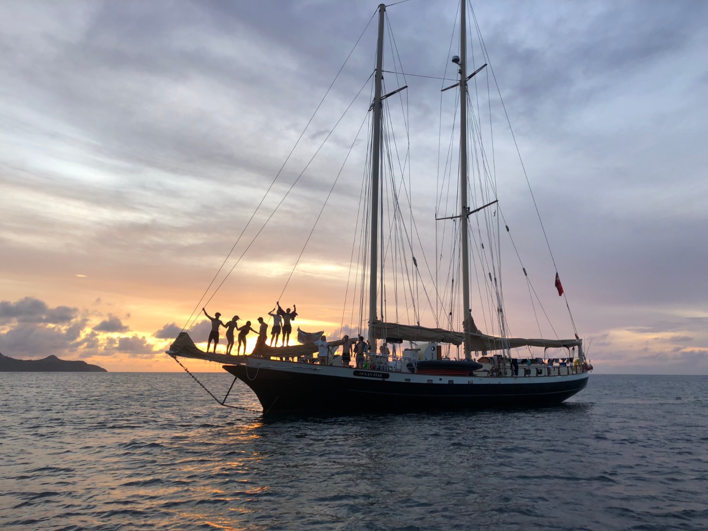 This morning we started with breakfast underway to Mayreau in St. Vincent and the Grenadines. After arriving, we had a quick fish ID quiz and then a class on seamanship with Carolyn. After lunch, we got ready for our leadership activity. An amazing race challenge course was today’s class. We were divided into our watch teams and given our first task, to follow the compass heading given from the anchor and snorkel to find an underwater bag with our first clue inside. Once we got our bag and snorkeled to the shore, the clue led us up a mountain to a church. It wasn’t long before we all became very confused and ended up going the wrong way. We then quickly found out we needed to go to a beach to find Amanda, who gave us the next one, and a friendly dog decided to join us in our race. After a long run down the beach with our new friend, our next clue had us find Carolyn for a beach cleanup. Then we raced to get back to the dock and onto the boat. It was such a fun way to explore the island and and to work together as a team to solve problems, decipher clues, collect tokens, and figure out riddles. Once our fun yet exhausting challenge course was over, we were able to grab some snacks and walk around on the island for a bit. We then got to enjoy the beautiful sunset while getting ready for dinner. Our long day ended with pizza!