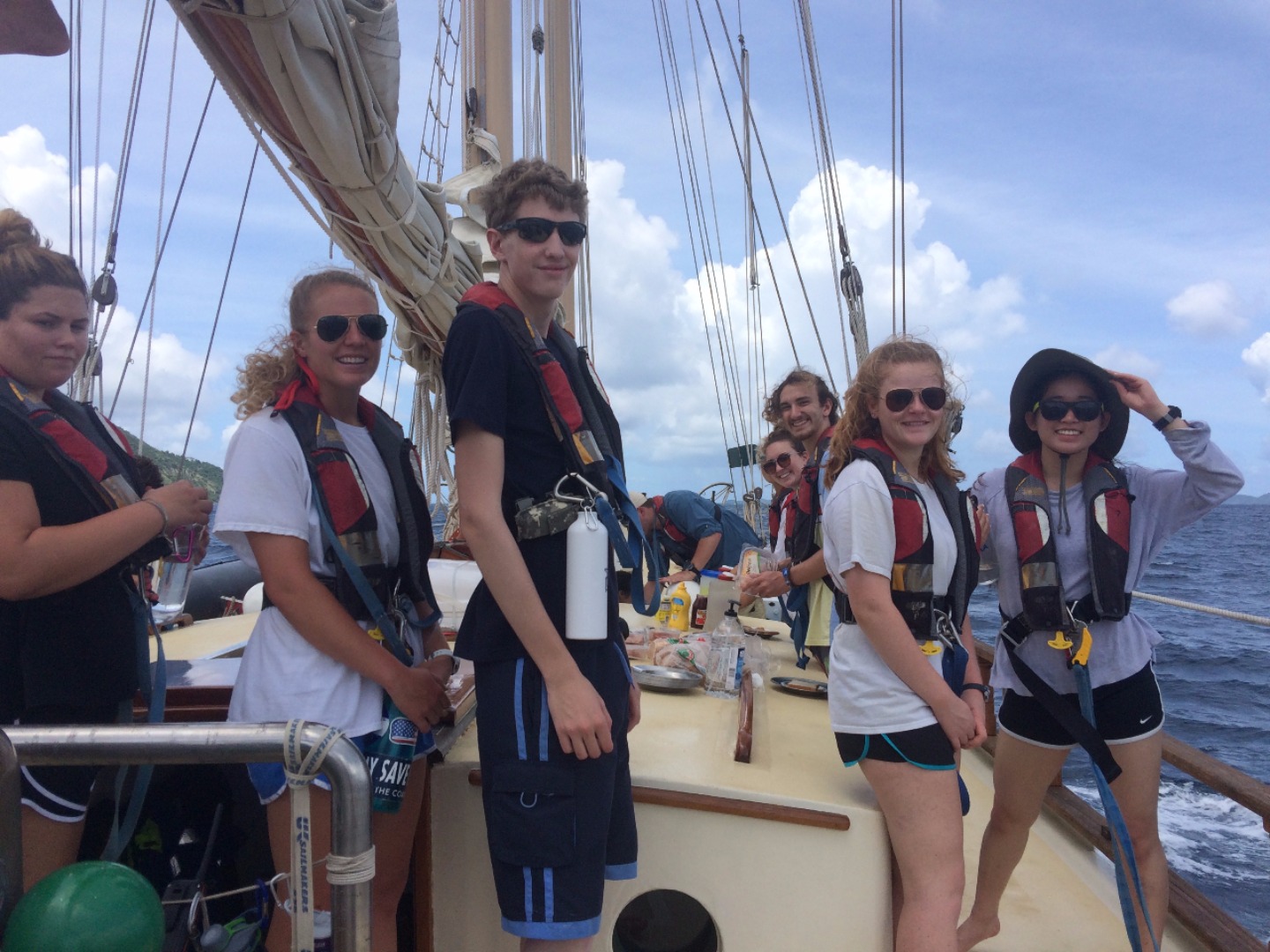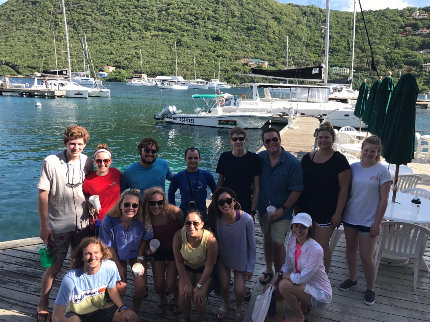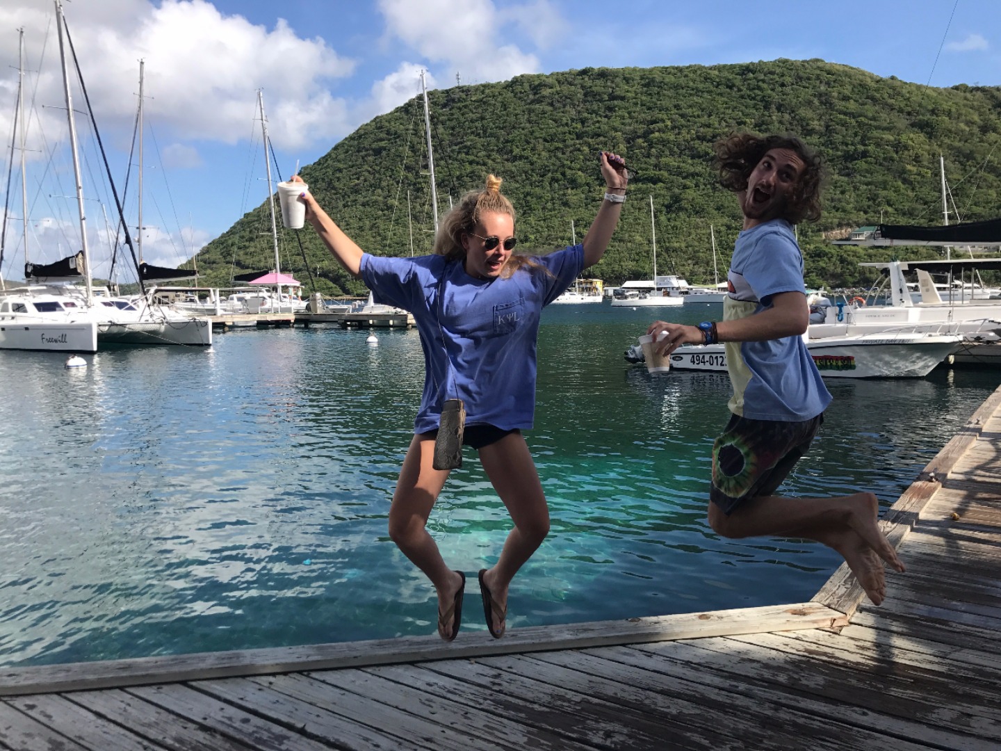 Today was a big day for the brand new crew of Ocean Star. We spent our first night on the boat last night and woke up eager to leave our comfortable spot in Soper’s Hole. The morning was spent exploring Soper’s Hole; some of us got coffee and smoothies from D’Best cup. For the coffee drinkers, this was bittersweet because from here on out, we would be drinking instant coffee only (yikes). After a very thorough explanation of all the rules and regulations, we got ready to leave with some last-minute provisions. A local outside of the Harbor Market told us, “Let go of your worries, let go of your cries. Be carefree, but careful, and enjoy your time!” and then photobombed our group photo. With this bit of wisdom, we boarded O Star and prepared to leave the dock. We pulled one of our very heavy dinghies on board using our strong arms, and not the hydraulics – our Captain says, “Why would I use the hydraulics, I have deckhands!”. We motor-sailed for a few hours, making our first passage through the cobalt blue water to Savannah Bay on Virgin Gorda. As the sunset, we swam four laps around the boat and trod water for our swim test before settling down for an evening of Sloppy Joe’s and dive lecture!
