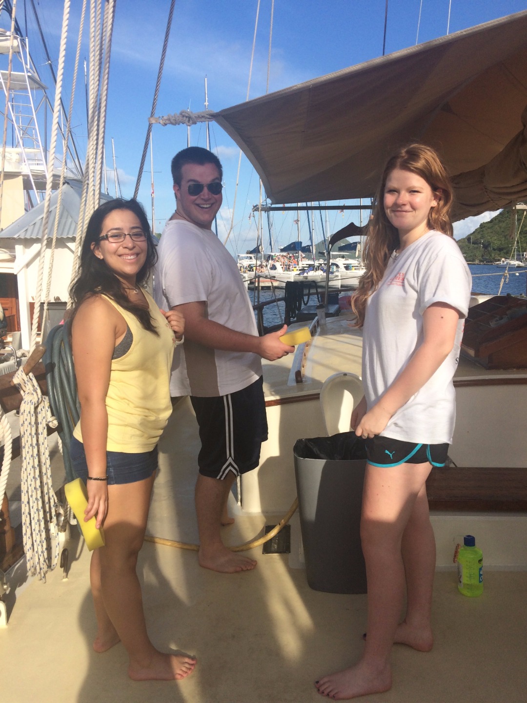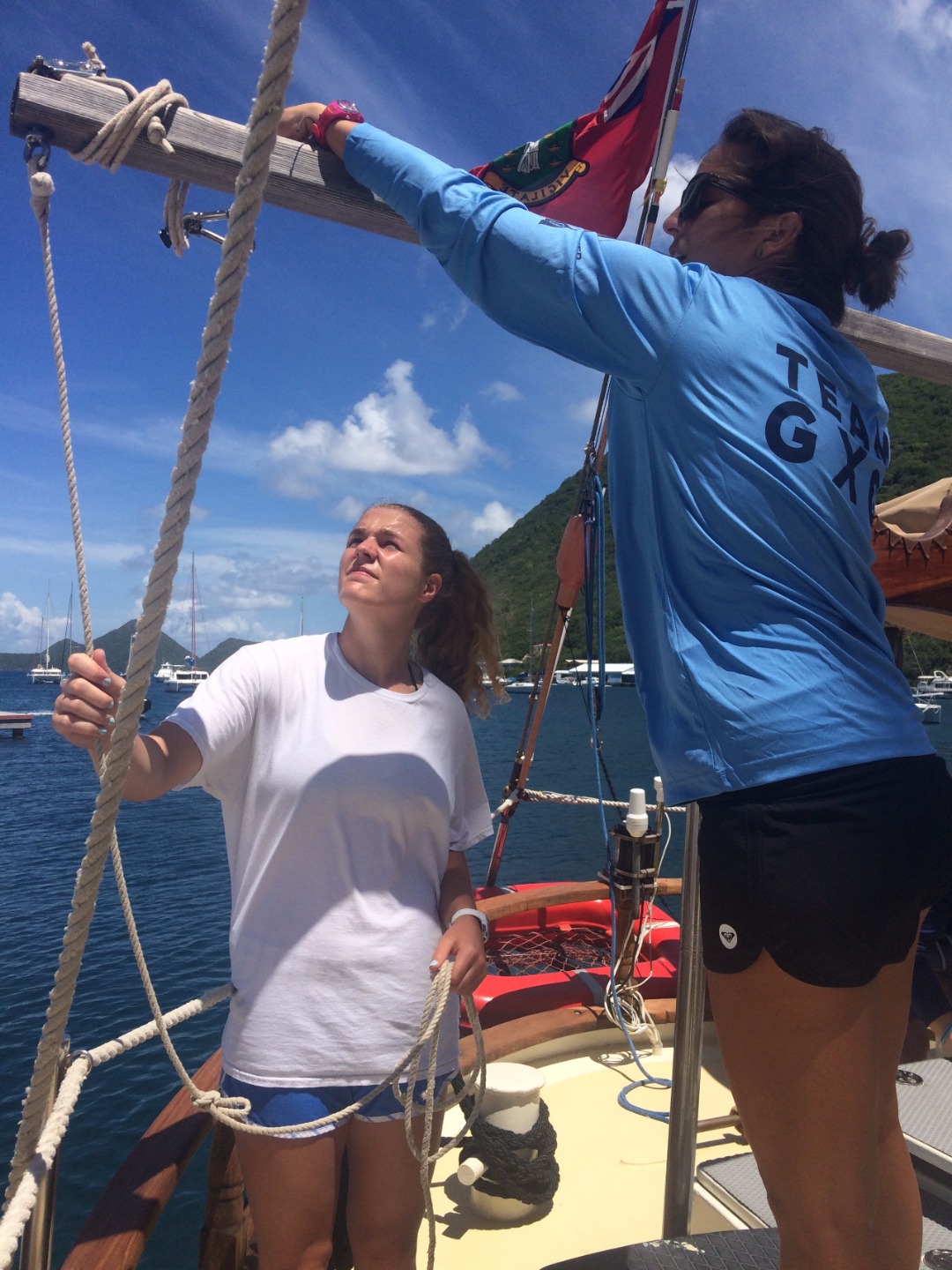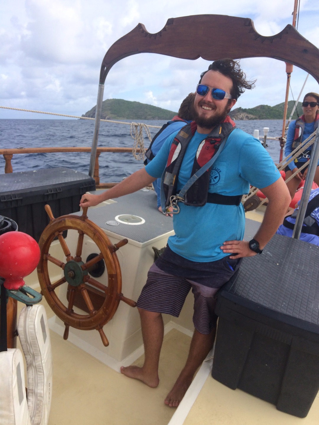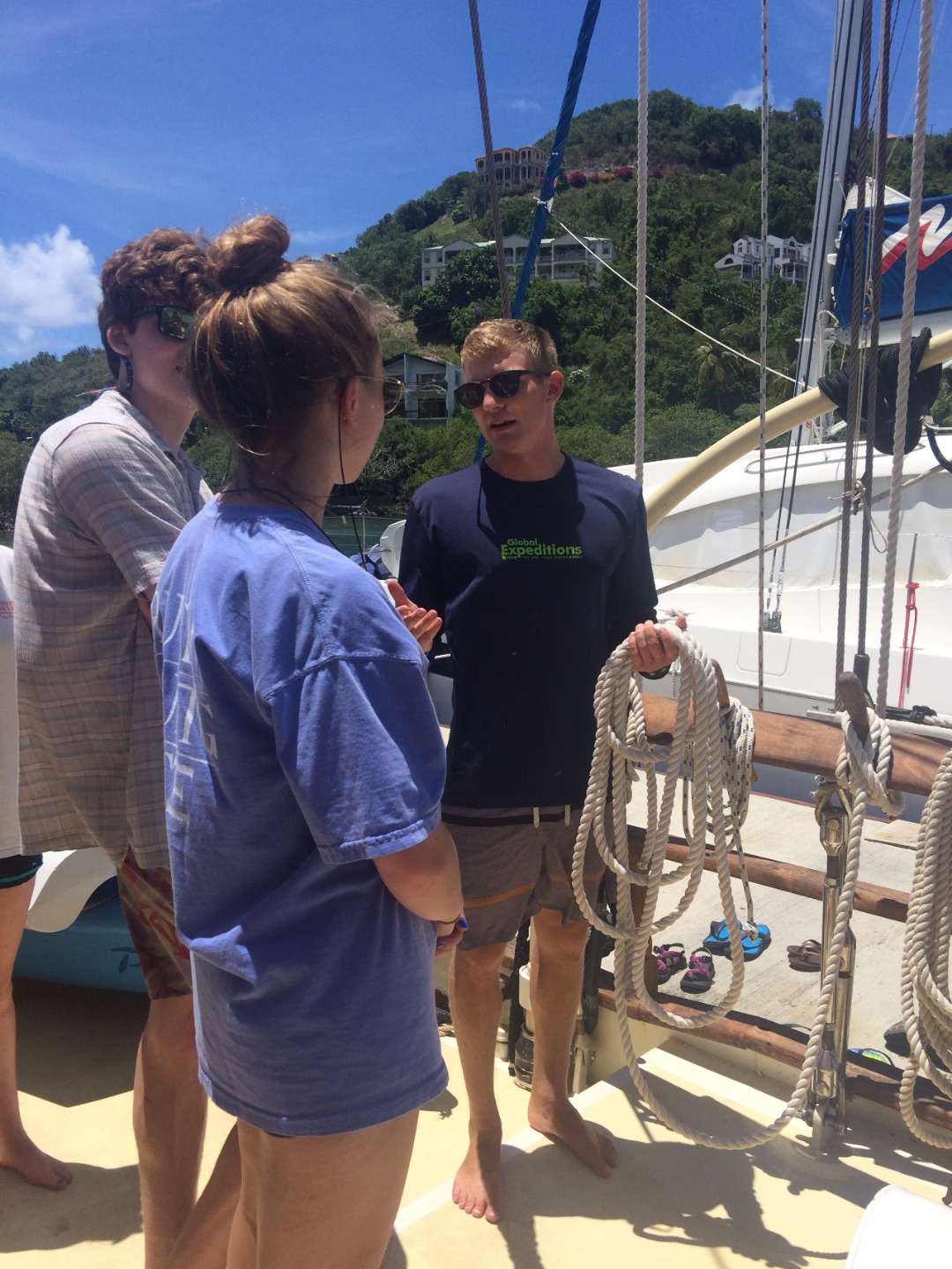 Today was a big day for the brand new crew of Ocean Star. We spent our first night on the boat last night and woke up eager to leave our comfortable spot in Soper’s Hole. The morning was spent exploring Soper’s Hole; some of us got coffee and smoothies from D’Best cup. For the coffee drinkers, this was bittersweet because from here on out, we would be drinking instant coffee only (yikes). After a very thorough explanation of all the rules and regulations, we got ready to leave with some last-minute provisions. A local outside of the Harbor Market told us, “Let go of your worries, let go of your cries. Be carefree, but careful, and enjoy your time!” and then photobombed our group photo. With this bit of wisdom, we boarded O Star and prepared to leave the dock. We pulled one of our very heavy dinghies on board using our strong arms, and not the hydraulics – our Captain says, “Why would I use the hydraulics, I have deckhands!”. We motor-sailed for a few hours, making our first passage through the cobalt blue water to Savannah Bay on Virgin Gorda. As the sunset, we swam four laps around the boat and trod water for our swim test before settling down for an evening of Sloppy Joe’s and dive lecture!