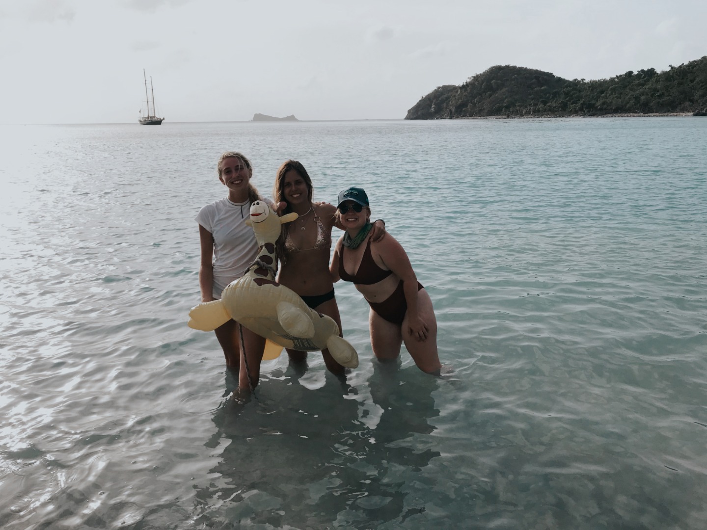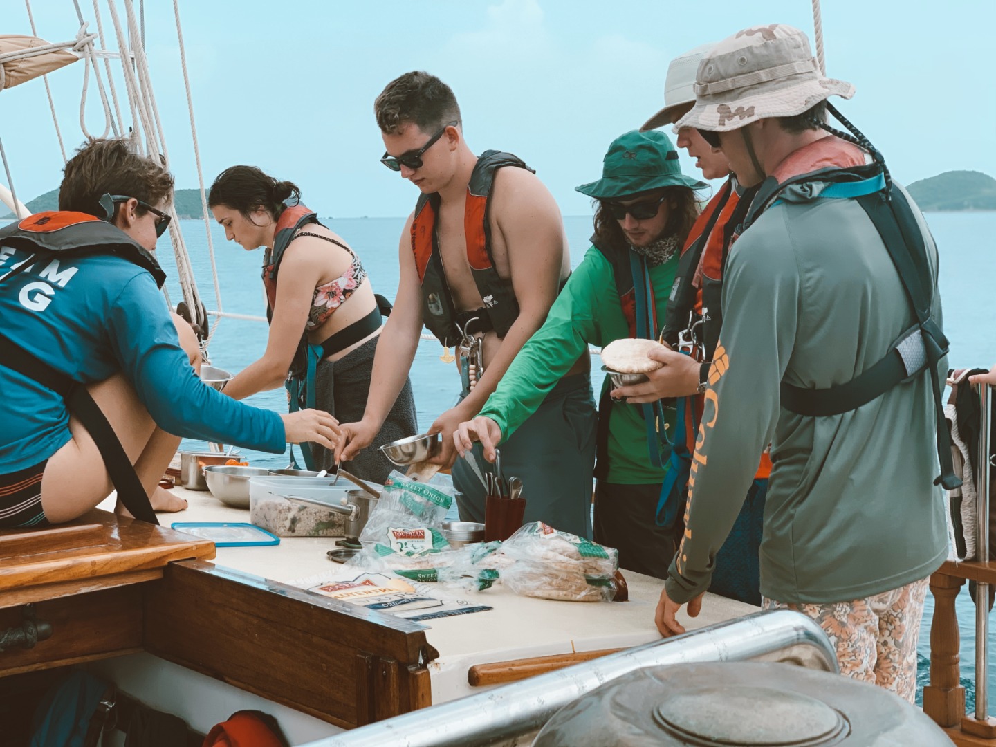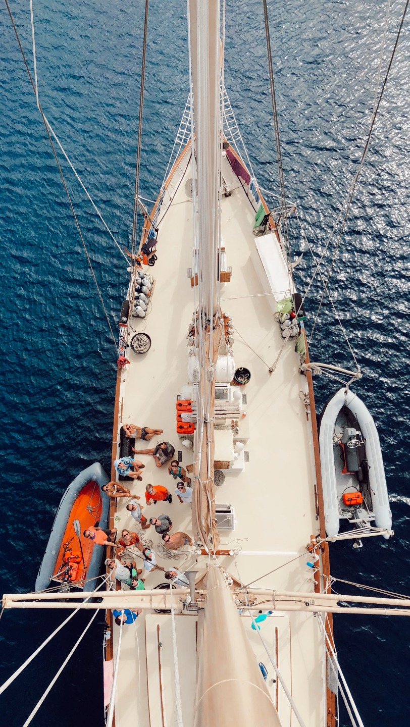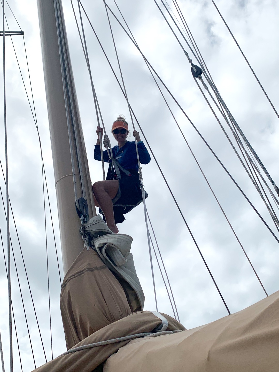 Pictured: Amy’s bird’s eye view of Ocean Star from way up the mast; Carolyn teaching the students how to sweat lines; Amy in the bosun’s chair; everyone going through the lunch line; Kaiden, Joseph, Steffen, Eli, Brit, Josh, Ridge, and Nate at the beach; Jade, Miranda, and Jill with the floaty giraffe; Ocean Star in the distance during our afternoon at the beach.