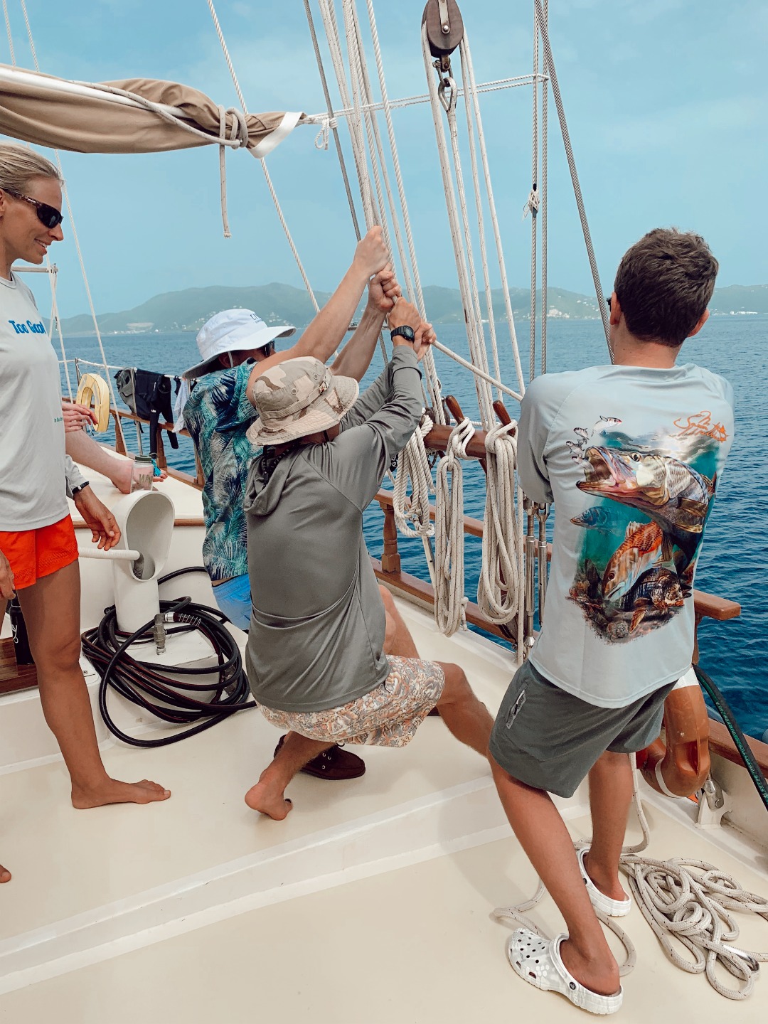 Day three is almost gone, and everyone is getting better at their jobs. Today was a new day with new things to learn. Early mornings are always hard, especially after having a long anchor watch the night before. The squalls that trolled through at midnight and 4 am didn’t make the anchor watch much fun for everyone. But the day gets better when you have a delicious breakfast. I had some delicious gluten-free banana bread muffins because I couldn’t have the delicious pumpkin bread. It’s nice to see that in three days, we are getting to know everyone pretty well. Today, I finally learned everyone’s name. This morning, Carolyn taught us a lot of new things. We learned that ropes, once they are on a boat, are now called lines. We learned how to work with those lines on pin rails, and we practiced “sweating,” which is what you do to raise a sail. Or, in this case, a person, because we raised and lowered Amy up the mast in the bosun’s chair. Learning a few things about sailing was exciting and new, although understanding all the new terms is getting pretty hard. So after that, we were ready to set off to Mountain Point. The trip was short, and I was on the helm, which made it even better. So far, that has been a highlight of my trip. I am impressed by how fast everyone is learning.