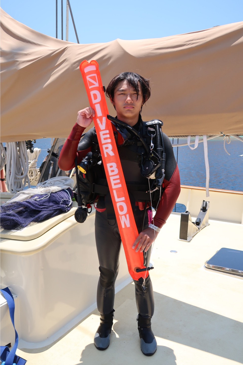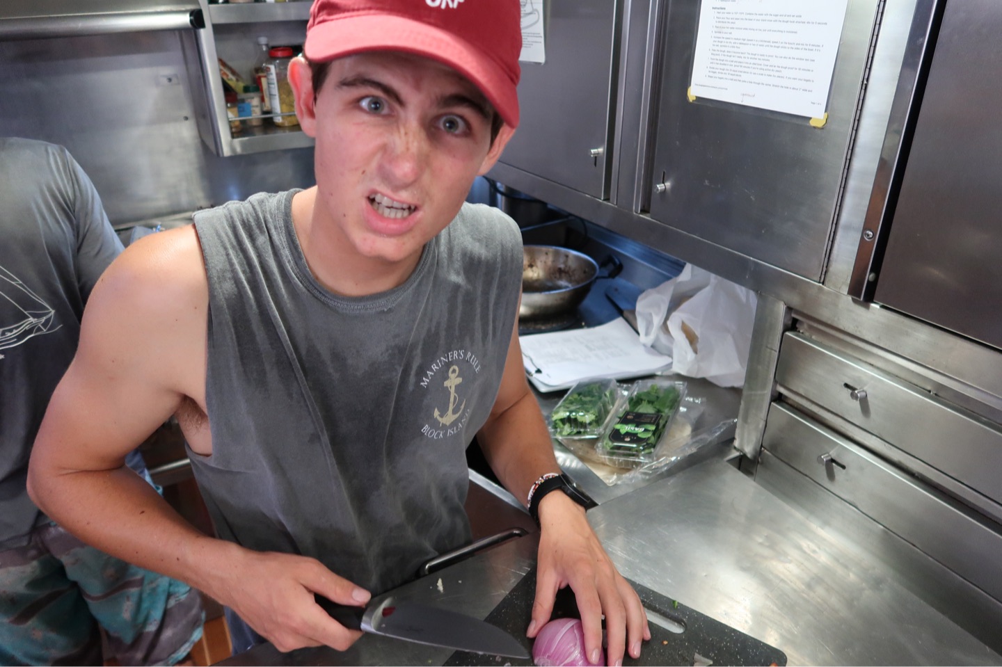Since we were divided into two dive groups, those not diving at the time took the opportunity to catch up on rest, homework, or just relax for a while. Ava and Hannah swam to a nearby beach and explored before sunset. Bodhi, Charlie, and Allie spent a good portion of the day in the galley cooking up some delicious meals (and accidentally setting off the fire alarm). Phillip and I took a nap above the chart house under the shade of the sun cover. Ainsley worked all day on the last of her open water diver requirements and is now certified (congratulations!!). Ali and Juliet practiced their jumps/dives from the ship before dinner, as well as swimming over to a nearby boat (with Kiley, Ava, Hannah, and Bodhi) to make friends with our mooring neighbors.