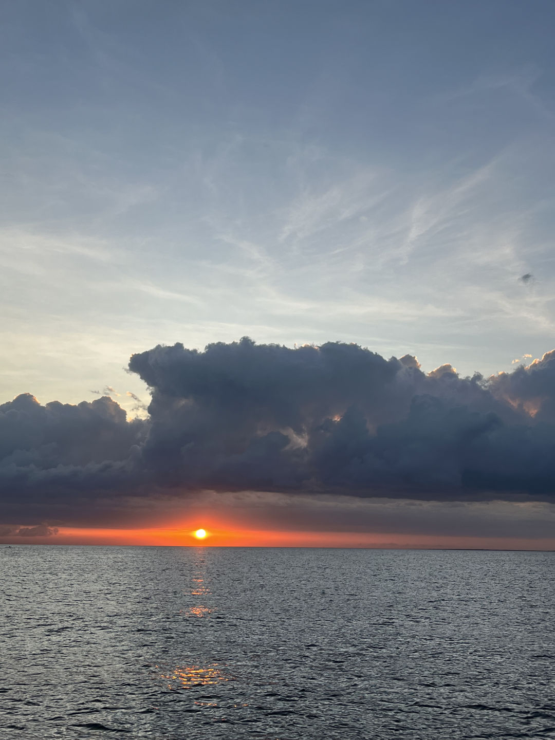 Before dinner, I was sitting in the cockpit with Kee, Larkin, Dray, Tom, Margaret, Smash, and Ben, thinking about how I am going to start writing my note to each of the people on this boat. It feels so strange to start thinking of goodbyes. This boat and these people have become my day-to-day life, and I can’t really comprehend that I will not start and end each day with these faces I have come to adore. Dinner featured a truly astounding sunset. One of the best. We all sat in the cockpit before filling our plates, listening to Kee’s music playing softly in the background and watching as the sun, a glowing red orb, sank into the sea. We shared a moment of quiet together, appreciating our last dinner at anchor. For squeeze, I asked each person to share a funny story or memory about the person sitting to their left. What ensued was a hilarious recap of the truly comedic moments we have shared as a crew. My personal favorite was when Dray twerked at me underwater while we were surfacing from a dive, causing me to laugh so hard that I used 500 psi.
