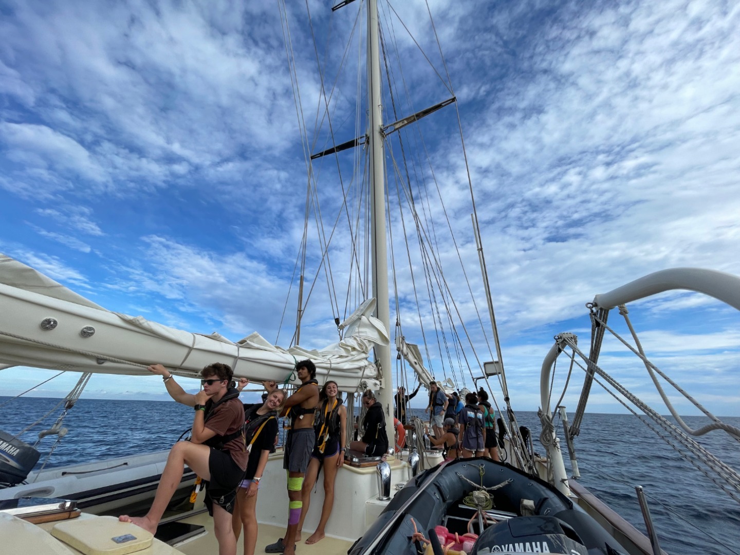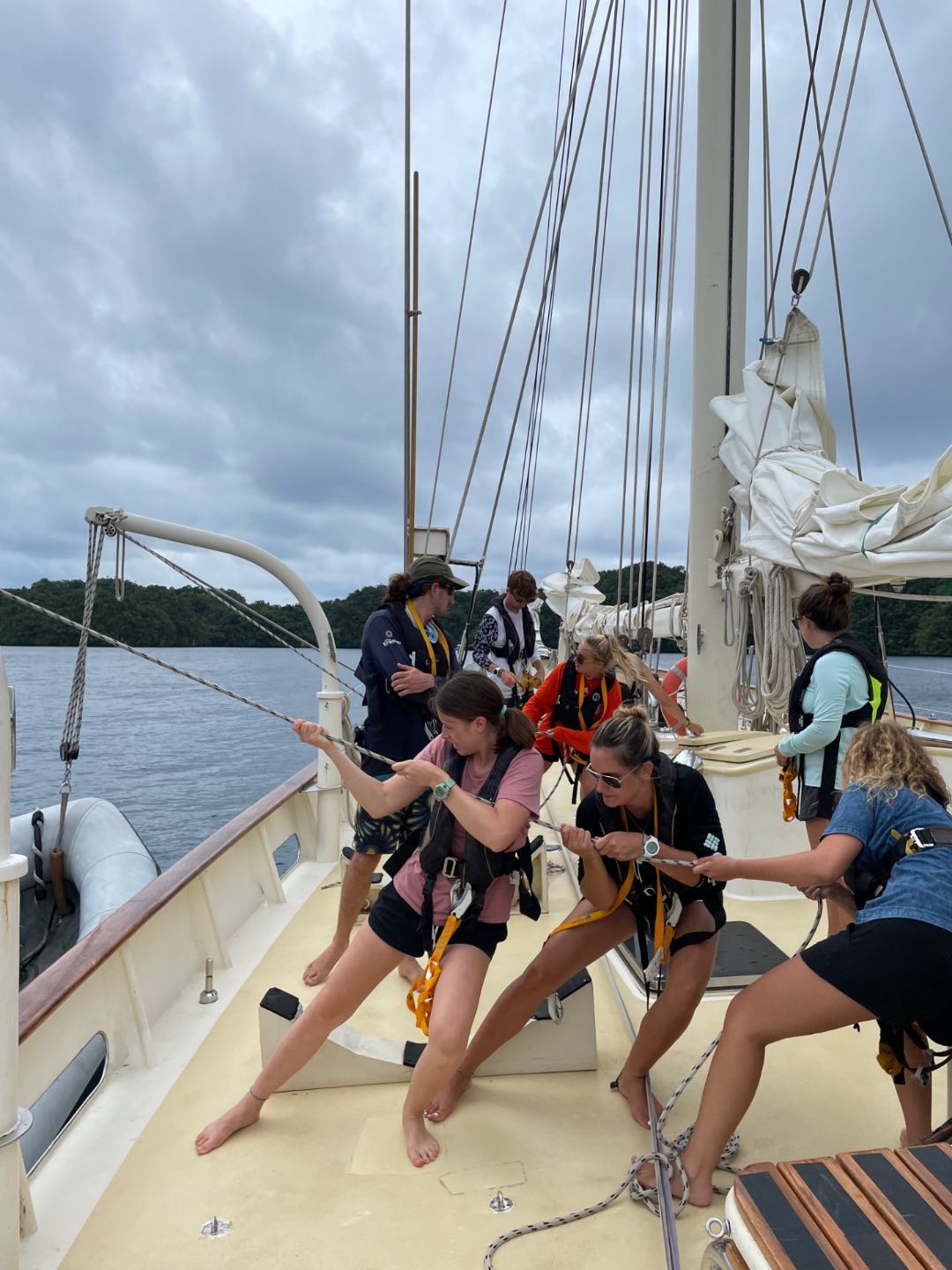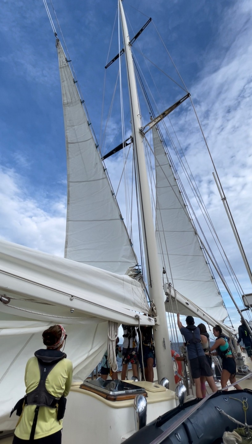 We got all of the jobs done that needed to be done before lunch which was amazing. Around 11, everyone started hanging out on deck, in the salon, or hanging out in their bunks with fans. At 12, we had lunch, many peoples’ favorite lunch so far, homemade chicken nuggets! As a vegetarian, I had a yummy bean salad. I never thought of the possibility of a bean salad. It was pretty good! Then after lunch, we got right back into passage prep and finished our last few things on the checklist. After everything was 40/40 and Tim was back from clearing us out of Palau, we pulled up our anchor! Everyone was taking in our last few sights of beautiful Palau for a while. I can confidently say that everyone wants to come back in the future. We used the engine to motor us out until we got past the outer reef, where we were able to hoist the sails for the first time! Everyone was so excited to get them up!