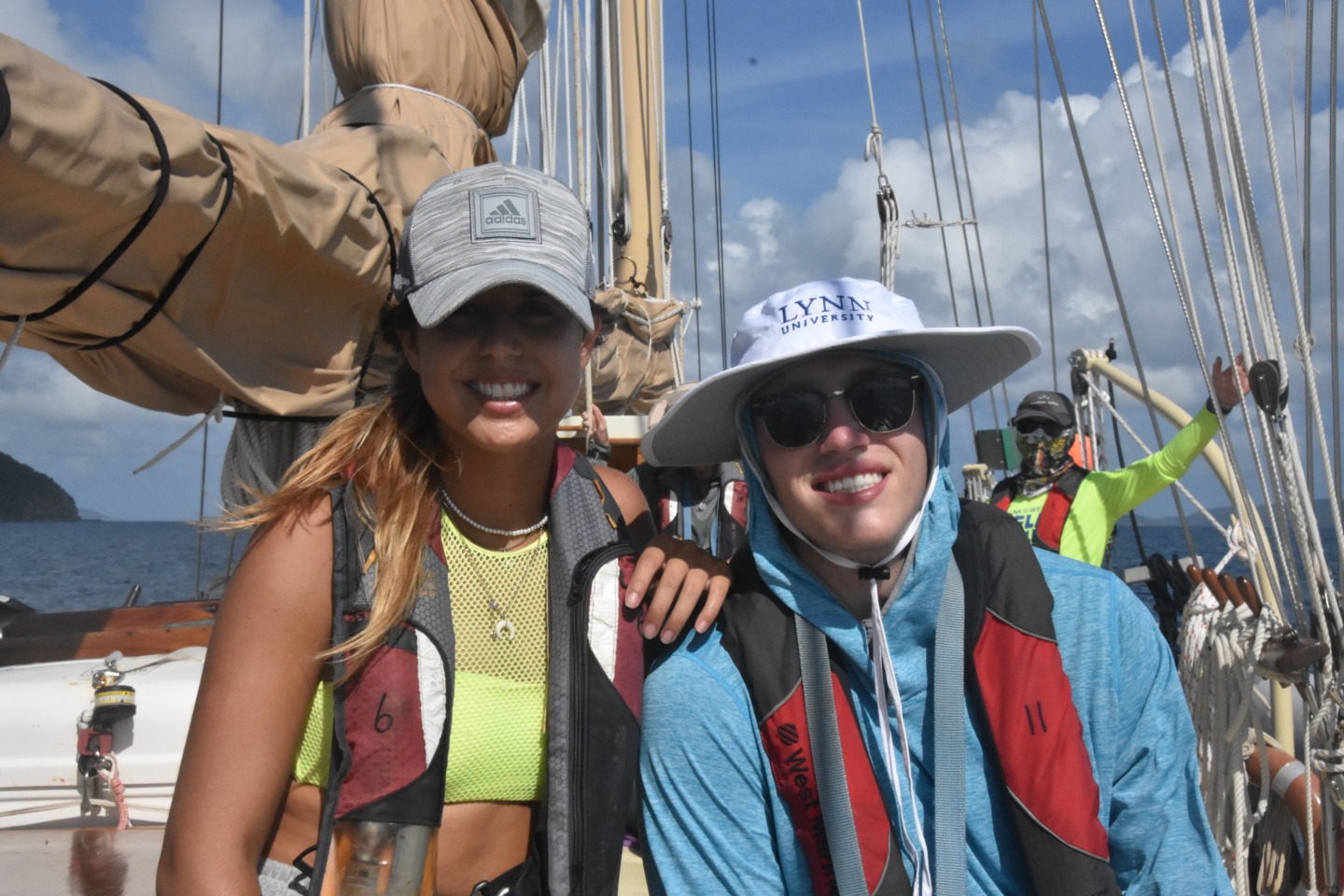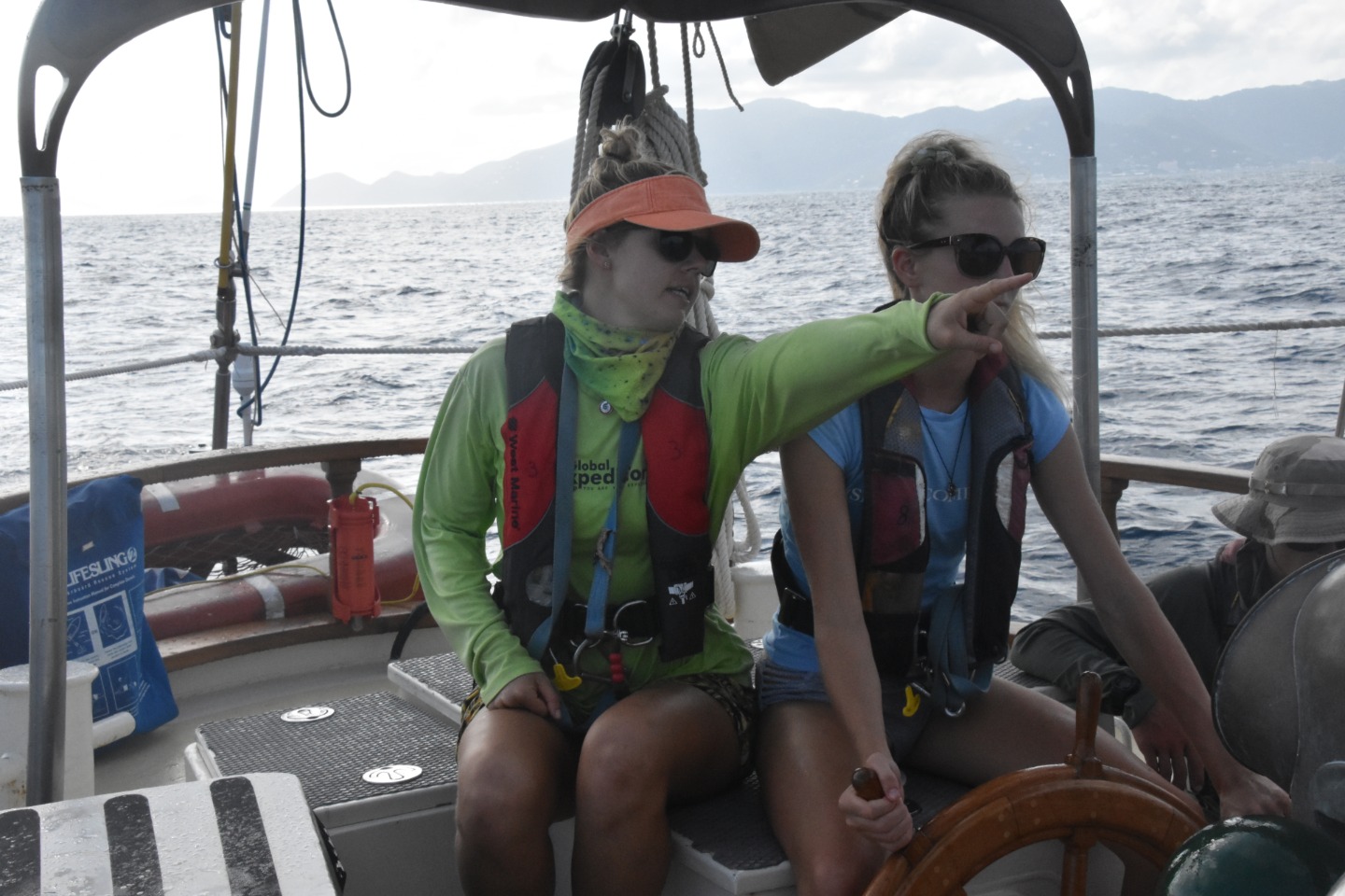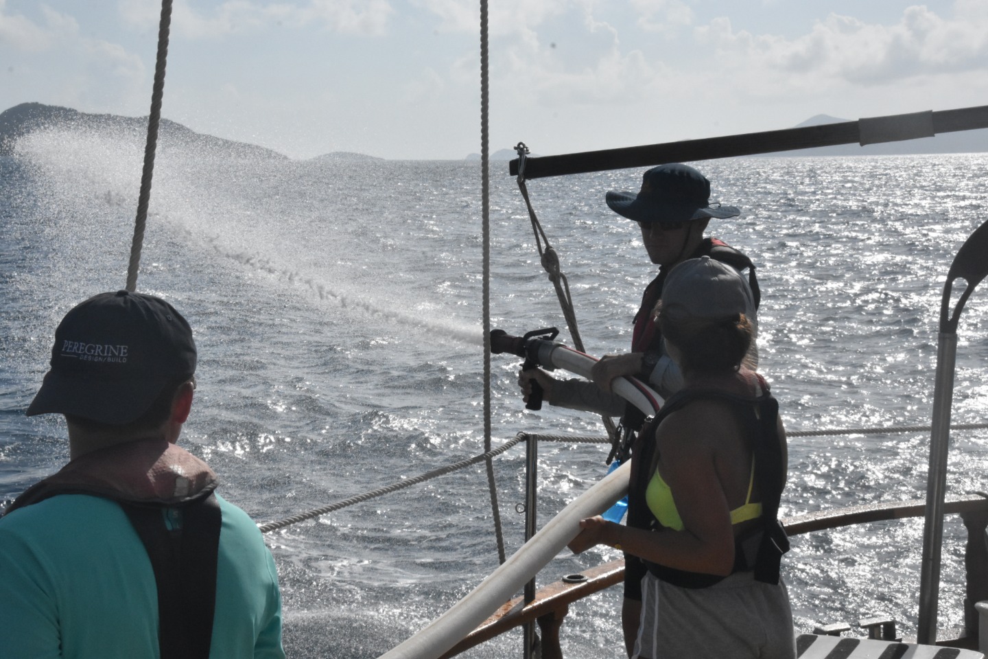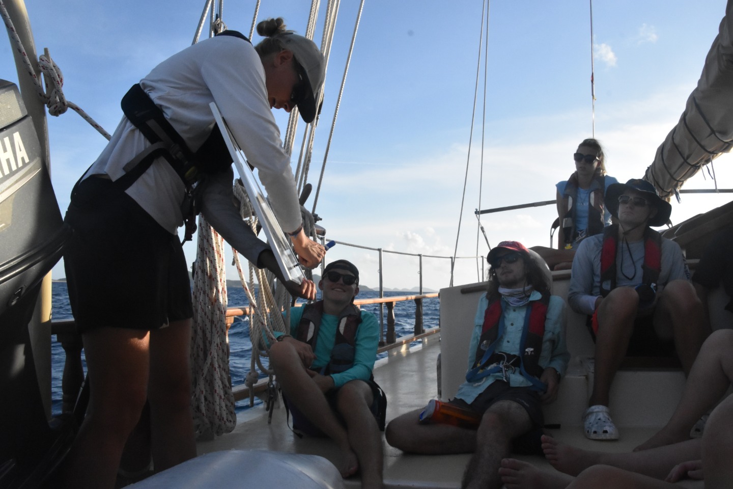 Today we finally woke up to blue skies and sun. After breakfast, we started with class, taking leadership quizzes to learn about our personality “colors” and figuring out how those dynamics can help us work as a group. After class, we took a trip to Omar’s Fusion cafe and had a quick smoothie and coffee break. We then had our first class of Marine Biology! Once lunch was served, we were finally ready to leave Tortola after three unexpected nights in the pouring rain, waiting out the tropical storm at the dock. We started our three-hour passage by learning about emergency drills and practicing with the fire hose. A seamanship class was then taught underway by our captain Carolyn. We learned about the six different sails on the ship the mainsail, fisherman sail, staysail, jib sail, flying jib sail, and foresail. We learned about rigging in hopes to set sail soon. For the remainder of the passage, we got to hang out and have fun listening to Brit play his guitar. After we arrived in the North Sound, Virgin Gorda, BVI, we ate mini pizzas for dinner while watching the distant lightning storm under the stars.