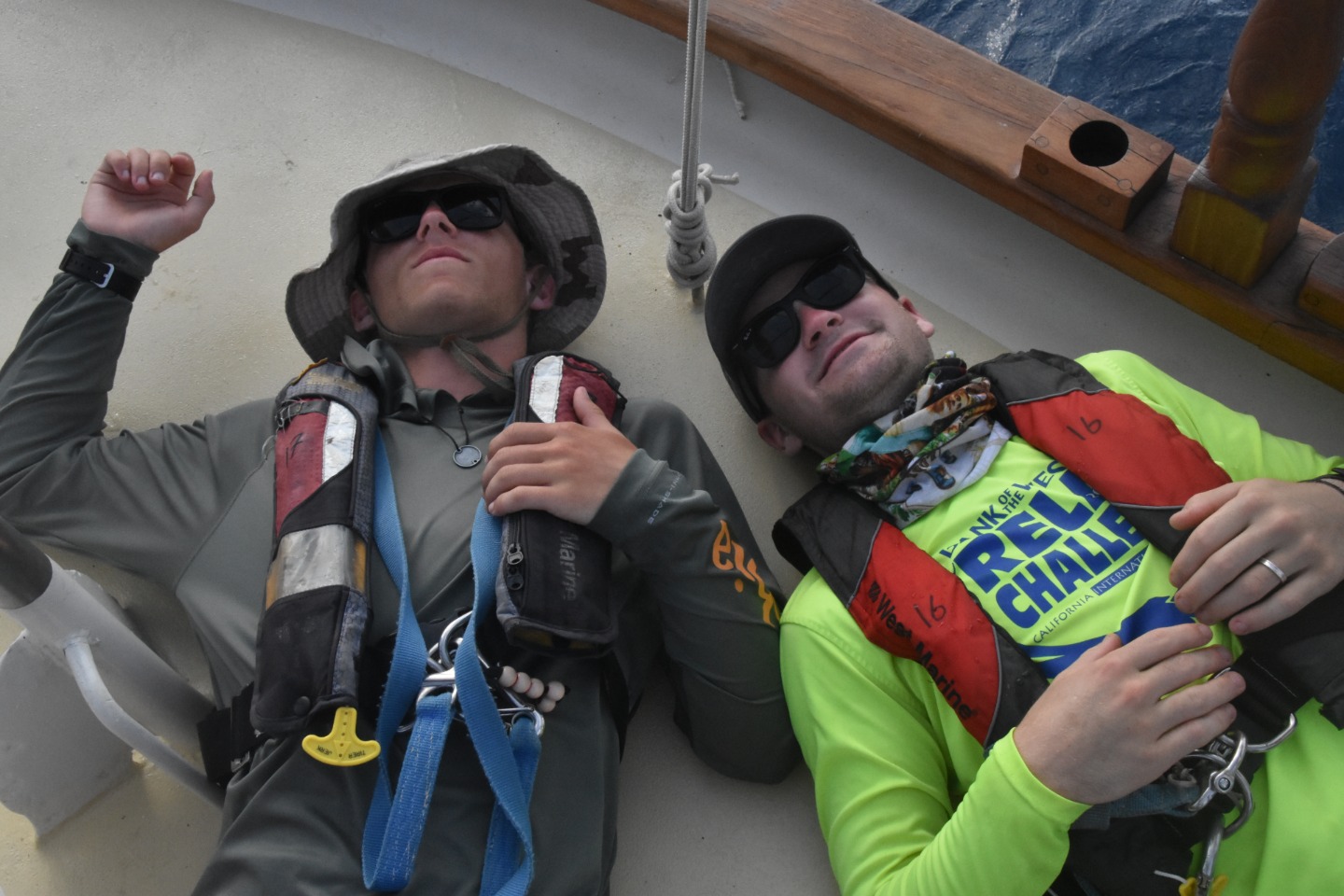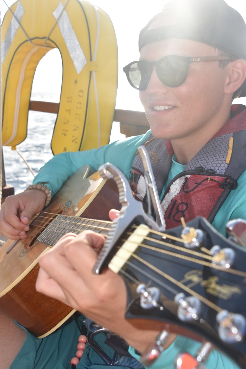 Pictured: 1. Amy is teaching Jade how to steer. 2. Josh tanning. 3. Carolyn teaching students about the sails. 4. Nate steering. 5. Kaiden and Joseph relaxing. 6. Miranda and Eli 7. Steffen is practicing with the fire hose. 8. Brit is playing his guitar.