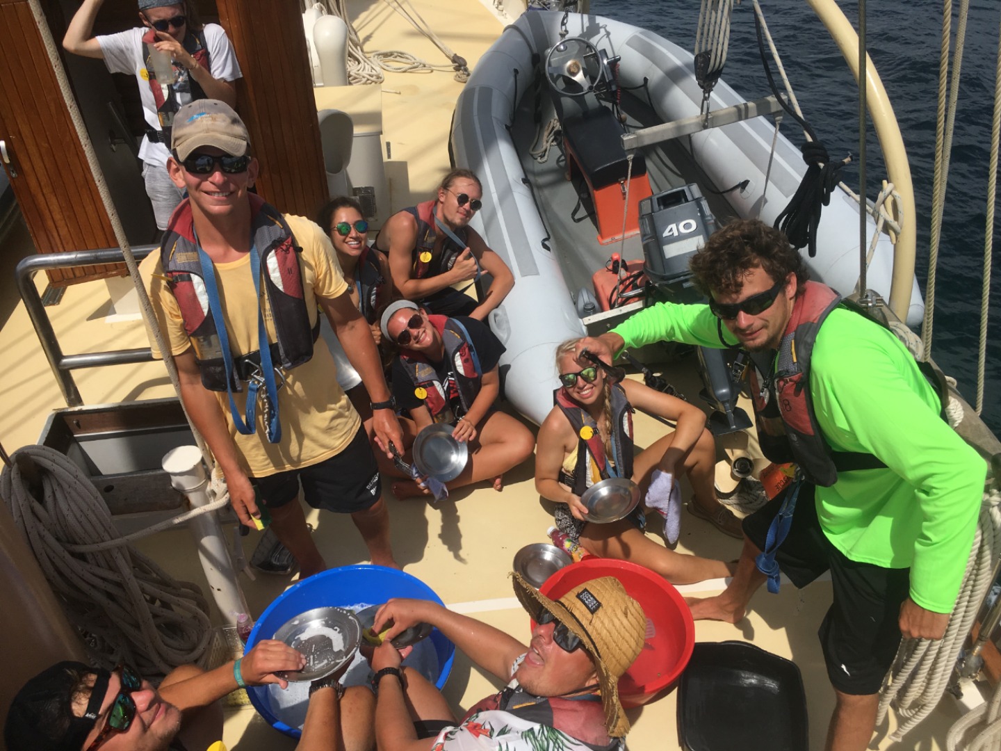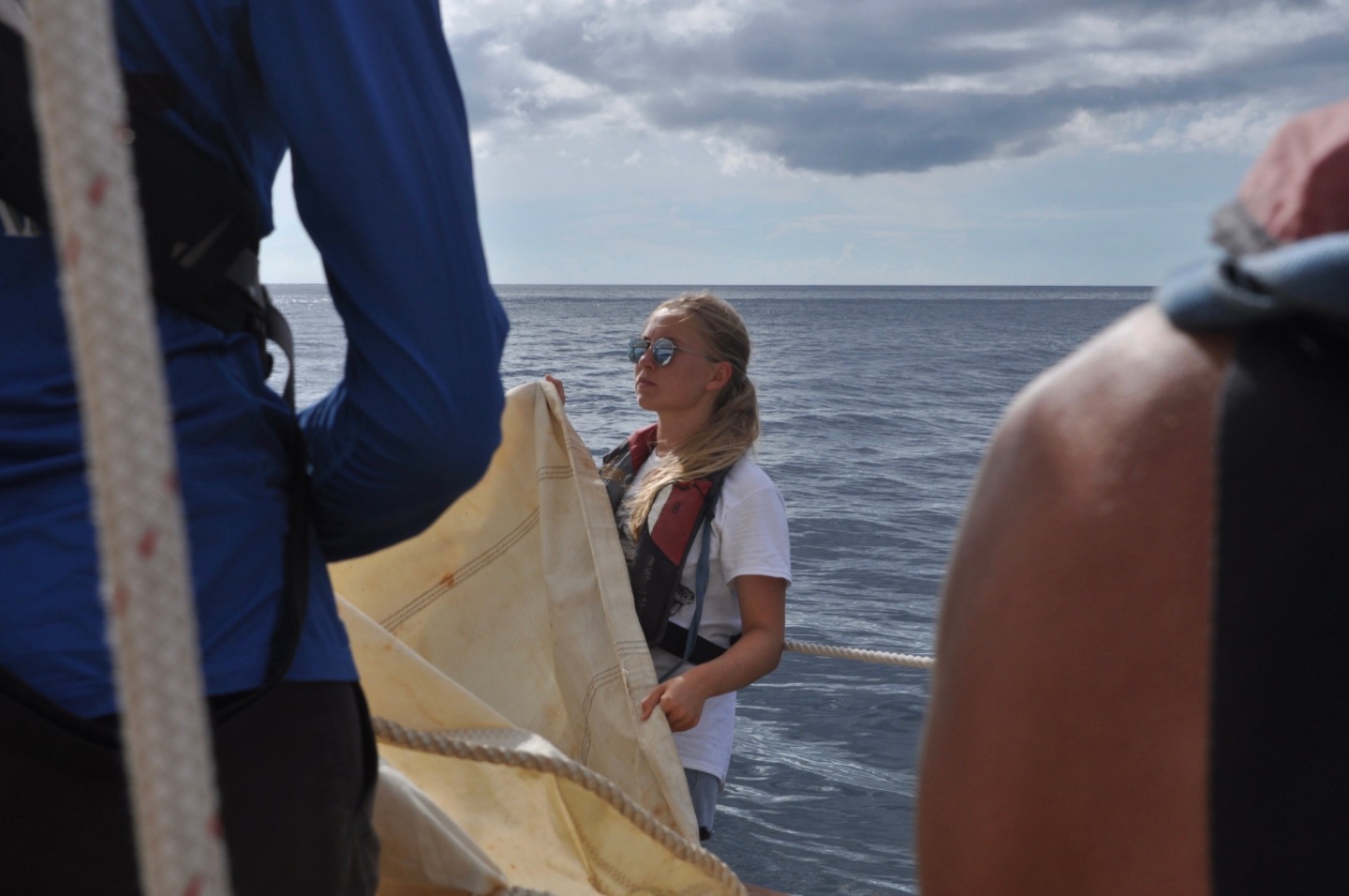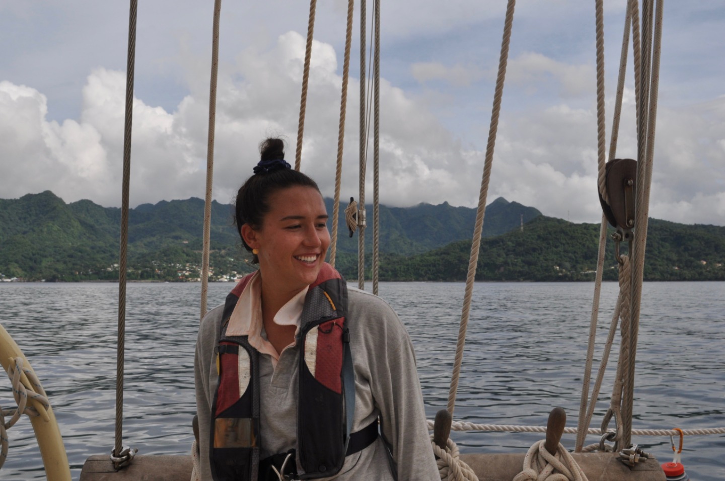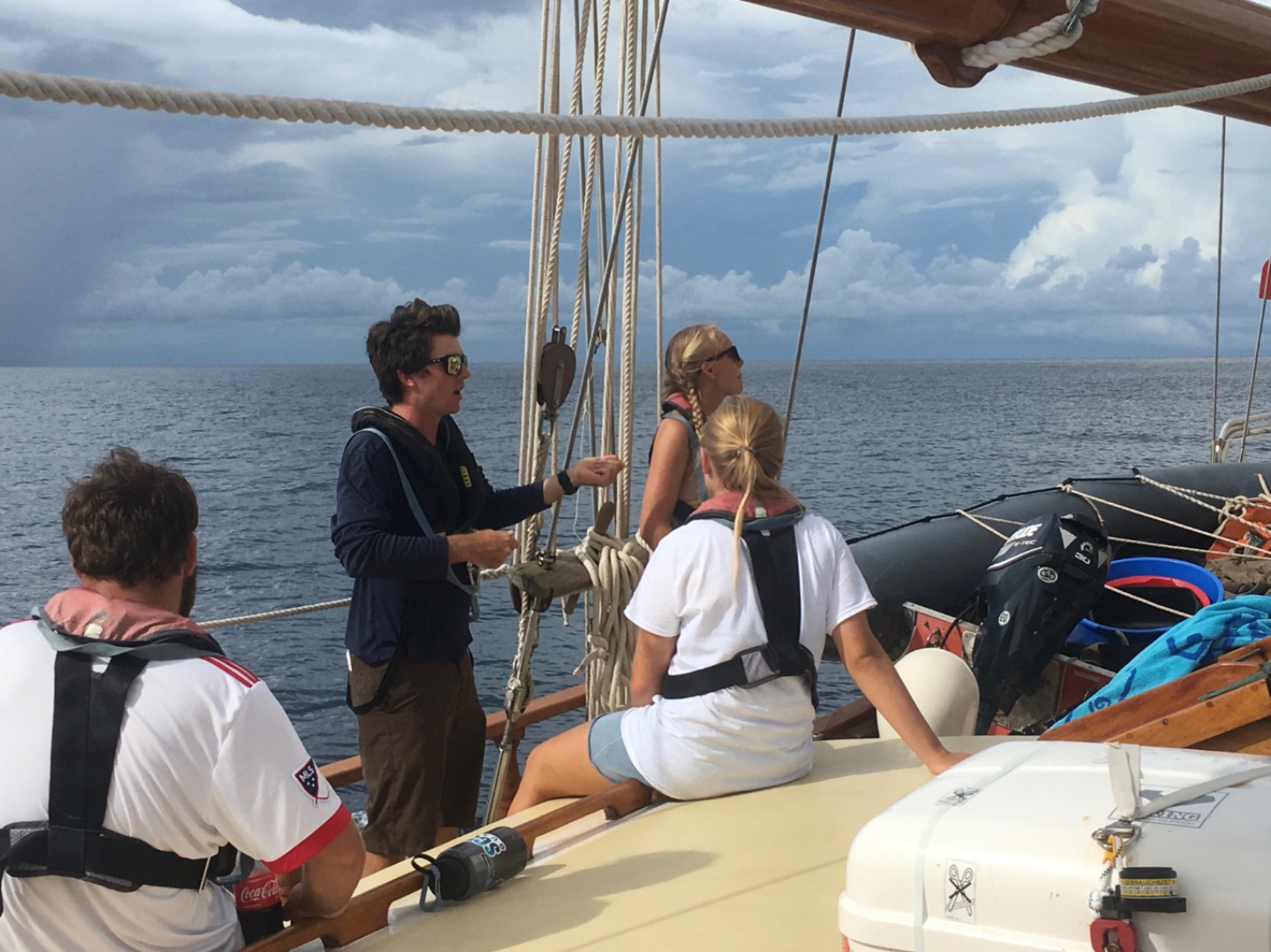 We cannot direct the wind, but we can adjust the sails to coax the boat into plying these warm tropical waters. We began the day with a bit of a late breakfast of fried potatoes, bacon, and eggs. Steve taught a marine biology course after breakfast, which allowed the laundry lady onshore to fold the last of the ship’s linens. After class, the students prepared the vessel for passage to Carriacou while a small group went ashore to pick up laundry and propane. Once all were back aboard, we tried something different this go around and attempted to raise sail and recover the anchor at the same time. The first mate, Carolyn, took the helm, and the Captain went forward to supervise the sail raise and anchor recovery. All went very smoothly, and Ocean Star recovered her anchor without using her engine, which is quite an accomplishment for a fledgling crew. The past weeks have molded the crew into a strong team capable of achieving great success when cool heads prevail and all knuckle down to work. That strong spirit paid off in spades today as we gybed our way around the southern coast of Grenada. Once in the lee of the island, the wind became a bit tricky and light, so we took the opportunity to drill the crew in flying jib use. After the students learned to set the flying jib and sheet her home, we moved on to the fisherman sail, which occupies the space between the central and foremasts. This sail can be a bit difficult to handle as it has no spars to control it, and when fully raised, it sits high in the rig where the wind is most active. The students hoisted the fish up handsomely, and for about an hour, Ocean Star cruised behind the lee of Grenada under sail alone. With all her sails up, Ocean Star is picturesque and would make a beautiful painting. As we approached the headland on the north shore of Grenada, we brought in the fish and stowed it below. The wind picked up as we poked our heads out from behind Grenada. A storm loomed on the horizon and moved over Carriacou, shrouding it in a dark curtain of grey rain.