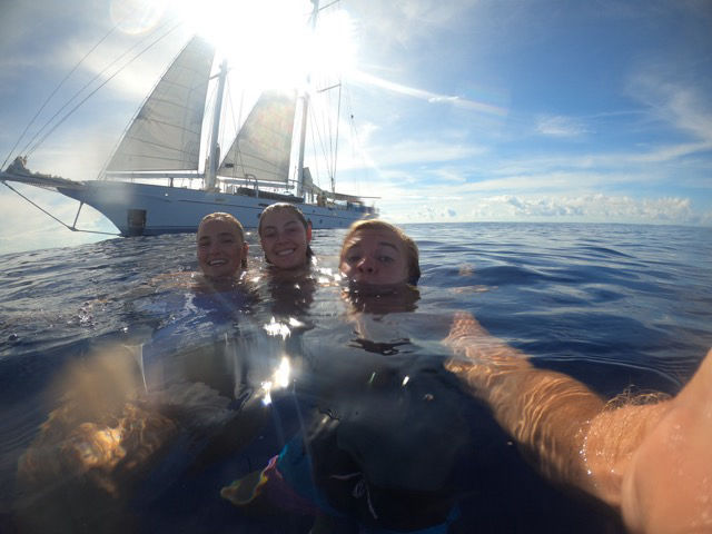After our ocean swim, students enjoyed on-deck showers, and then we got back on the road to Palau. As we continued to head northwest in a flat glassy sea, we watched as a lone dolphin on a reciprocal course slowly passed by, headed into a double rainbow off our stern. It was a pretty magical moment. We ended the day with our traditional squeeze, where we went around and said what we appreciated most today about the day. For most of us, it was the ocean swim, and we answered a question the skipper came up with.