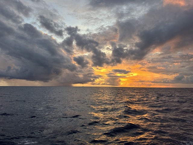 We are two weeks into this passage now, and at our current speed, it’s looking like we have about a week to go! Morale is fairly high onboard after our equator crossing shenanigans yesterday and mini 4th of July celebration featuring Justin’s delicious apple pie. The apple pie was a little bittersweet to eat as it officially marks the end of our fresh fruit rations onboard. I think we still have a couple of limes left, but it’s slim pickings, and I am sure we’re all dreaming about the fresh fruit and vegetables that are hopefully awaiting us in Palau.