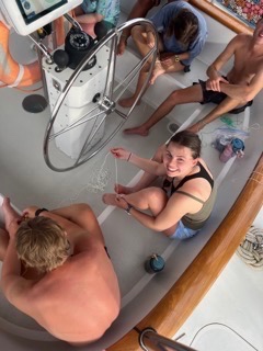 Now, in terms of all the fun activities and meals we had today, we started this rather action-packed day with the breakfast of champions: eggs, bacon, rolls, and lots more. After this, the non-certified divers continued their training. This was done at a shipwreck site. Read until the end to hear some great news! During this time, certified divers took out the smaller sailboat and followed a knot class.