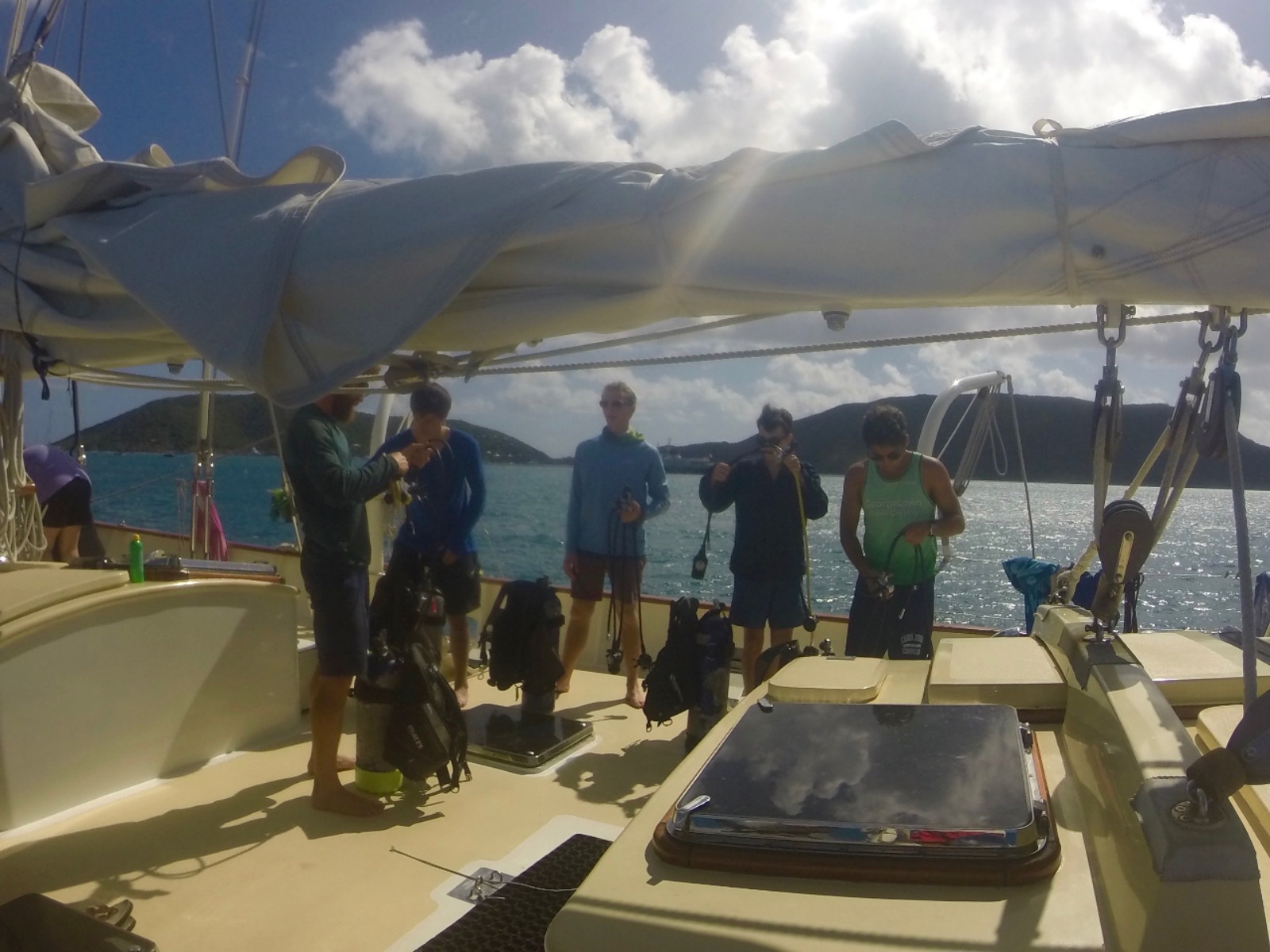 I got the privilege to wake people up at 7 am because I was the skipper. Everyone gathered up on deck for our swim test. We had to swim four times around Argo and then tread water for ten minutes. I think it was very refreshing to go for a swim in the morning. Some of us did swallow a decent amount of saltwater, but then we ate pancakes for breakfast, so we were all fine! So there were basically two groups today: the non-scuba certified students and certified students. If you were a non-certified, in the morning, you had knowledge review from the information you had learned the day before and then took quizzes. You also set up gear in the afternoon and finally got to go in the water and practice safety drills. In the evening, you had to watch two more scuba videos. Yay!… or not. Sitting through those videos may not be fun, but it is so worth it in the end. Your first breath underwater is magical.