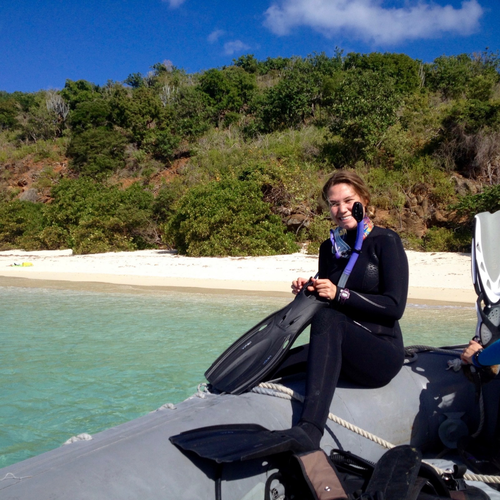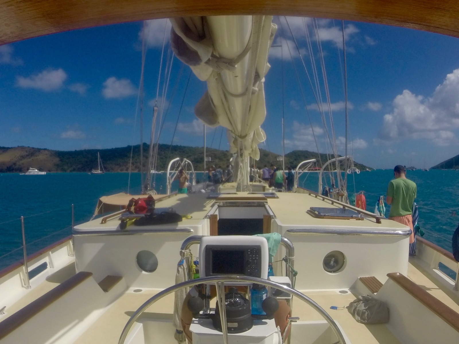 If you were a certified diver, in the morning, you had a review of how to set up scuba gear and how to check it. In the afternoon, you could either stay on the boat, study for something, go on the beach, snorkel, and/or go on a hike up a small hill. I went up the hill, and it was beautiful! Once everyone was done with whatever they were doing, we all gathered back on board. We took “showers,” aka jump in the water, get back out, shampoo and wash, jump back in the water (repeat if you use conditioner) and then rinse off with fresh water with the hose. It’s actually quite refreshing. A couple of people wanted to stay in the water. After that, we relaxed on the deck, listening to music, reading, or talking. We then ate dinner in the cockpit like the two nights before. Every night we do something called the squeeze. Everyone holds hands, and the skipper asks a question- it can be anything as long as it’s Seamester appropriate. Mine was “what is one weird/interesting/fun/random fact about you?” We definitely got multiple good laughs! To end the squeeze, you squeeze the hands that you are holding and then invent some sort of clap. Mine was tapping your thighs, clap and snap. It’s your time to be creative!