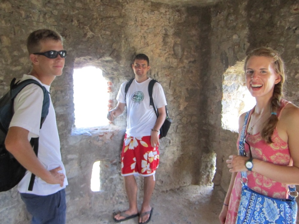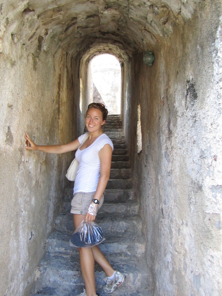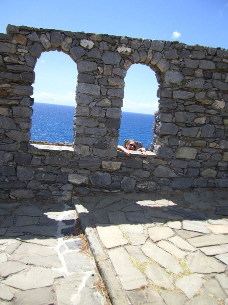 Amazing food and incredible scenery were the order of the day today. Still on the dock at La Grazie, waiting for our newly repaired sail to be delivered, we got the chance to explore the nearby town of Porto Venere – world famous for its pesto. A short bus ride around the headland (made particularly short by the wonders of Italian driving) took us into the center of the small town. From there, we explored… firstly, the options of a second breakfast as if the delicious scrambled eggs and hash browns served up by Chef Casey this morning weren’t enough. Porto Venere has numerous attractive features to discover. A touristy and picturesque waterfront gives an impressive first view of the town, made up of tall, multicolored, and multi-shaped buildings lining a quaint harbor filled with small boats, pebble beaches, and even a small water polo pitch. At one end of the waterfront, the path leads up to an unusual, small, striped church perched right up on the cliffs. The short stroll up to it is rewarded with breathtaking views along the jagged, azure coastline. There was a surprisingly large difference between the turbulent water out to sea and the calm, protected natural harbor. Large stone walls with arched, window-like openings provide opportunities for budding landscape photographers and amusing poses alike. The other end of the waterfront leads around to a narrow street that traverses up through the center of the small settlement. A mishmash of trinket stores, small restaurants, and pesto/pasta shops line either side, providing an overpowering delight for the senses, with flashes of bright colors, wafts of freshly made pizzas and pastries, the deliciousness of pesto-covered bread samples, snatches of melodramatic conversations of local Italians and a warm Mediterranean breeze on the skin. All this exploring could only lead to one thing…lunch. What else but local seafood, pesto, and pasta? It would be a crime not to! A few steps along the street led to dessert – sweetbread pie filled with Nutella and fresh strawberries – heaven. After such culinary indulgence, some exercise was definitely called for, so to walk off our lunch, we headed up the narrow alleyways and staircases, weaving our way to the top of the hill to investigate the castle. Once again, we were rewarded with breathtaking views, a majestic, almost Gothic church, and numerous photo opportunities. The striking castle would surely have deterred many assaults on the town during more tumultuous times. Nowadays, however, it houses a display of modern art, which is a stark contrast to the structure that protects it. Eventually, it was time to return to our faithful Argo for hot shore showers, a delicious roast chicken dinner, and an informative science class on scientific writing to prepare the shipmates for their literature review projects. For now, it is time for a full night’s sleep without an anchor watch in preparation for whatever adventures tomorrow may bring. Ciao.