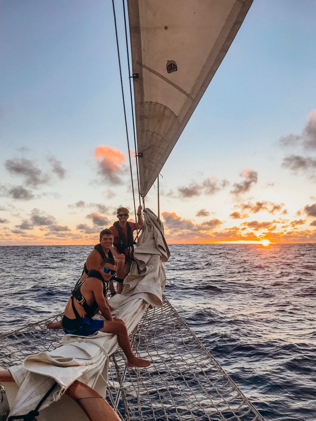 Pictured: Evan, Garrison, and Frank on the bowsprit.Panos at the helm; Tim and Kari doing a boat check in the chart house under the red light at night.