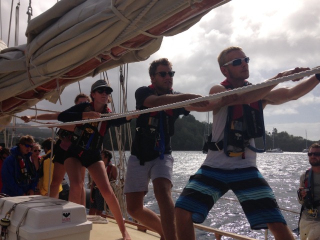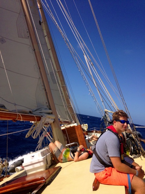 The day started at the usual time with a hardy breakfast of granola, yogurt, and fruit salad. Then, the organized chaos began to take away. Our goal was to get the boat ready and sail up by 10 am, and it was 8 am by the time we had finished eating. The lines need to be coiled and capsized, the hatches dogged, and the engine room checks completed on top of a long list of other tasks. The crew worked hard to get all this done by 9:15 am. We mustered in the cockpit for the briefing when Ben told us we would be trying something new today. We were going to try and get all the sails up and out of the bay without turning on the engine. Up went the mainsail first, then the foresail. Next, we had to lift the anchor and get the staysail up, and then we were underway. The wind could not make up its mind on how it wanted to blow for most of the day, but for a big part of it, we were living life at 25 degrees. Life at 25 degrees can be tough – the cooking crew was down there preparing lunch while trying to stand up straight, and even sleeping can be a challenge. Some people rolled out of their beds while others were pushed down to the bottom of theirs. The sea was choppy for part of it as we saw a couple of 10-foot swells that got the bow watch team soaked. By 10 pm, we had the sails down just as easy as they came up, and we tied onto a mooring ball. With tired eyes and salty skin, everyone headed to bed, anticipating what St. Lucia would bring us in the morning.
