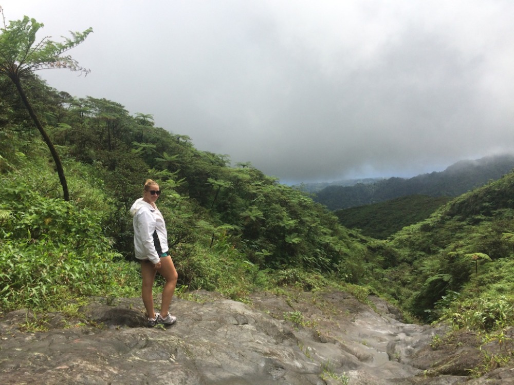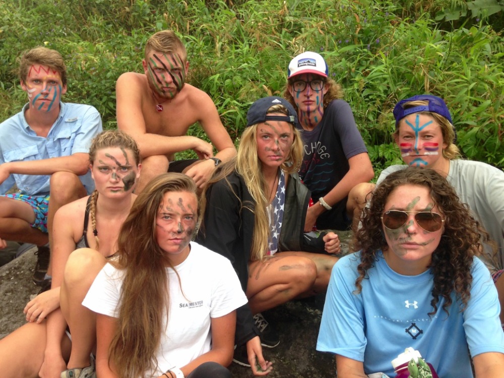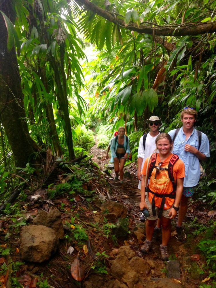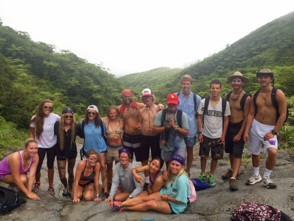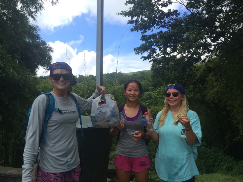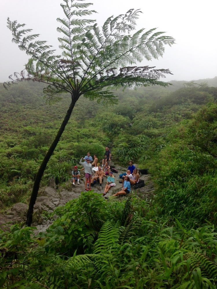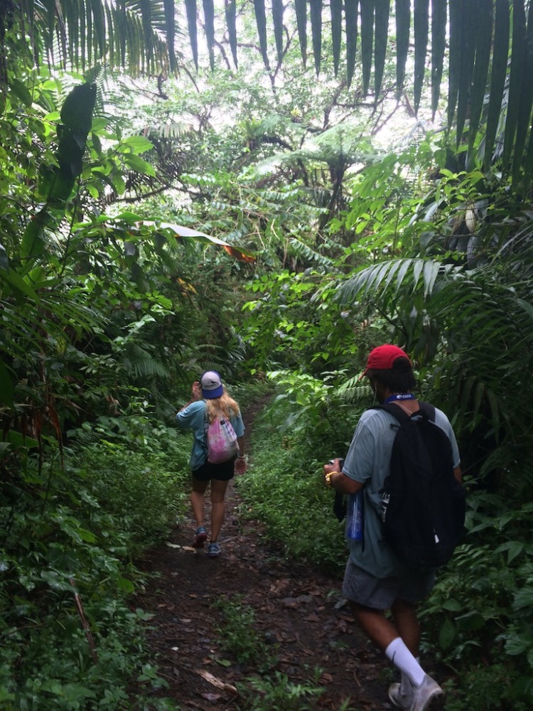 The hike was awesome; this is probably my favorite hike we do on the trip and one of my favorite hikes I have ever done. I love how, as we hike, we go through such different habitats and terrains. We started out hiking past clusters of huge bamboo, then through the lush rainforest, listening to the sounds of birds along the way. Next was through the palm brake, with big umbrella-like palms and ferns along the way. We took a break on the rocks in a dry river bed to munch on some trail mix and drew some war paint (colored zinc sunscreen) on each other’s faces. Eventually, we hit the trail again and made it up through the tree line into the elfin woodland (yes, that is the official term), which also happened to coincide with coming up into the clouds that formed at the peak. During the last 15 minutes of the climb, we felt like we were in another world, with beautiful flowered low-lying plants growing between the rocks and dirt and fog coming in and out, so sometimes you would only see the outlines of your fellow hikers. We finally reached the top, and everyone was in awe at the view down into the crater, which was huge, green, and just plain amazing. We just hung out and enjoyed the scenery (and our sandwiches) for a while, then headed back down for the return hike, picking up some litter on the way.