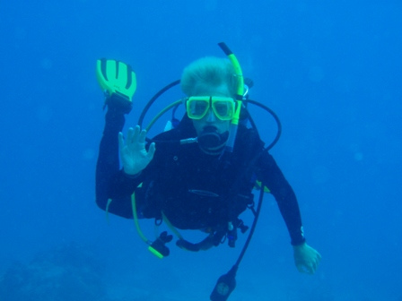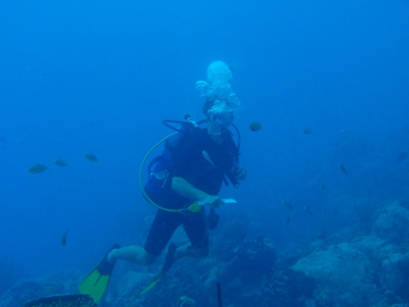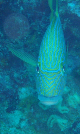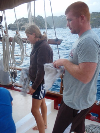 We started the day with a thorough BA to give Ocean Star a bit of polish in glitzy St Barths. We motored in the rain into the town of Gustavia through a bay full of yacht moorings. From a distance, the town looks very low-key and similar to the ones we visited in The Saints: small white tropical cottages built up the hill, with old wooden doors and shutters and topped with red roofs. When we got closer, however, we found that nearly every one of those quaint buildings housed high-end luxury stores like Yves St Laurent, Cartier, and Prada. It being Sunday, most were closed, but we were able to find a few restaurants open for lunch, and many shipmates loaded up on baguettes and French cheeses. Back on Ocean Star, a group of shipmates went diving at Gros Islets, a group of small rocky islets that sit at the mouth of the harbor right next to where we’ve anchored. We saw Nassau Grouper and several students were startled by a huge blackjack that swam by them, looking for food in the shallows. Tonight, we’re watching “Making the Call,” a video about surfing the extremely big waves (60-80 feet) off Hawaii and California and we’re looking forward to our own much smaller-scale surfing excursion tomorrow morning.