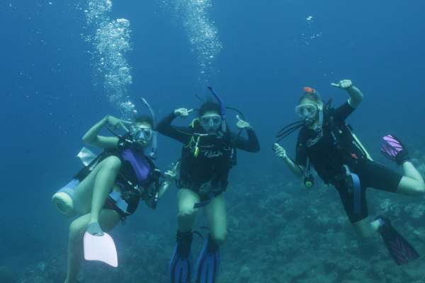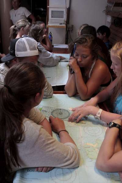 We arose to the smell of pancakes and chocolate. After breakfast, group one was straight off to go diving with Saba Deep. Their boat pulled up next to ours, and we jumped across with our dive bags. The first group, comprised of Tici, Paige, Sven, Max, Zach, and Brittany, was the smaller group and was joined by two other Dutch divers. The first dive site was called Third Encounter, and we saw two sharks, one nurse shark, and a Caribbean reef shark. The nurse shark swam right up to Tici and Max while the Caribbean reef shark glided past us. This was the deep dive for the Advanced Open Water divers, and we went down to 110ft/29m. Then, the second dive was at Ladder Bay, where there were normal turtles, but unfortunately, we didn’t see any. However, the other aquatic life definitely made up for it. The other group on the boat had some time for chart work as the test was coming up soon. Group one then came back to O-Star, and group two then came on the boat for their dives. They had a slightly different dive as they went to Third Encounter and Babyleon, they got to not only see the sharks, but also a turtle. While they were gone, group one had their chance to do some chart work. Group two got back around 5, and then it was time for the chefs to cook again. The meal was one of everyone’s favorite things on the trip. Tonight, we plan to sail back to the BVI due to an approaching storm.