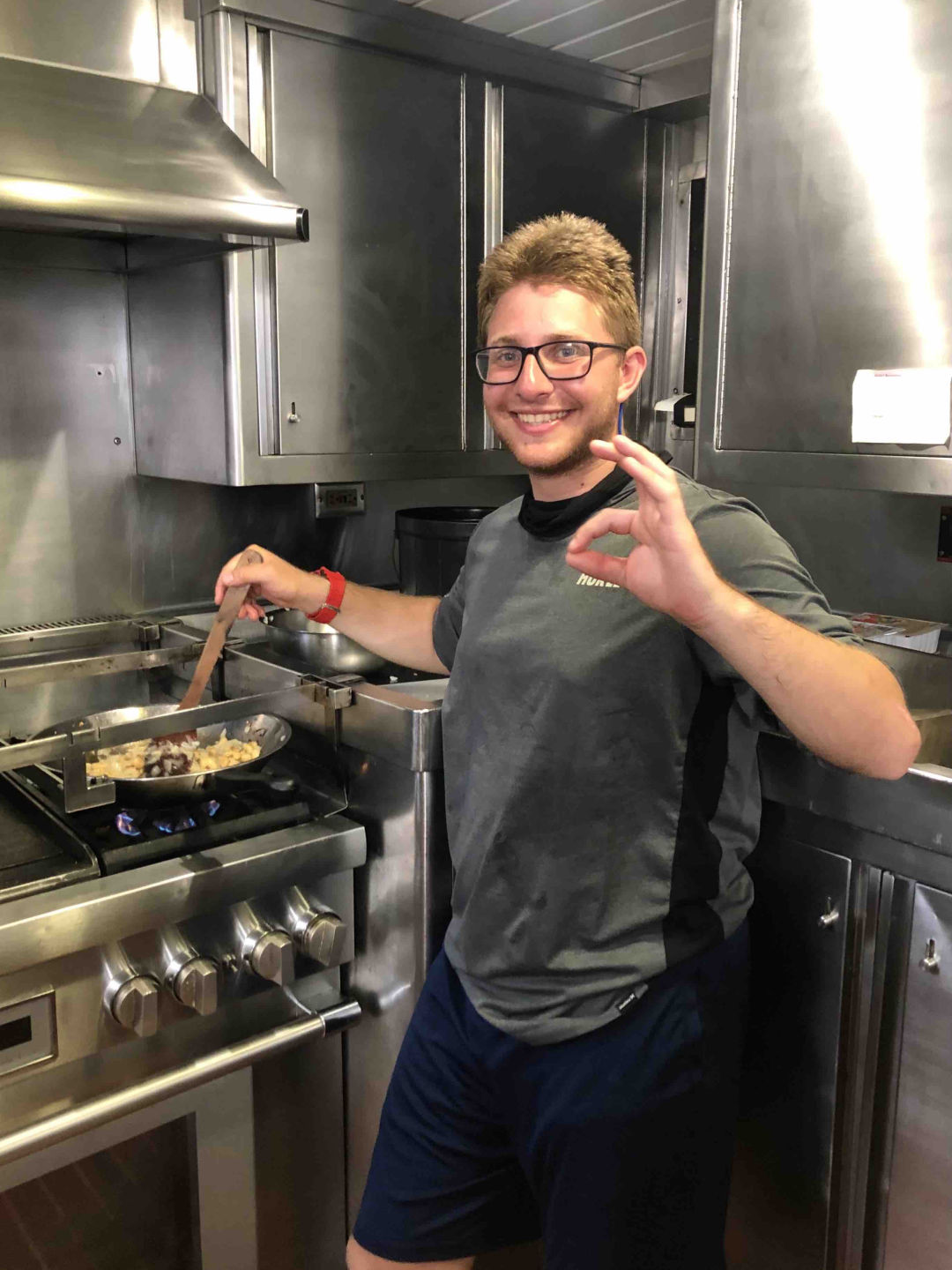 While dinner was a little on the latter side today, good food can’t be rushed, and that’s certainly what our Head and sous chefs gave us. As I write this, at 19:39 on July 8th, a beautiful sunset is beginning to develop and bathed in its golden rays. Our dishy pit is alive with music, splashing, and laughter. It’s a good time to be sailing across the Atlantic, even if we have no wind.