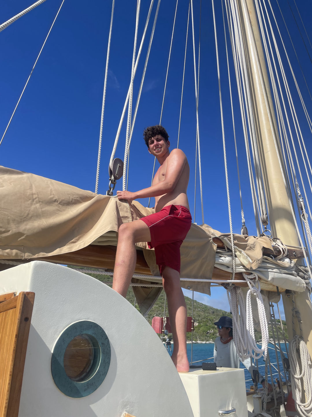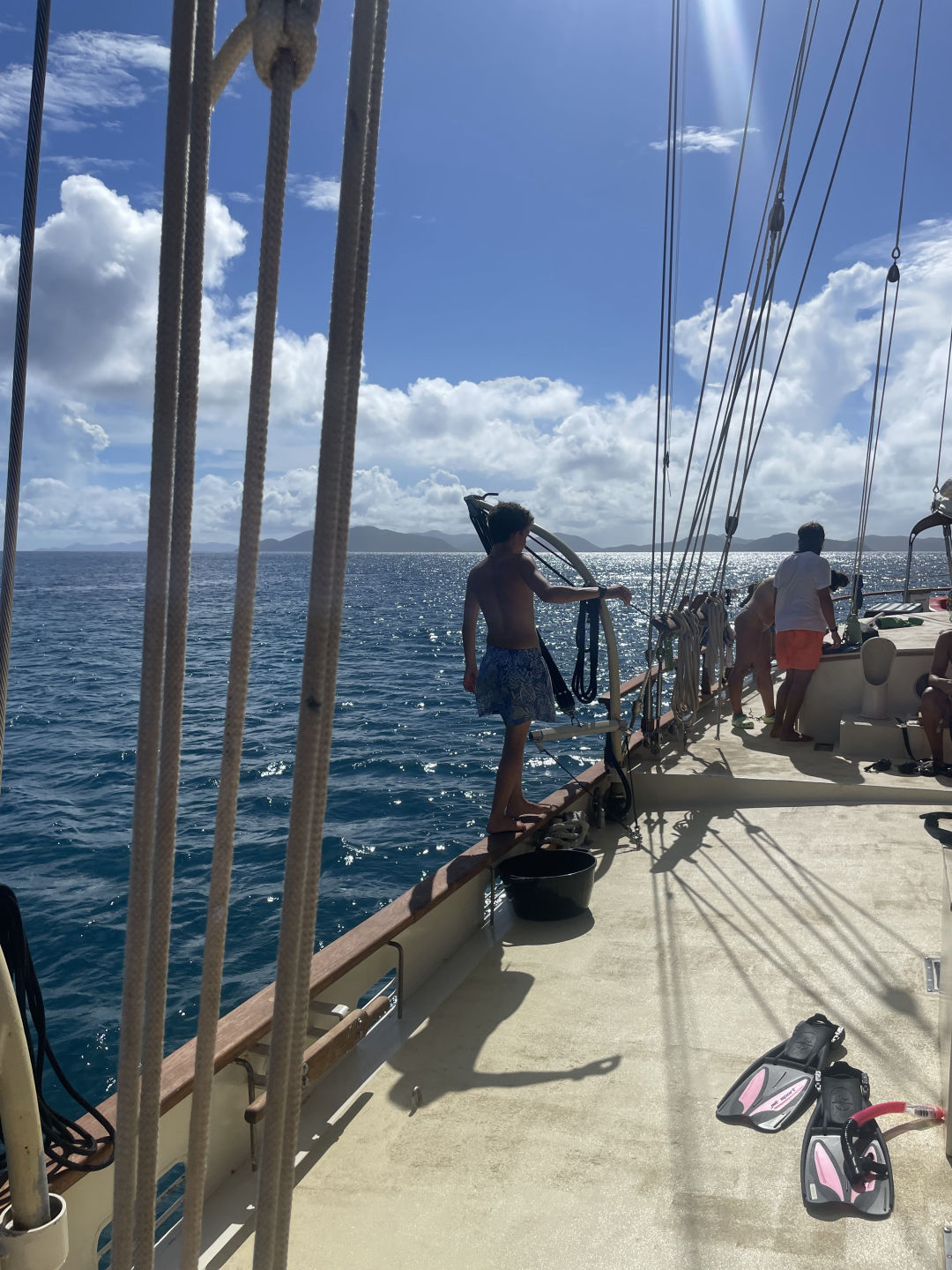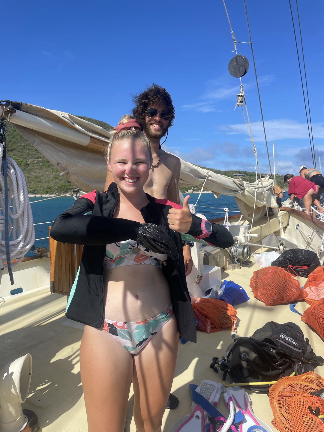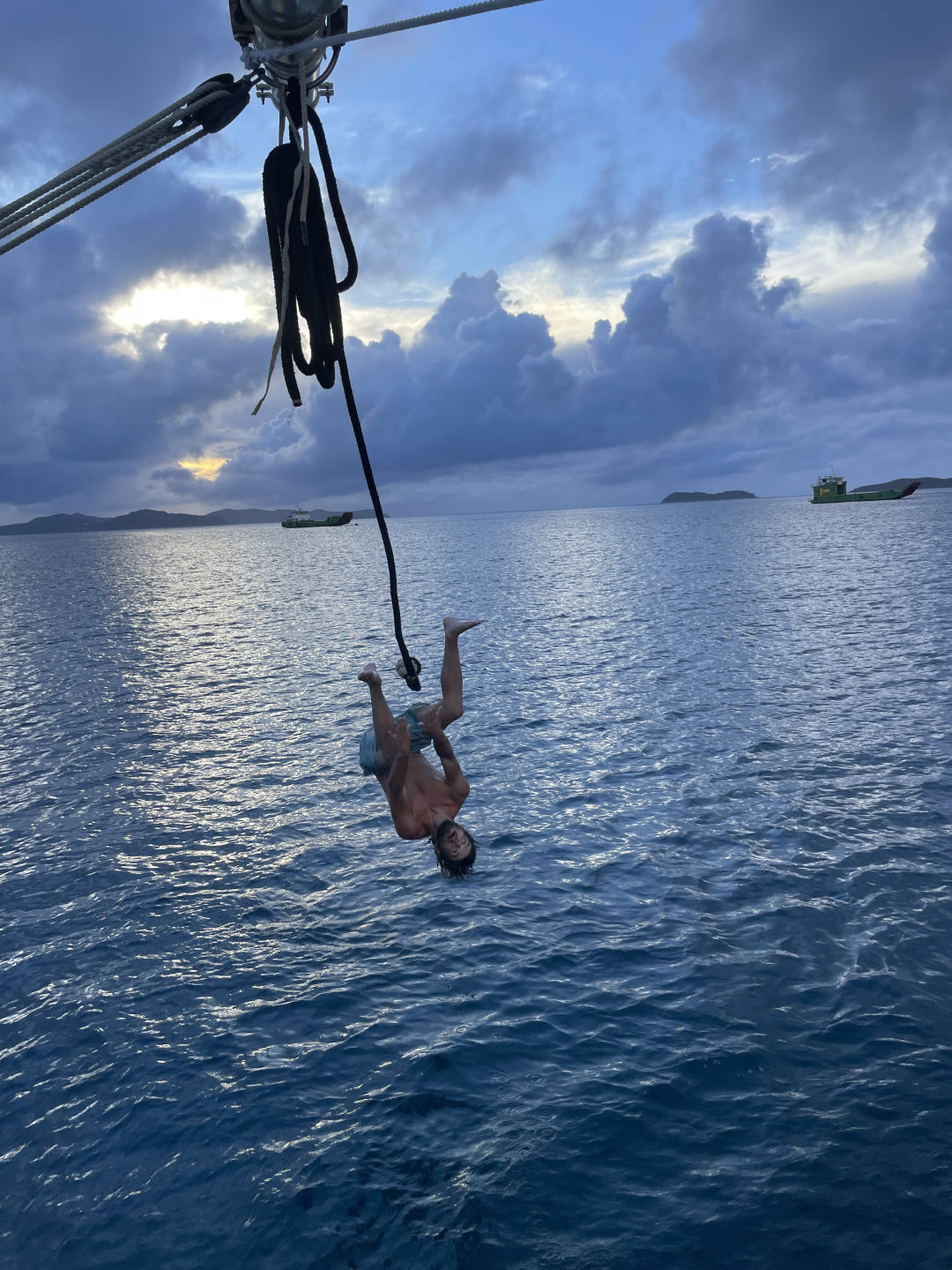Next on the agenda was a much-awaited BOOM SWING!!! Ever since Ray, AJ, and I attempted to build a rope swing off the bow sprit, which Ari promptly broke, I have been eager to attempt the boom swing. Many individuals attempted rope swing backflips, pretty sick, and some rope swing showers, arguably the coolest shower I have ever taken (check the photos for proof that we do indeed bathe ourselves). After one of our fearless leaders, Samantha surfaced from her dive, we convinced her to also attempt the backflip. She warned us that she has not been super successful with the art of rope-swinging in the past, but we convinced her that it was worth a shot, and the worst case scenario is she fails tremendously, and we get some good blog content. In case you are wondering, Sam did, in fact, manage to achieve an upside-down position, followed by a head-first fall into the water below: a good first attempt to say the least.