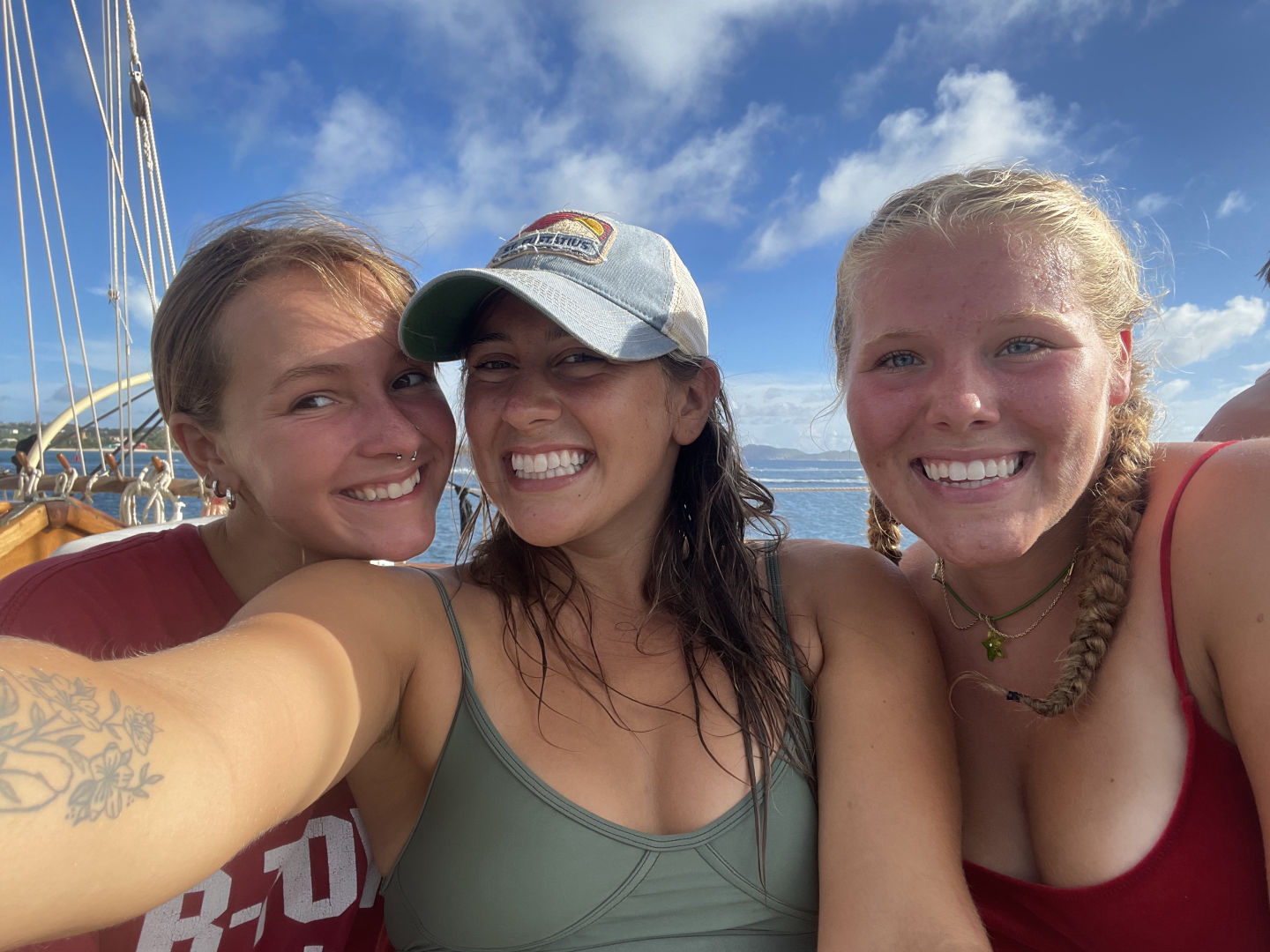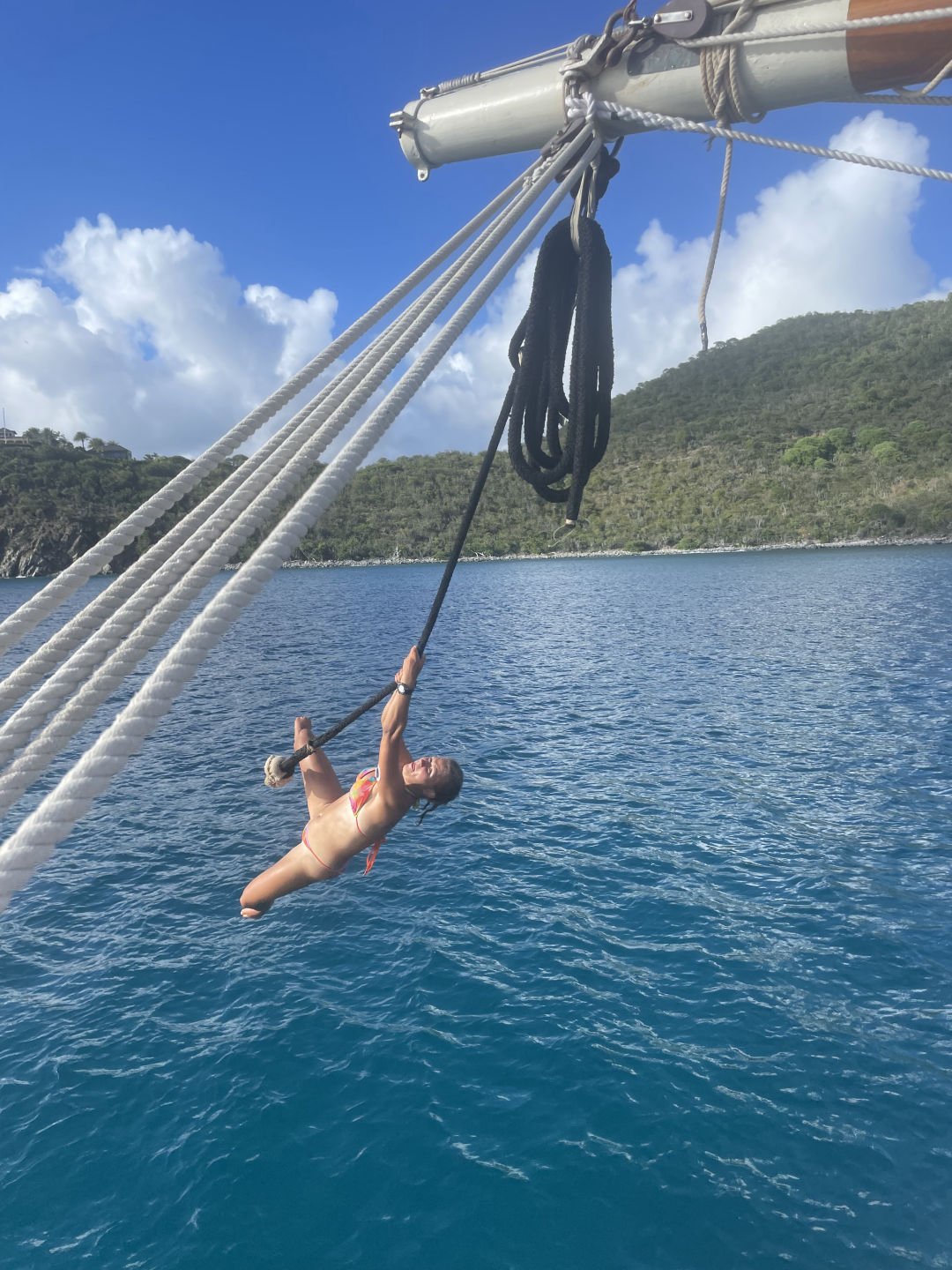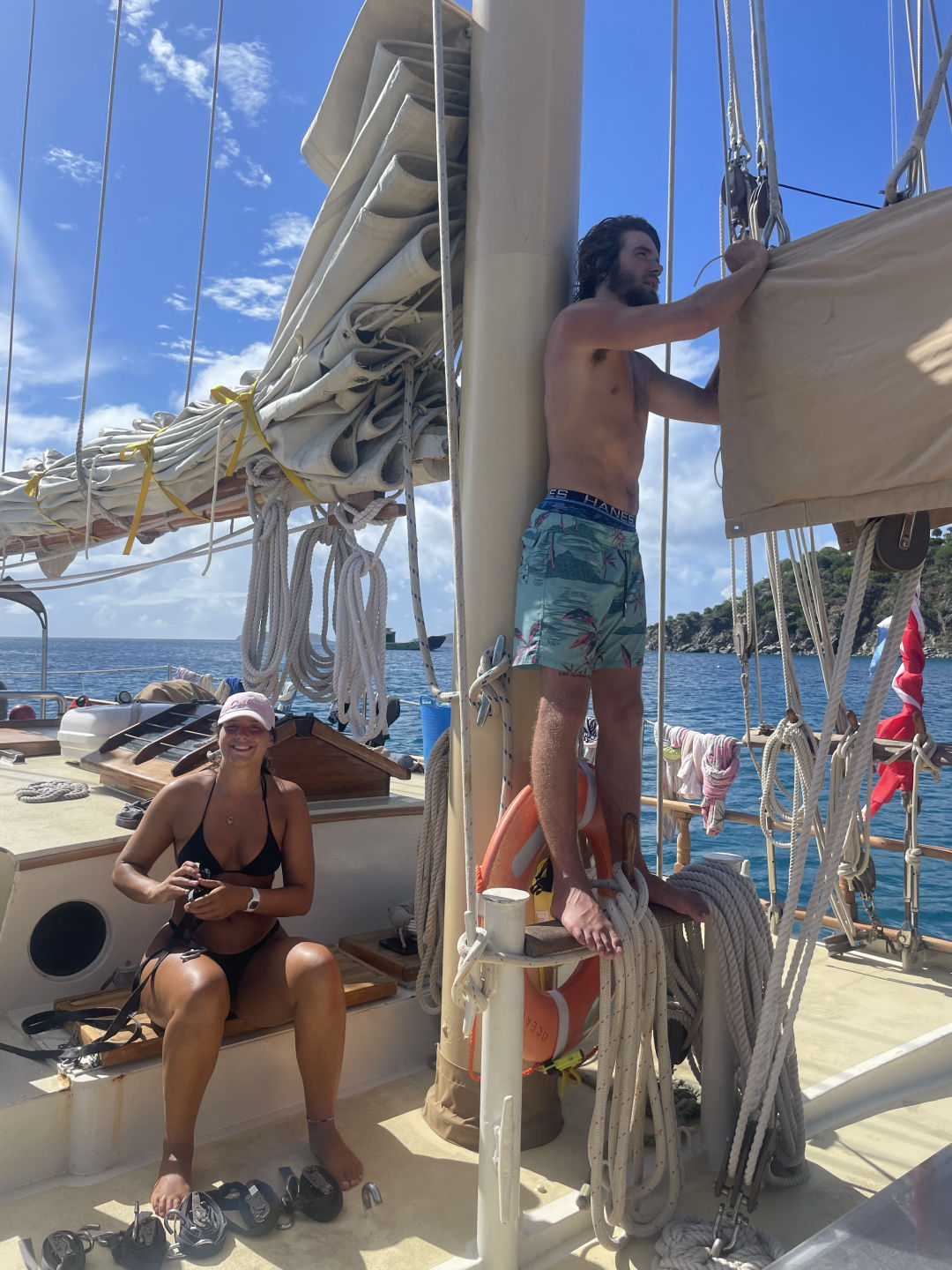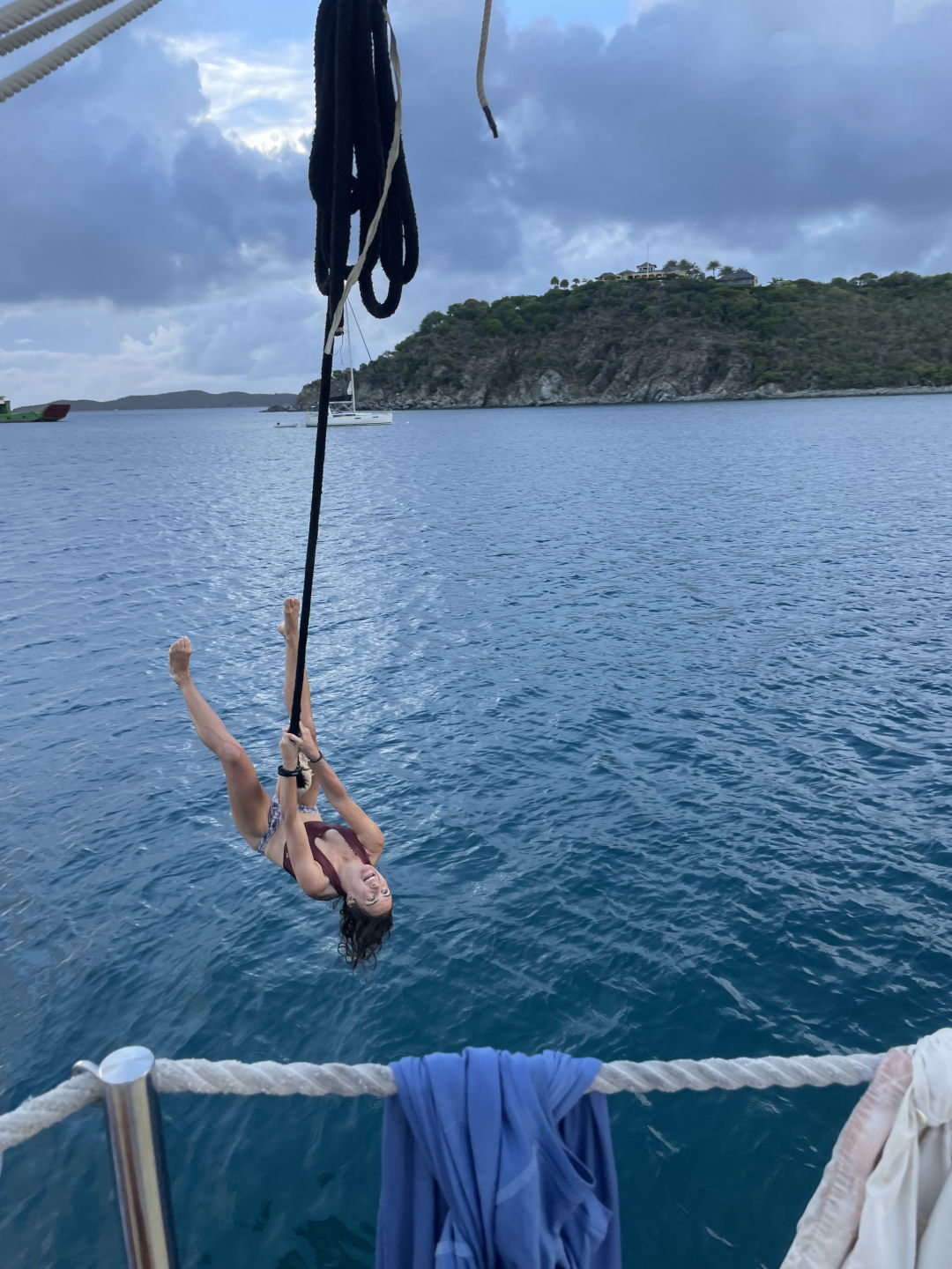 Next on the agenda was a much-awaited BOOM SWING!!! Ever since Ray, AJ, and I attempted to build a rope swing off the bow sprit, which Ari promptly broke, I have been eager to attempt the boom swing. Many individuals attempted rope swing backflips, pretty sick, and some rope swing showers, arguably the coolest shower I have ever taken (check the photos for proof that we do indeed bathe ourselves). After one of our fearless leaders, Samantha surfaced from her dive, we convinced her to also attempt the backflip. She warned us that she has not been super successful with the art of rope-swinging in the past, but we convinced her that it was worth a shot, and the worst case scenario is she fails tremendously, and we get some good blog content. In case you are wondering, Sam did, in fact, manage to achieve an upside-down position, followed by a head-first fall into the water below: a good first attempt to say the least.