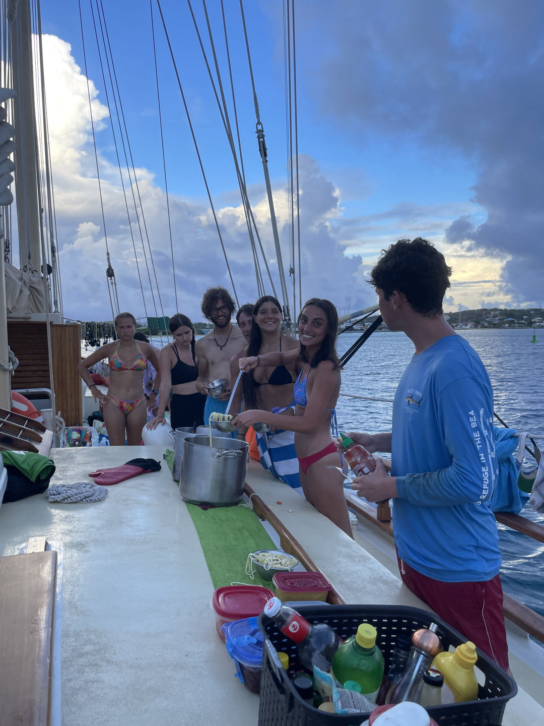 After we had our fill of boom swinging for the evening, it was time for dinner. I hear that the kitchen was competitive tonight, with something dubbed “soup wars” emerging in the galley. Nonetheless, we enjoyed our soup dinner and proceeded to squeeze. Unfortunately, we had to postpone our much-awaited boat prom/toga rave until tomorrow night as we have our two-hour-long nav master exams tomorrow. We decided it was best to study tonight instead. Good thing we postponed because following my squeeze question of “What do you like most about yourself” a squall was upon us! We quickly managed to get the provisions into the saloon with minimal injuries, as it was raining cats and dogs. Unfortunately, some premium corn (aka creamed corn) was thrown onto Sam’s legs! Oops, sorry, Sam. Hope you forgive me because I taught you how to backflip off the boom swing. That’s all for now. Wish your favorite crew luck on our nav master exams tomorrow, and stay posted for some banging boat prom content!