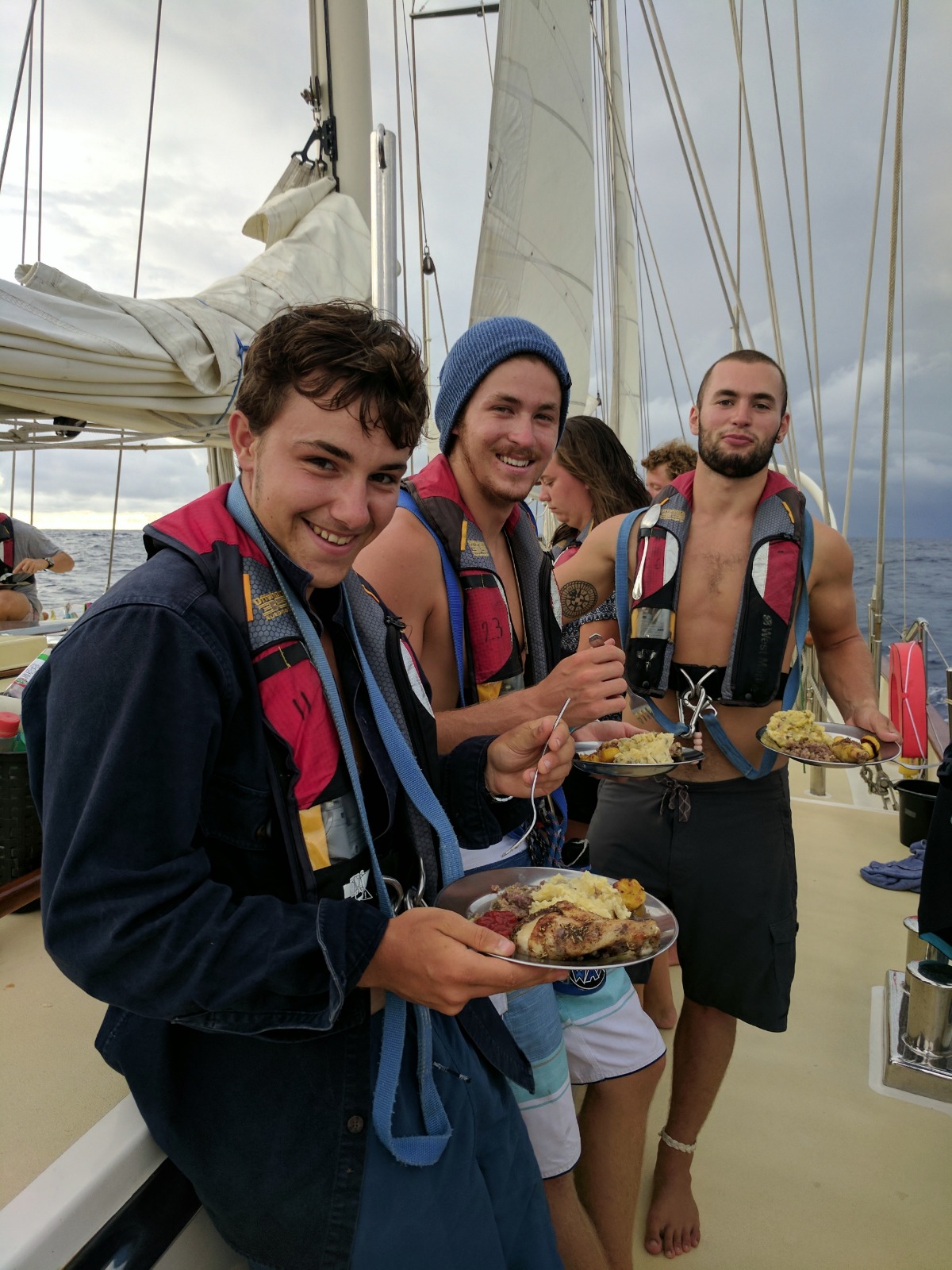 As I stood in the cockpit getting pelted by rain, I looked up at Sahil, who was holding us steady into the wind so we could make a sail change (and finish doing dishes in relative comfort). “How are you doing?” I asked.