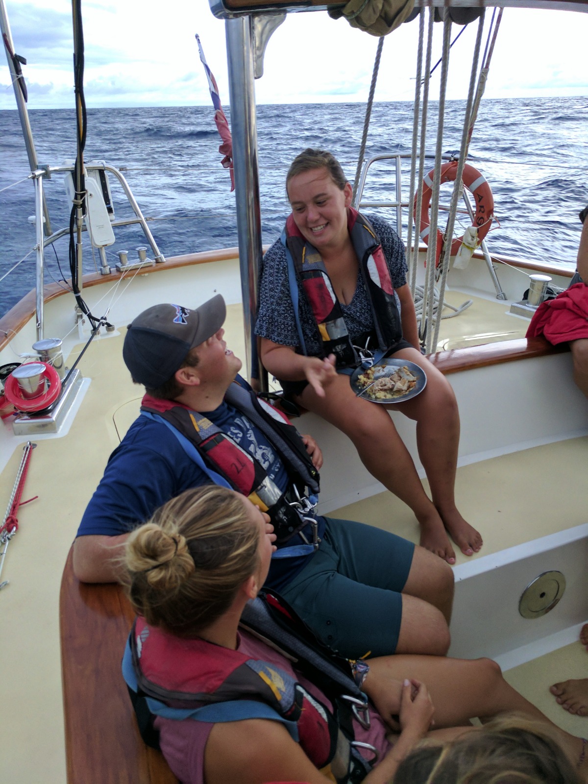 After a night of watches, we came together at noon for a pasta lunch with freshly made garlic bread. The day passed quickly between OCE and SLS class, saltwater deck showers, and a final few frenetic hours of studying and working on assignments. A calendar went up yesterday that shows us all of the assignments that are due between now and the end of the semester, and it’s crazy to see how quickly everything is going to wrap up and come to an end. It makes me grateful for every sweaty moment in the galley, every cup of coffee enjoyed under the stars, every evening spent chatting with the cockpit watch while Argo continues westward towards French Polynesia.