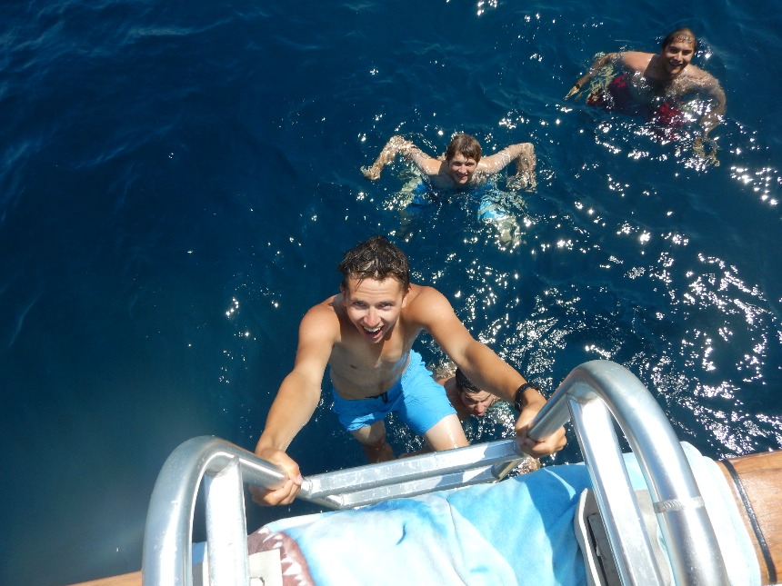 By noon, we were here. Watch Team One brought us in. They flaked our sails and started rinsing the deck. After lunch, the rest of the crew helped finish rinsing Argo’s salt-encrusted hull and deck before an afternoon of free time. Some of the shipmates continued studying for their Navigation Master Exams, while others spent their time jumping off Argo and into the deep blue of the sea. Since we are still waiting to be checked into Palma, today’s activities were all about catching up and relaxation on Argo. Tomorrow will be our larger “BA” (Boat Appreciation) day, where we will clean up Argo from top to bottom and seriously put her in “ship-shape.”