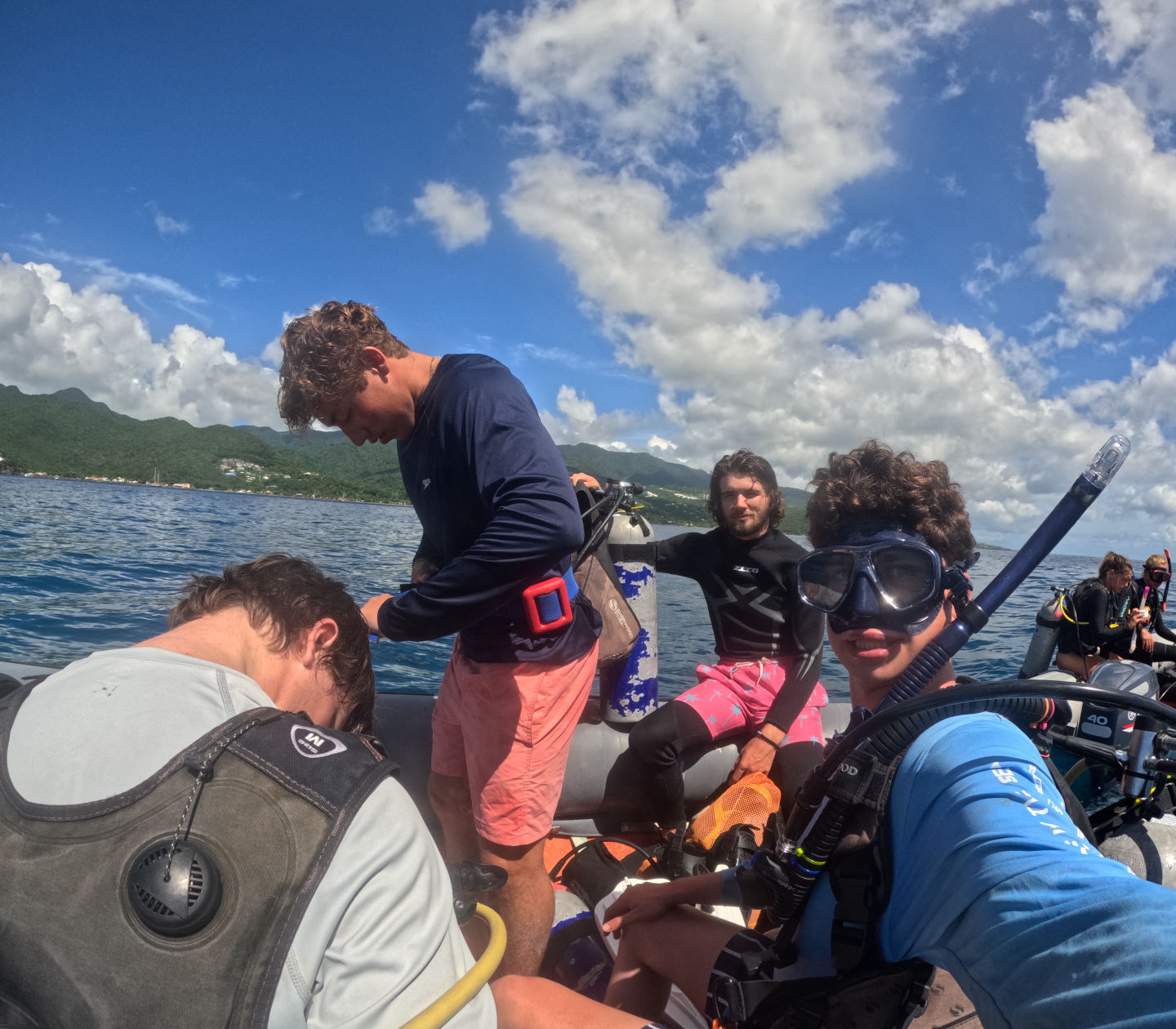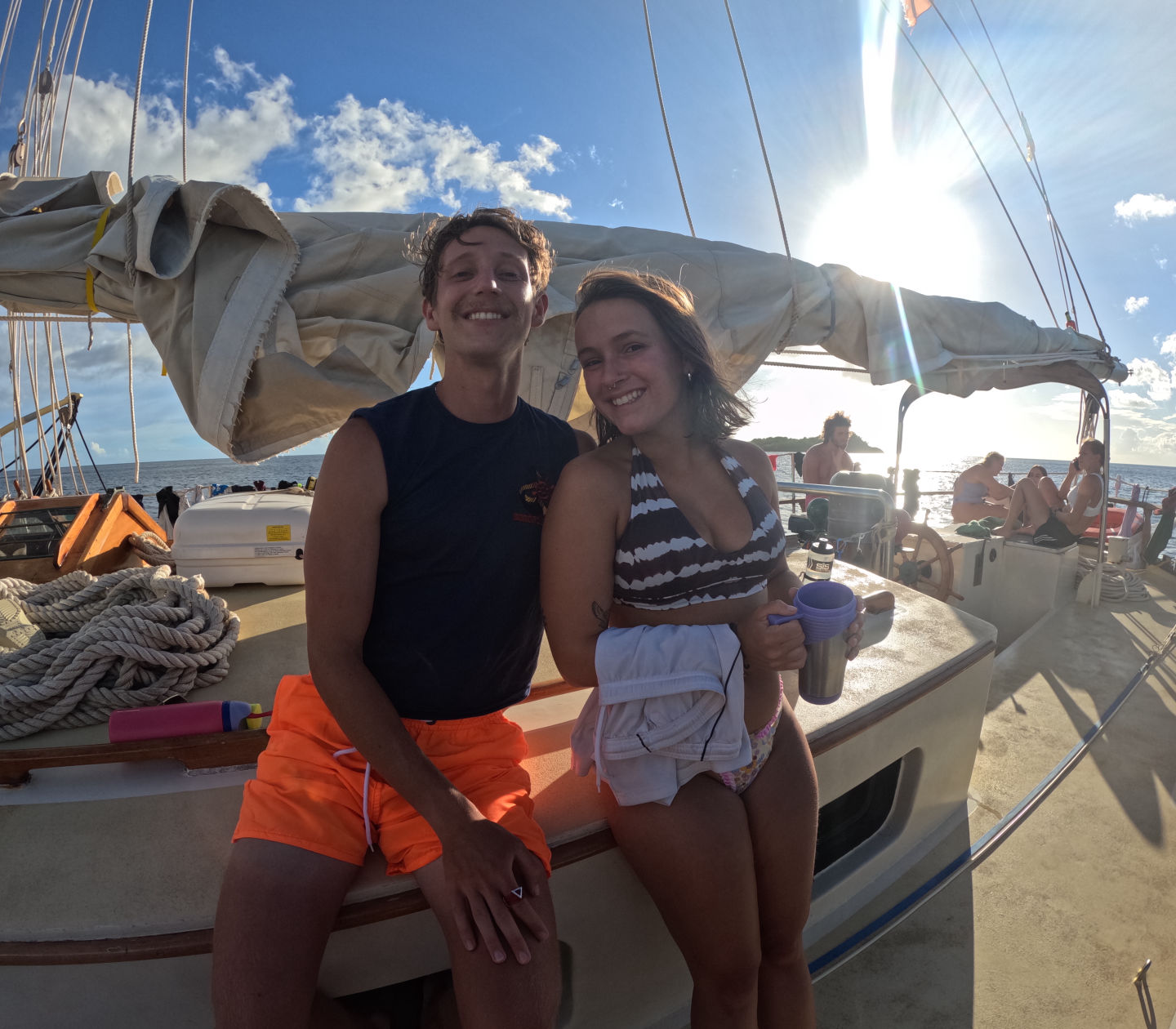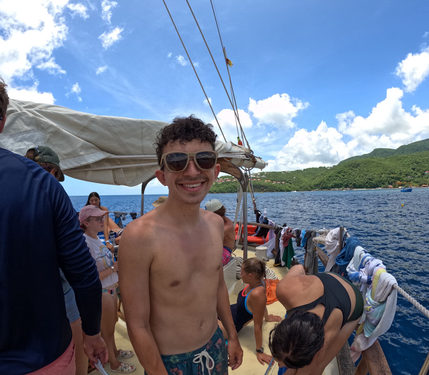 Jostled awake either by the rocking of the boat or the sound of fellow crew-mates moving about the saloon, everyone awoke before I had the chance to myself. The morning was a slow start, and the rest of the day would prove to follow a similar pattern. After a breakfast haunted by the ghastly French sausage, everyone filtered into the saloon for Oceanography, where we learned how the wind and water density move the tides across the globe. Shortly after, we got a demonstration of this effect as anyone who jumped in the ocean to cool off after class faced the incoming shore tide and had to fight to reach the ladder and return aboard. After a refreshing dip, we began to prepare for passage to our next destination. With sail covers removed, sheets run, and lifelines mostly cleared of any drying clothes, we completed our passage prep. By the time we had finished, the sun was high in the sky, and there was little shade left to protect us from her scorching rays. Hastily lunch was delivered to the deck, bowls of pasta salad came and went, and just after a short clean-up, the crew was ready to dive! I was set to dive with the second group, so while the first group went off to explore beautiful reefs, the others stayed behind, and I caught up on some much-needed RnR, sitting in the air-conditioned saloon snacking on fruit left over from our time in Dominica and open jars of Nutella with spoons we regained the energy the hot sun had taken from us. Not long after our snack break, the sound of our dingy Irv could be heard fast approaching, and we knew it was our time to kit up and get in the water. The dive was nothing short of magical; even before we descended, fish were swarming around our fins. My group conducted data collection, noting the biodiversity, water temperature, and salinity. After collecting our data, the rest of the dive was ours to enjoy. The reef was full of vibrant fish and coral that made you feel like you were in another world. coming up from our dive and arriving back on Ocean Star, my group was greeted with the smell of dinner, and it did not disappoint. We ended the day with one of the best sunsets I’ve seen so far and the rare but always satisfying dessert. Tomorrow holds the promise of our second overnight passage, and I, for one, cannot wait.