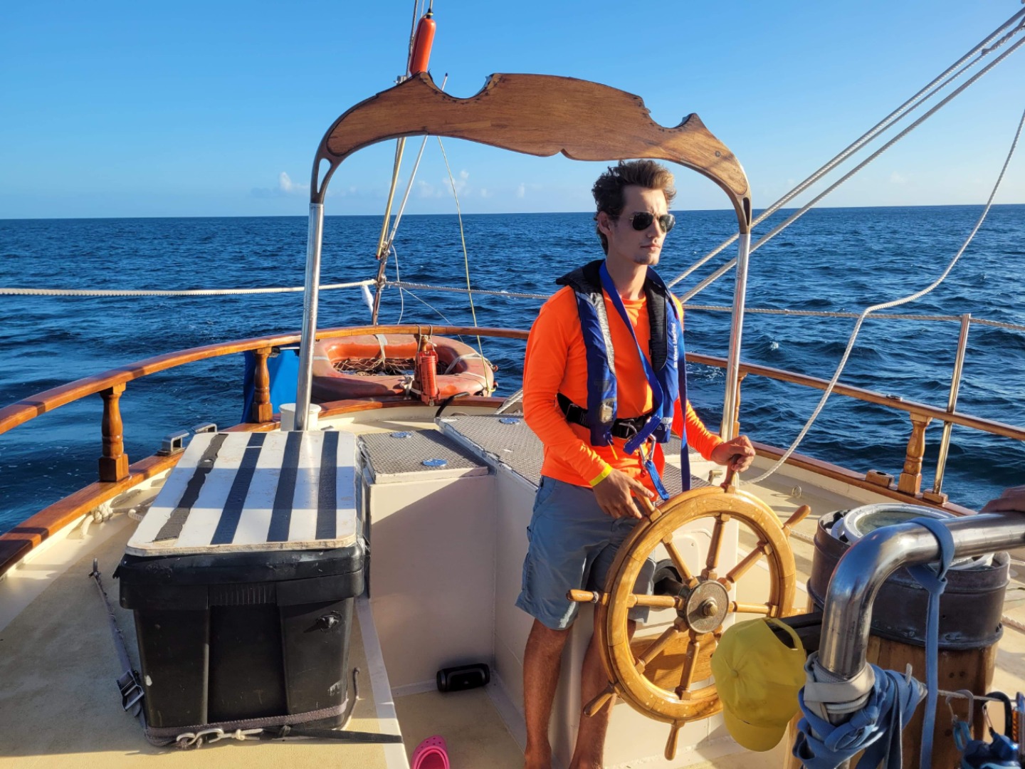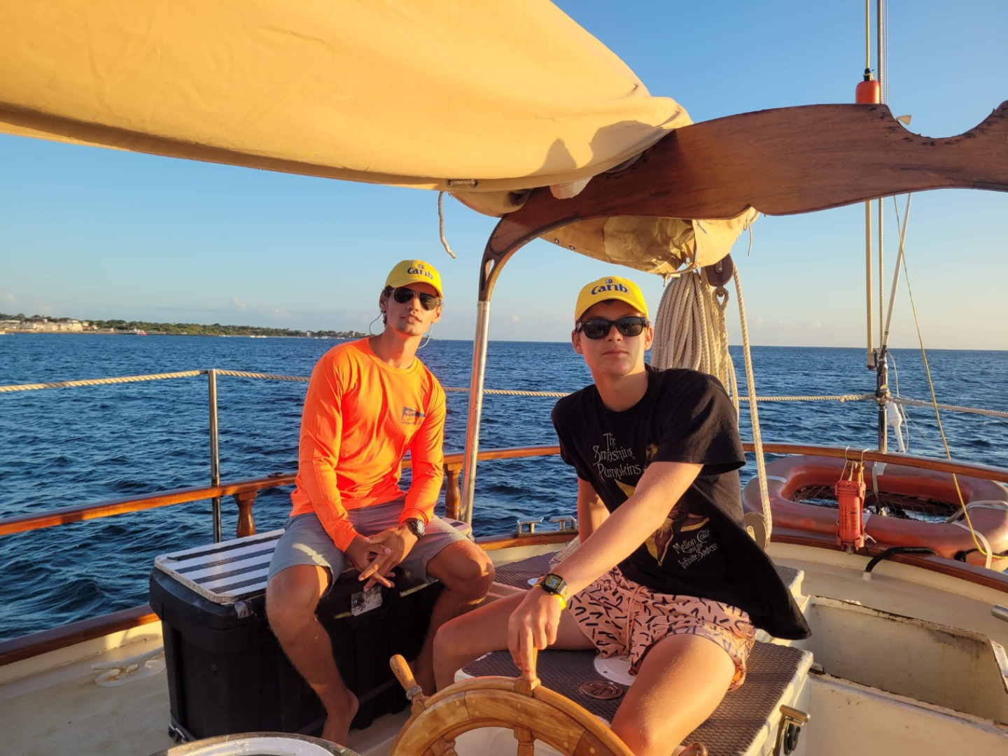 After that experience, we got the sails up and began to goose wing. Everything was good. The water was calm, there was a nice breeze, and O Star was cruising along until the foresail ripped! And as it did, a shiny object came flying back around, an object that Alex caught instinctively. Alex glance at the object, and his eyes go wide as he stares at his own personal boomerang – it has his name on it in all caps. Alex panics a throws it out again, but it returns because that’s how a boomerang works. Alex ducks, and the boomerang hits Brett – sending him tragically overboard. Oh, don’t worry too much. He had on his traffic cone highlighter shirt today, so he’d. be easy to spot for any passing boats.